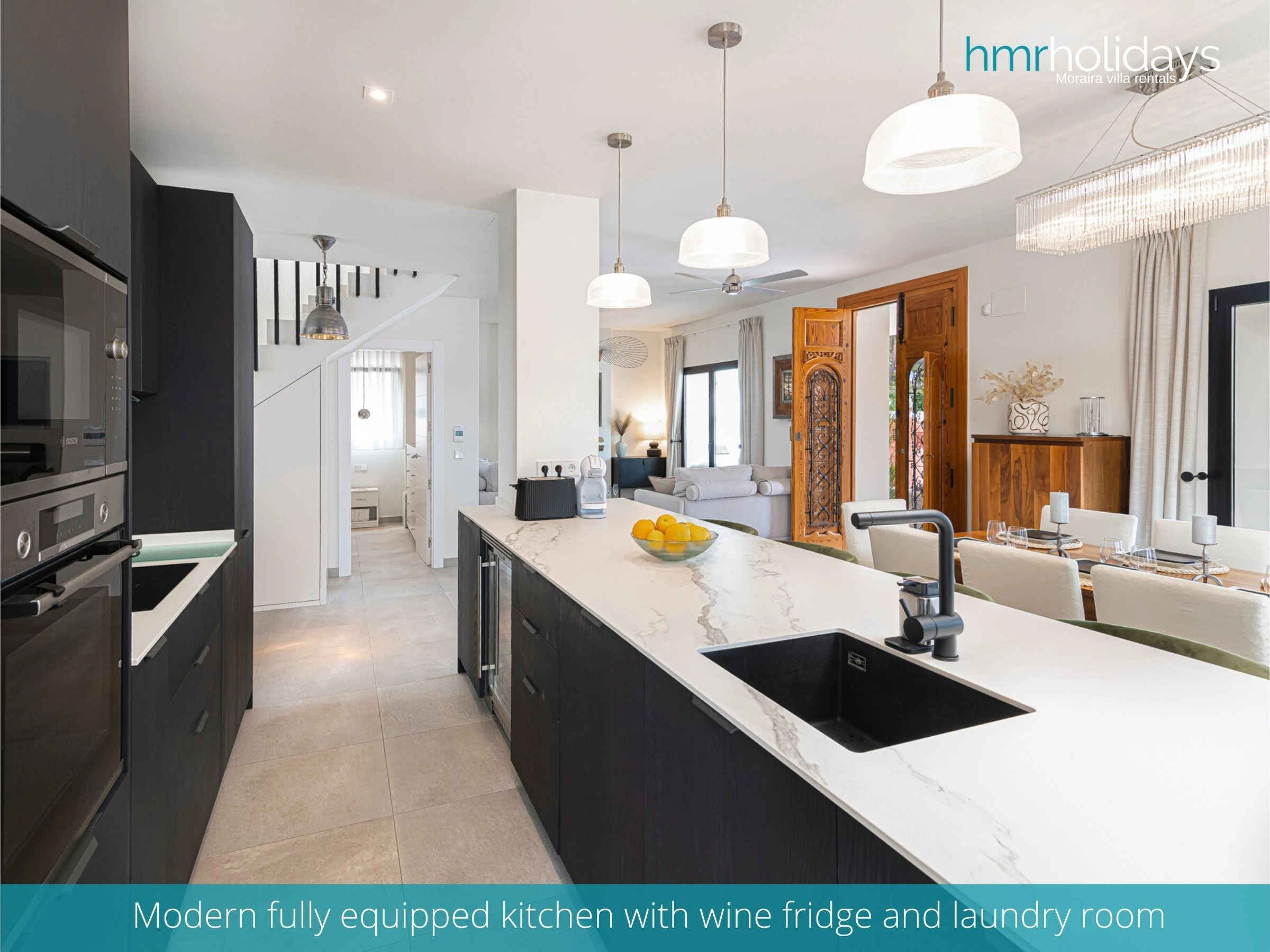 Dieses offene küche, mit induktions-kochfeld, ist ausgestattet in kühlschrank, mikrowelle, backofen, gefrierschrank, spülmaschine, geschirr/besteck, kochutensilien, kaffeemaschine, toaster und wasserkocher.