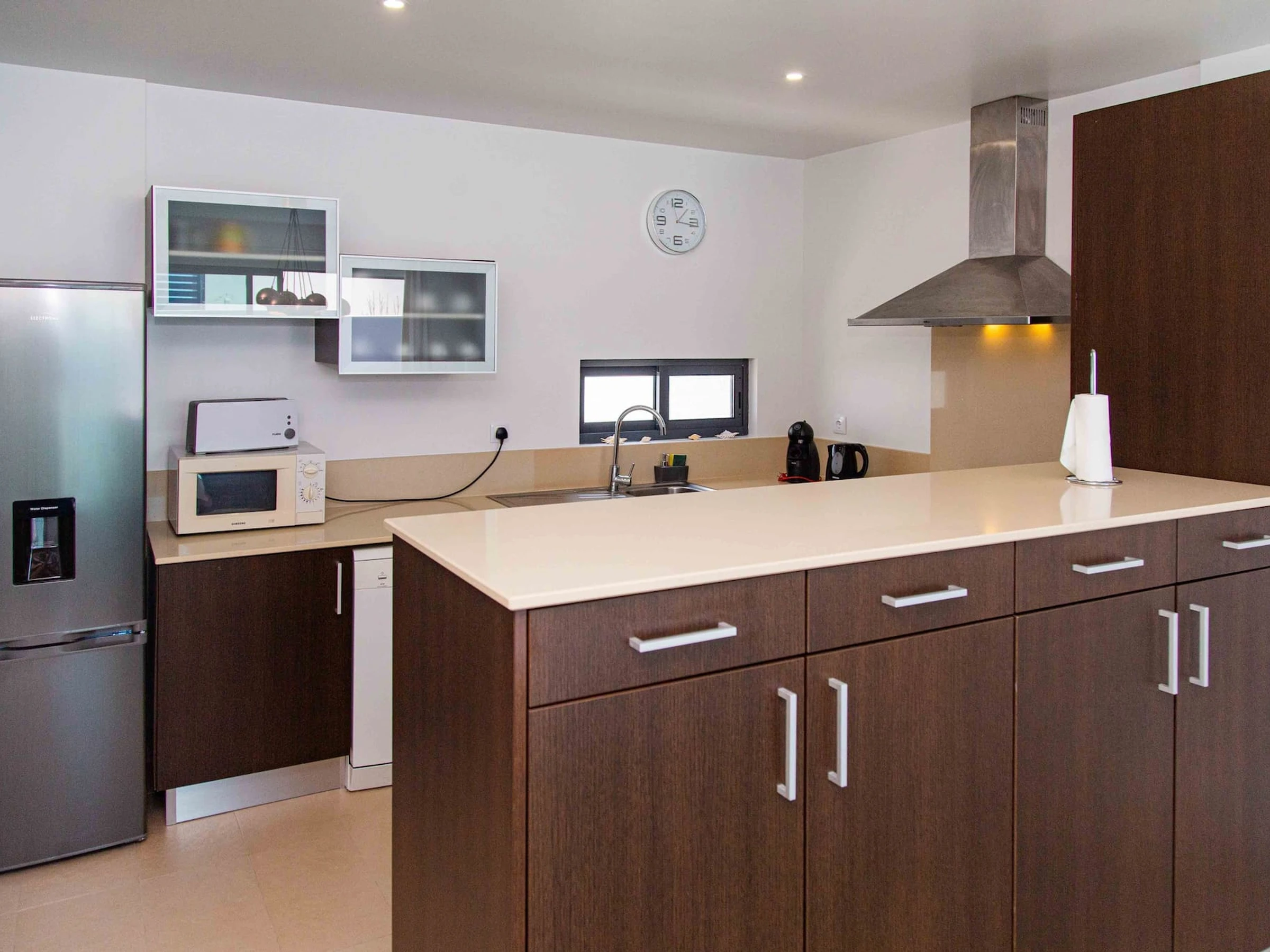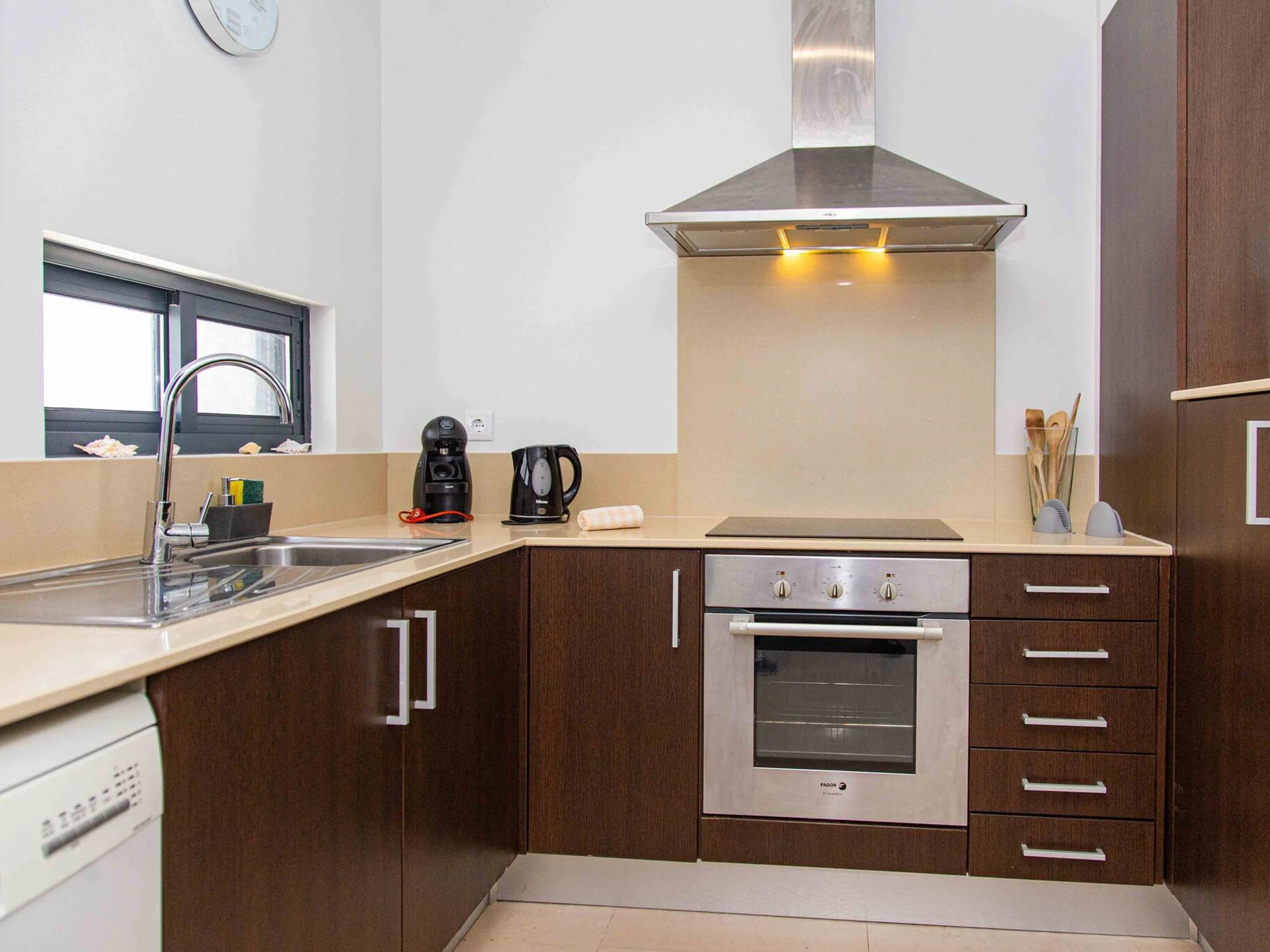 Dieses küche, mit ceranfeld, ist ausgestattet in kühlschrank, mikrowelle, backofen, gefrierschrank, spülmaschine, geschirr/besteck, kochutensilien, kaffeemaschine, toaster und wasserkocher.