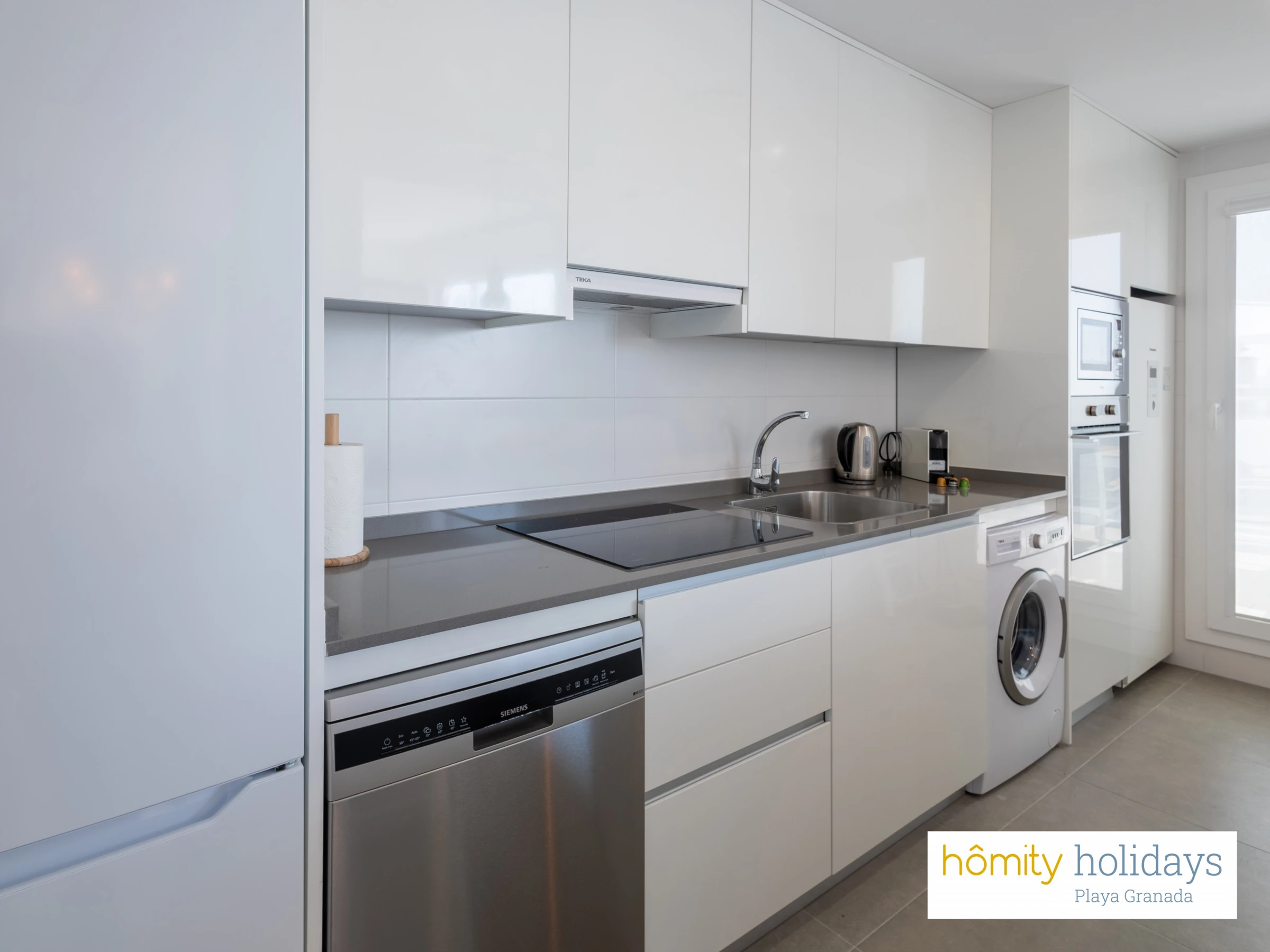 Dieses offene küche, mit induktions-kochfeld, ist ausgestattet in kühlschrank, mikrowelle, backofen, gefrierschrank, spülmaschine, geschirr/besteck, kochutensilien, kaffeemaschine, toaster, wasserkocher und saftpresse.