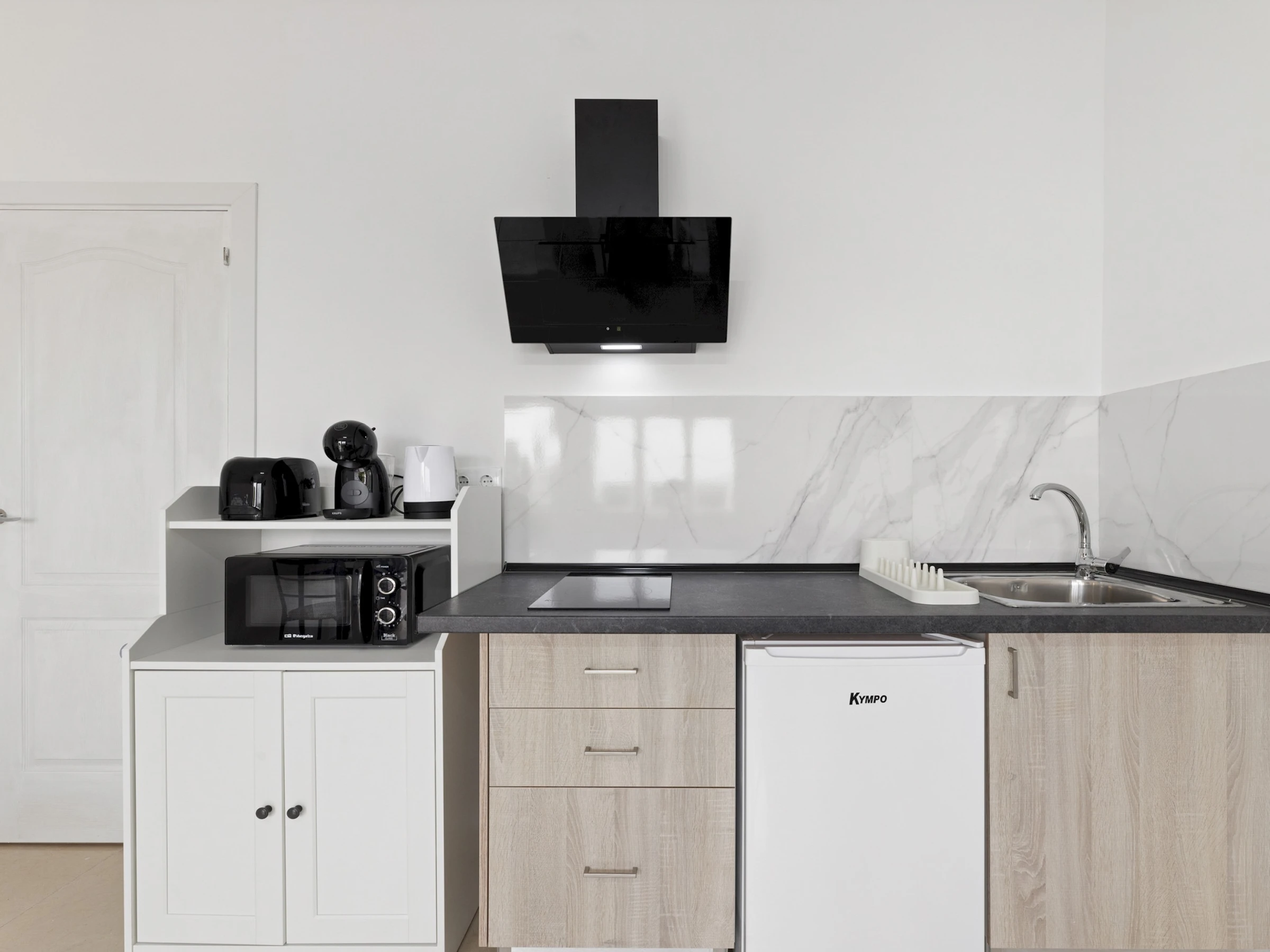 Dieses küche, ist ausgestattet in mikrowelle, kochutensilien, kaffeemaschine und toaster.
