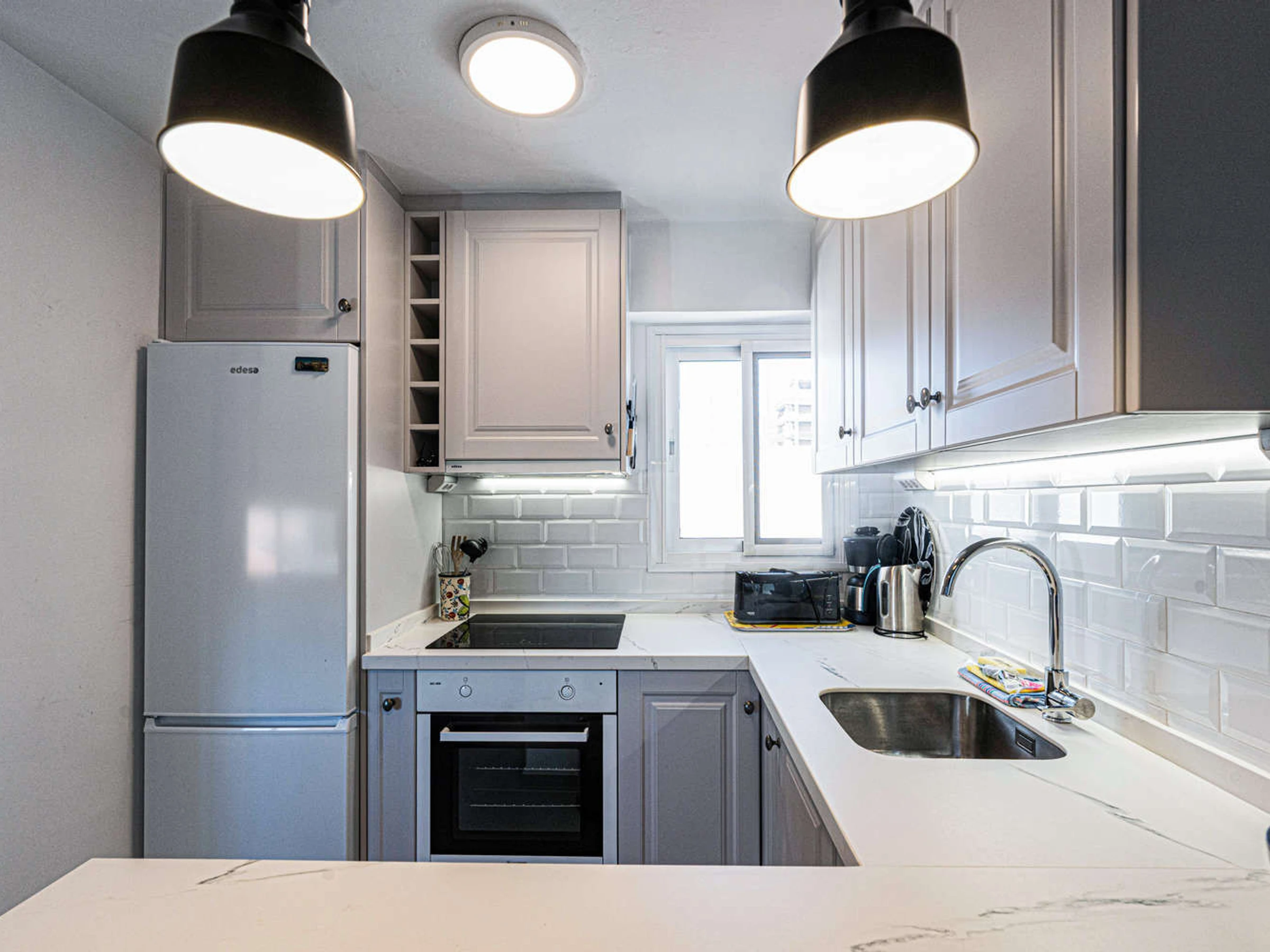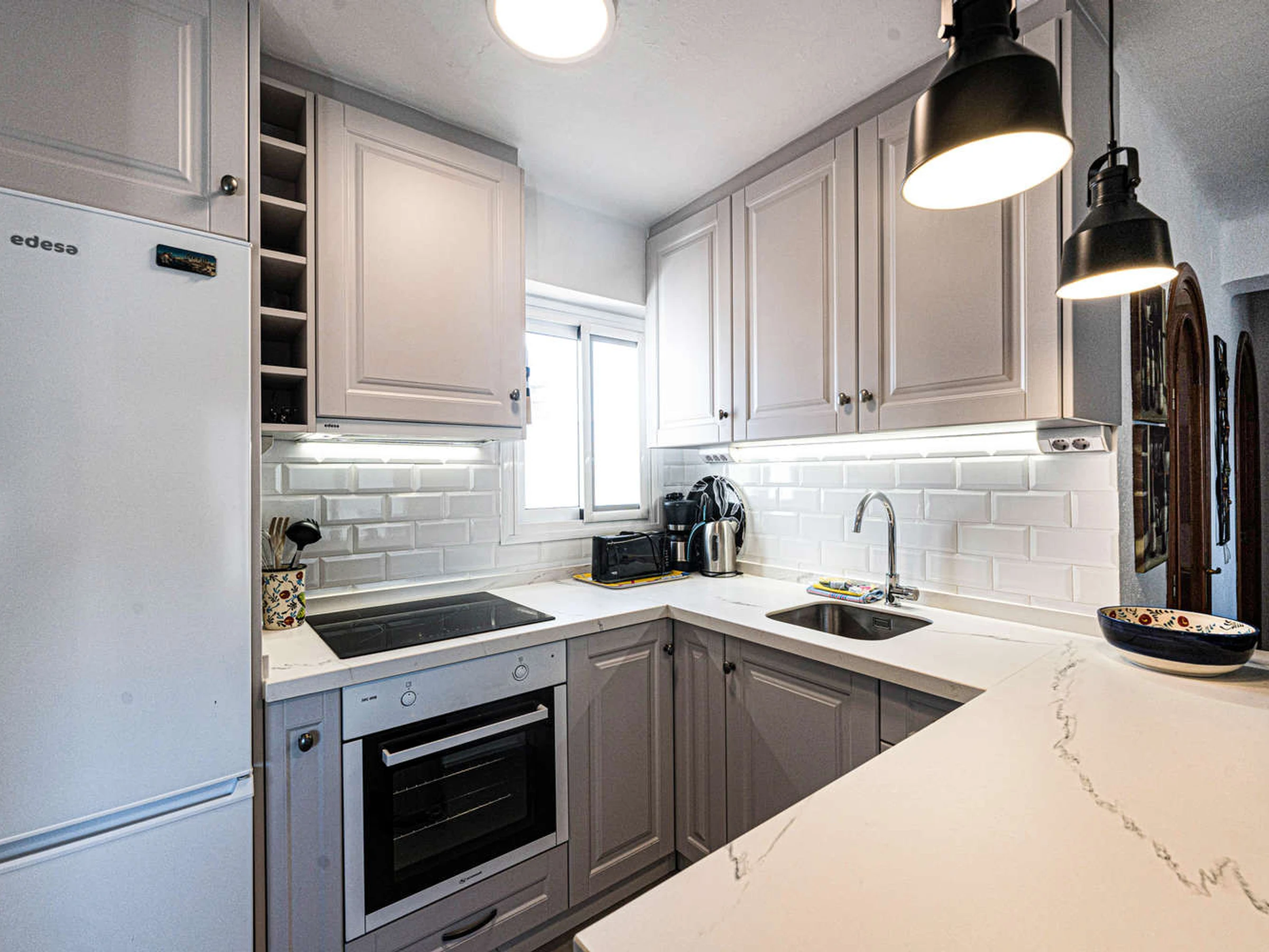 Die Offene Küche mit Ceranfeld ist ausgestattet in einen Kühlschrank, eine Mikrowelle, ein Backofen, Gefrierschrank, eine Waschmaschine, eine Spülmaschine, Geschirr/Besteck, eine Kaffeemaschine, einen Toaster und einen Wasserkocher.
