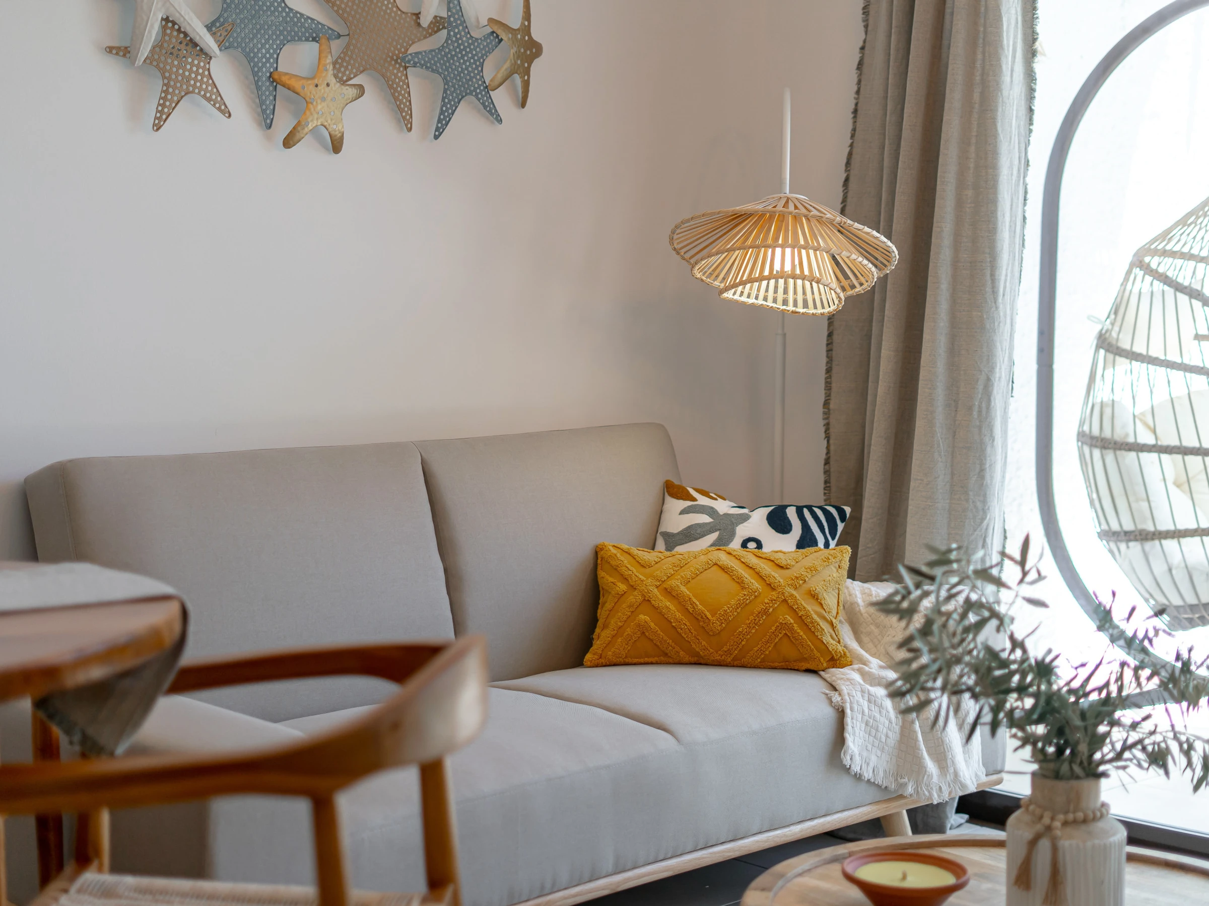 Das Wohnzimmer ist ein gemütlicher Rückzugsort, der mit einem Sofa, einem Sessel und einem Smart TV für deine Freizeit ausgestattet ist. Außerdem hast du High-Speed-Internet, damit du während deines Aufenthalts immer in Verbindung bleibst.