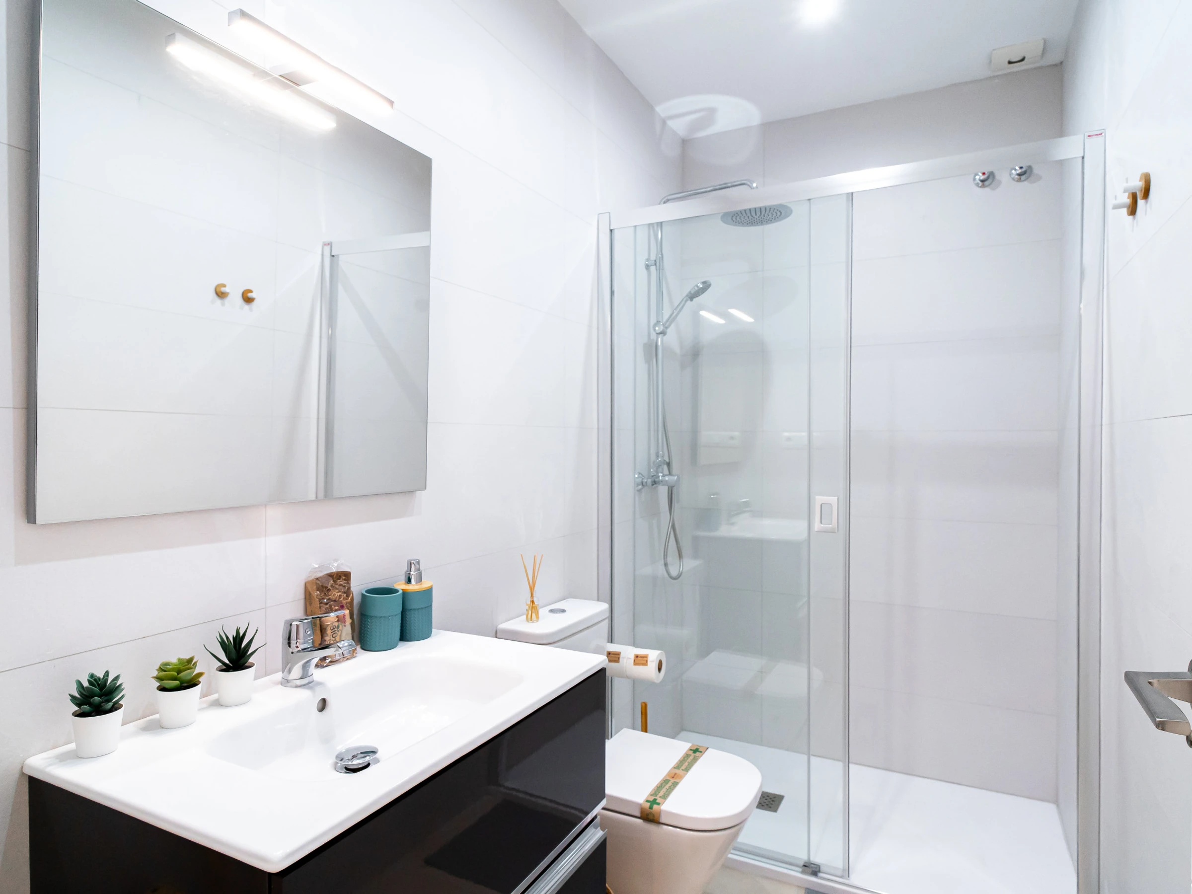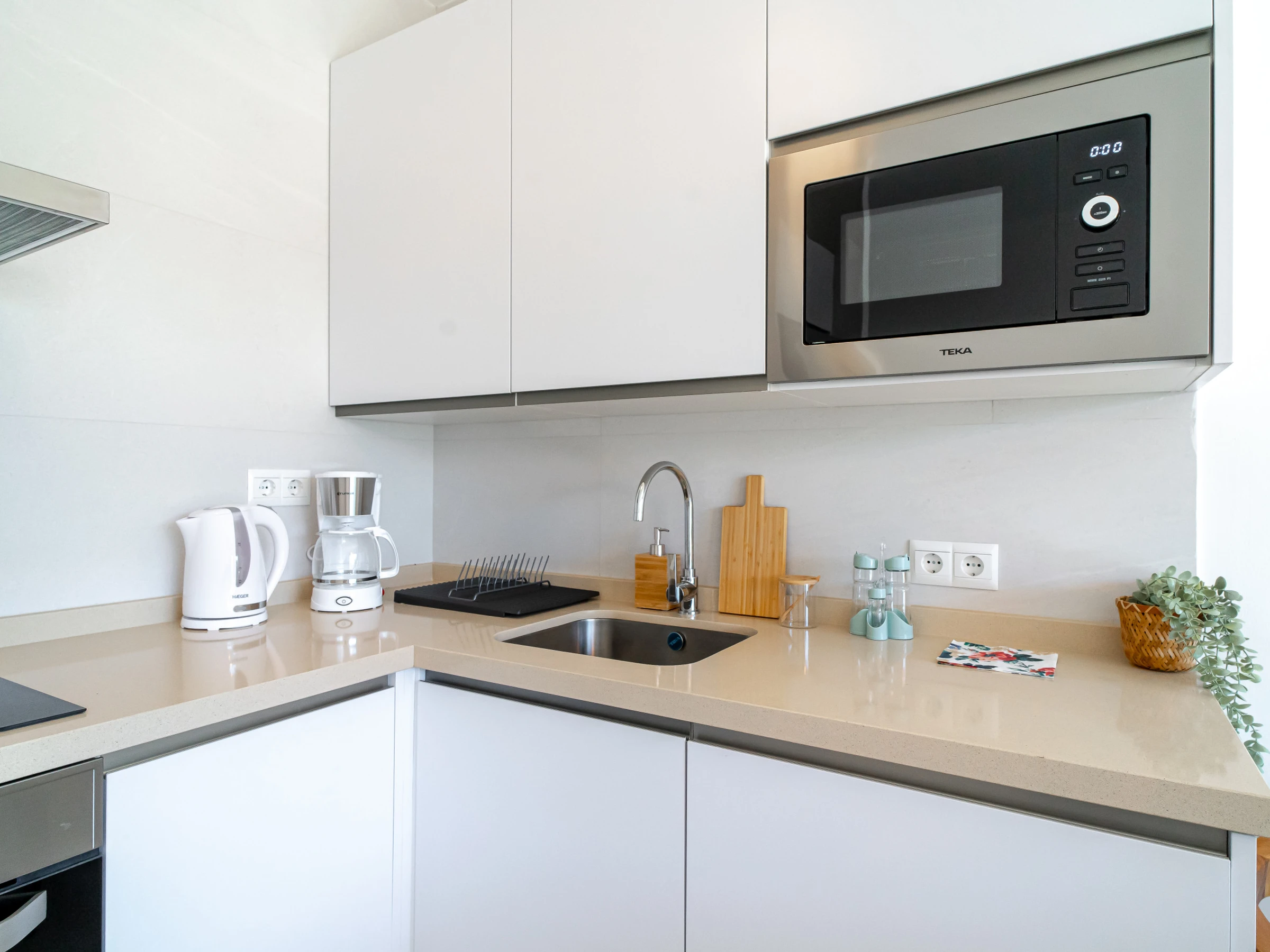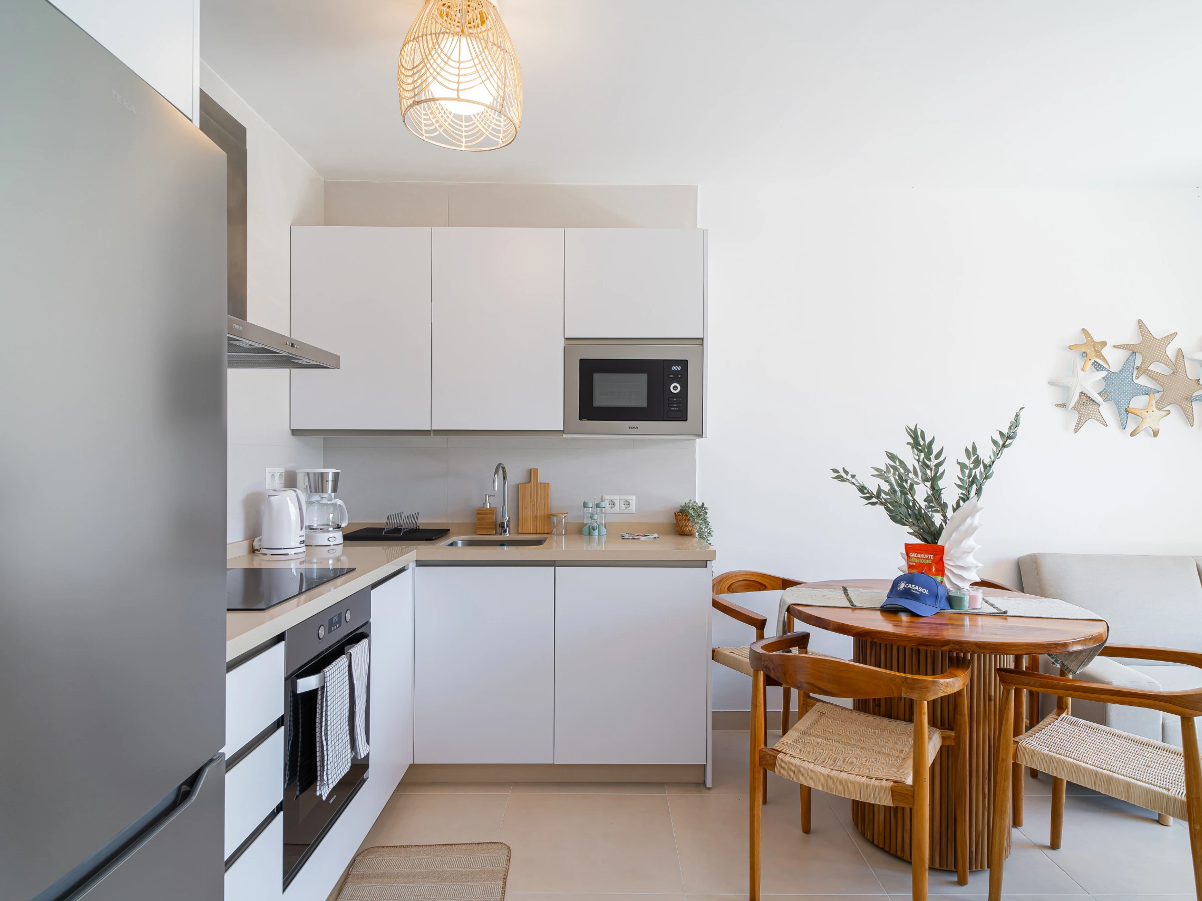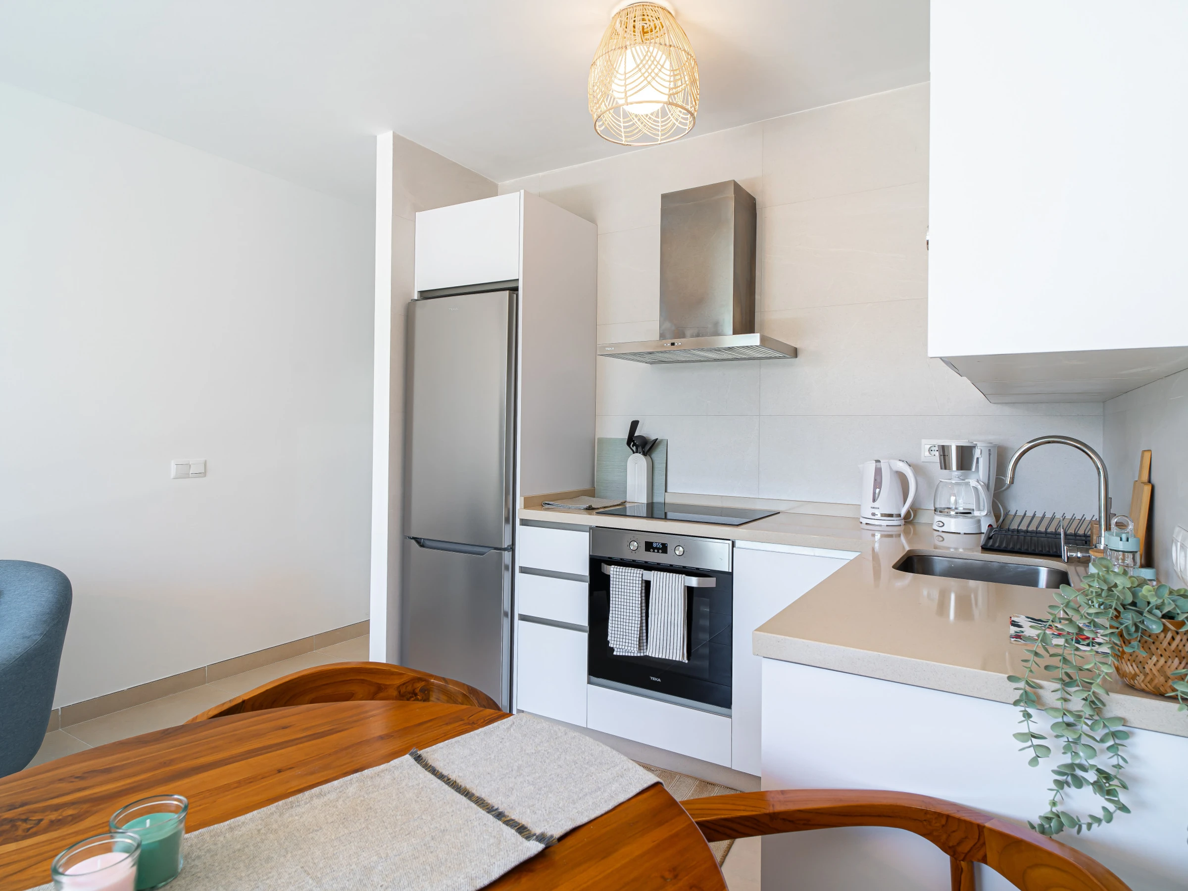 Die Wohnung verfügt über ein modernes Badezimmer mit einer stilvollen Dusche, in der du deinen Tag erfrischend beginnen oder beenden kannst. Die Küche ist mit modernsten Geräten ausgestattet, so dass du vom schnellen Frühstück bis zum Gourmet-Abendessen alles zubereiten kannst.