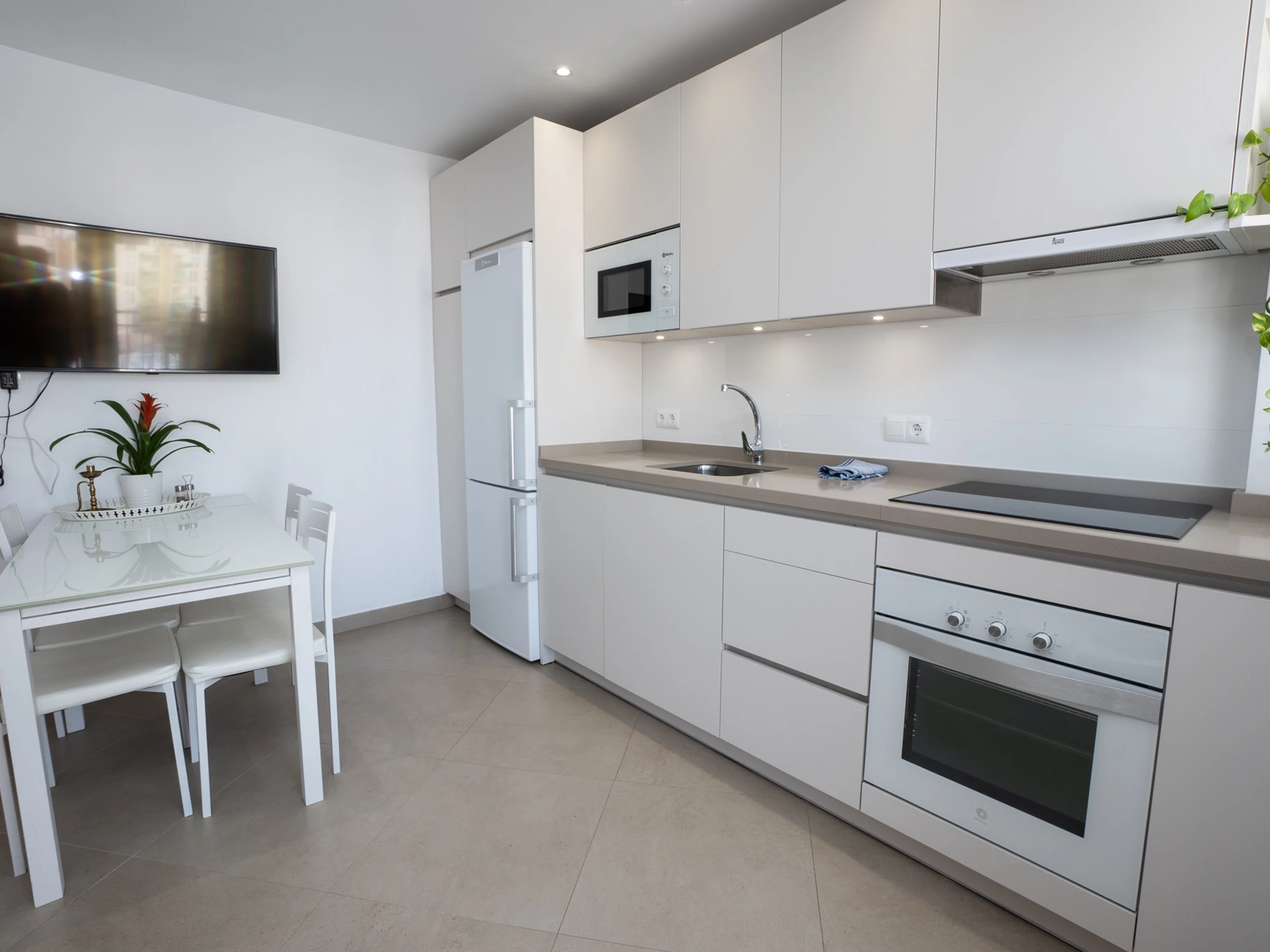 Die Offene Küche mit elektrisches Kochfeld ist ausgestattet in einen Kühlschrank, eine Mikrowelle, ein Backofen, einen Gefrierschrank, eine Waschmaschine, eine Spülmaschine, Geschirr/Besteck, Kochutensilien, eine Kaffeemaschine, einen Toaster, einen Wasserkocher und eine Saftpresse.