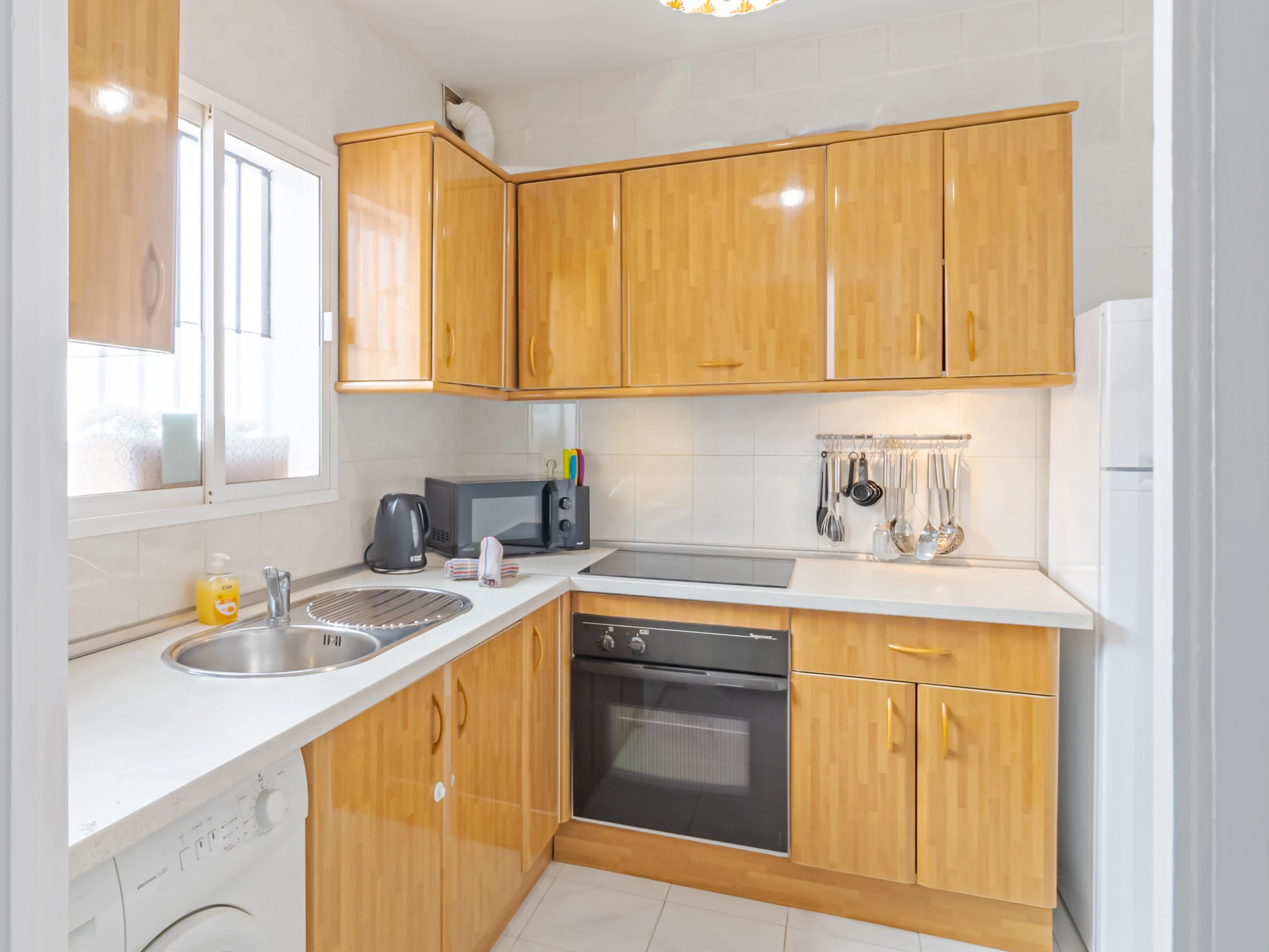 Dieses küche, ist ausgestattet in kühlschrank, backofen, gefrierschrank, geschirr/besteck und kochutensilien.