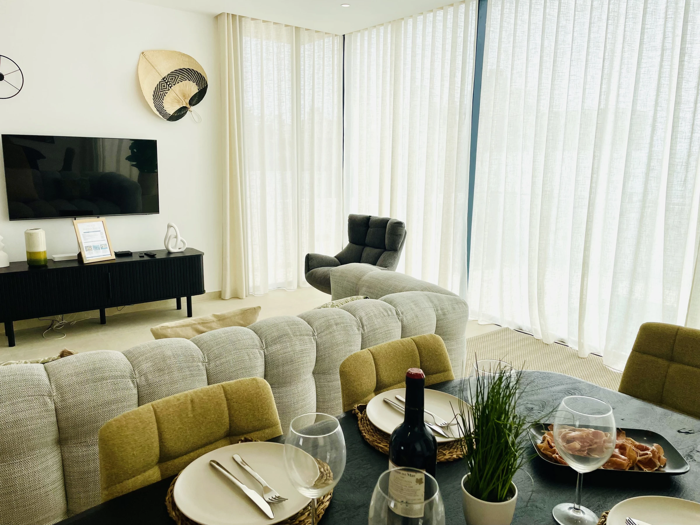 Im Hauptgeschoss gibt es eine voll ausgestattete offene Küche, ein Gäste-WC und ein großzügiges, verglastes Wohnzimmer mit direktem Zugang zum Pool. Der Wohnbereich verfügt über einen TV (internationale Sender) und einen stilvollen Essbereich mit Blick auf den Außenbereich.