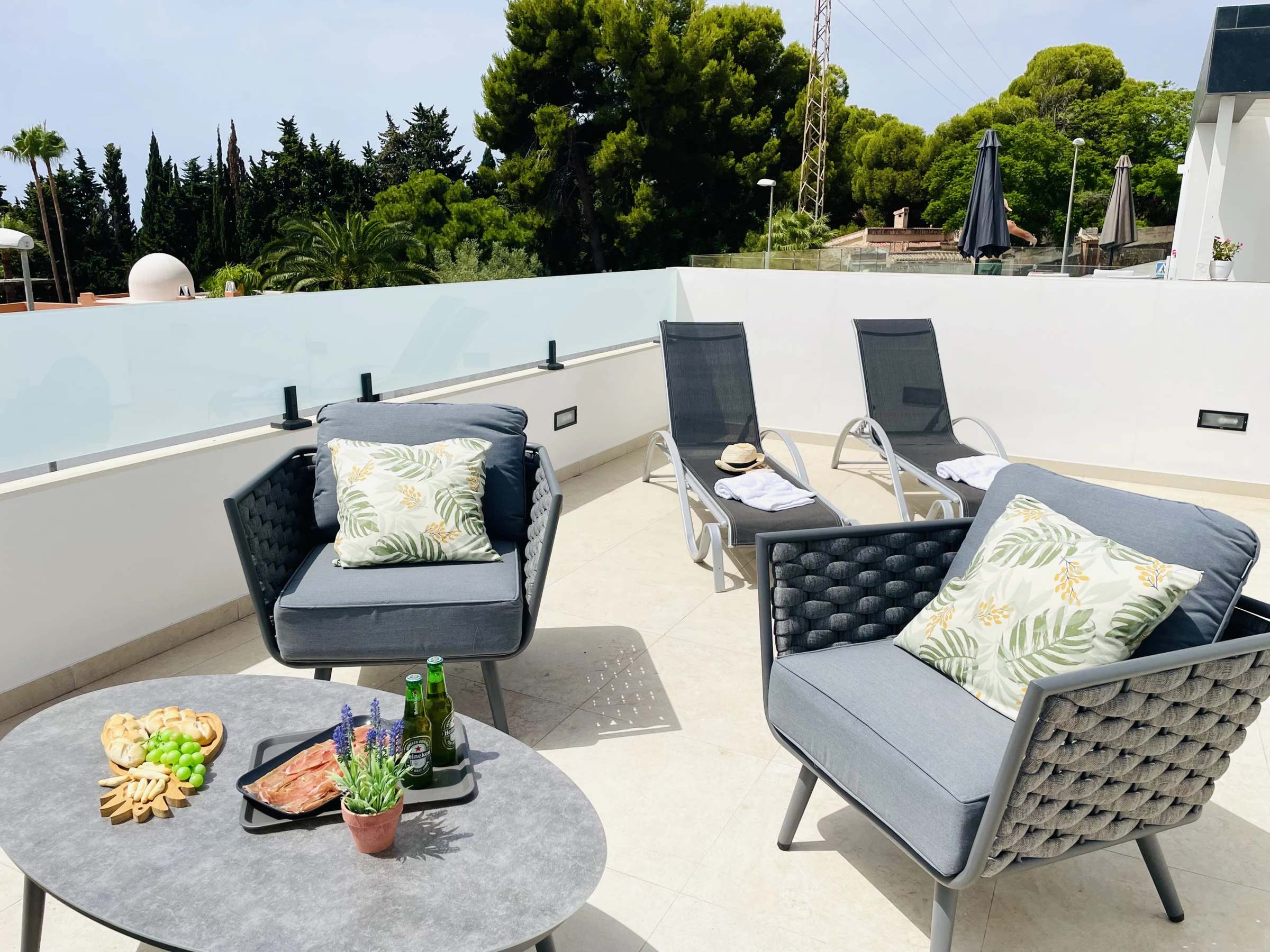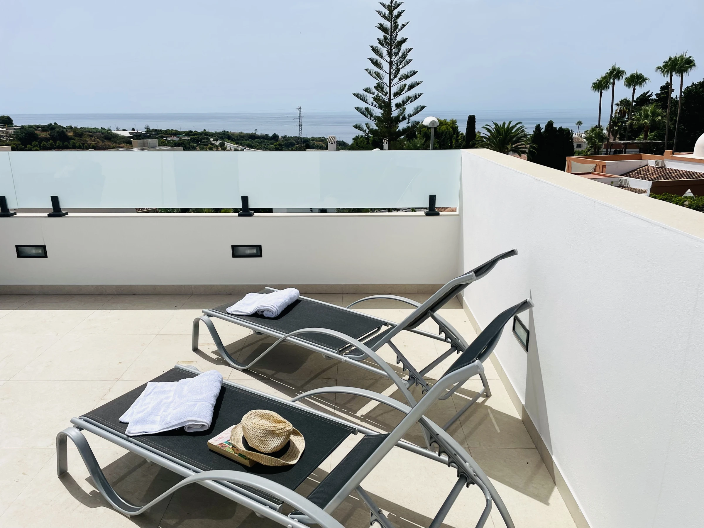 Auf der Dachterrasse erwarten Sie eine Chill-out-Zone, ein Solarium und ein fantastischer Blick auf das Mittelmeer.