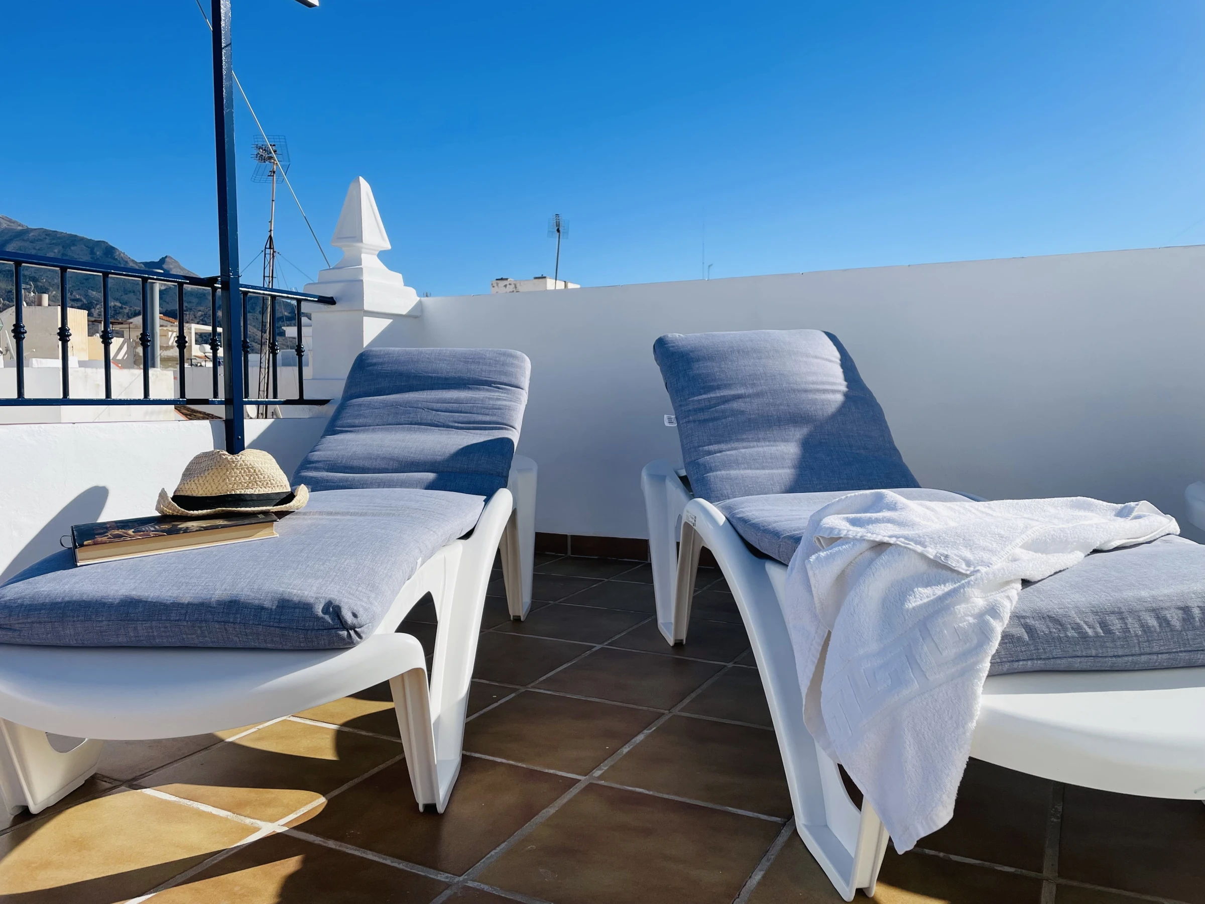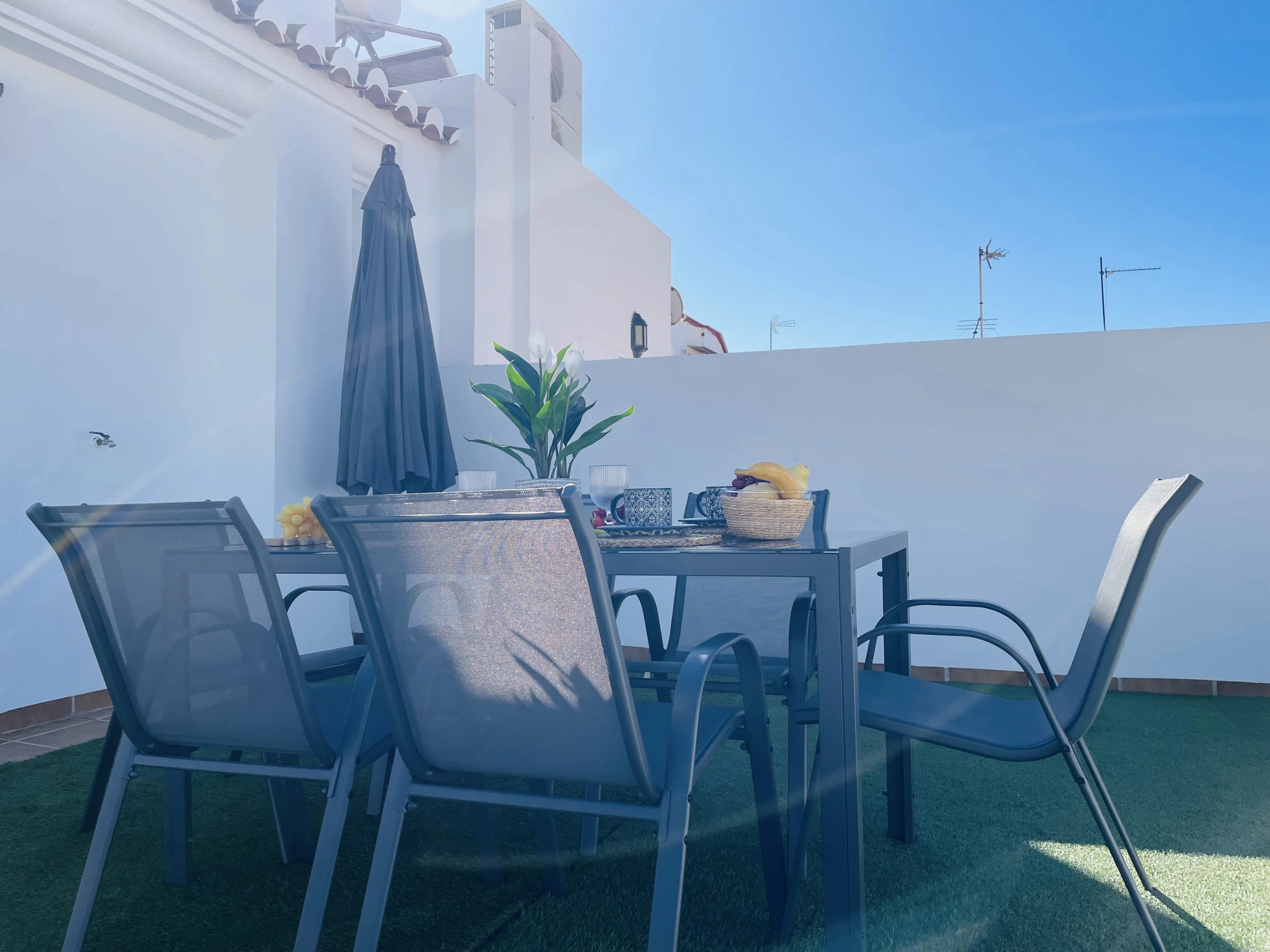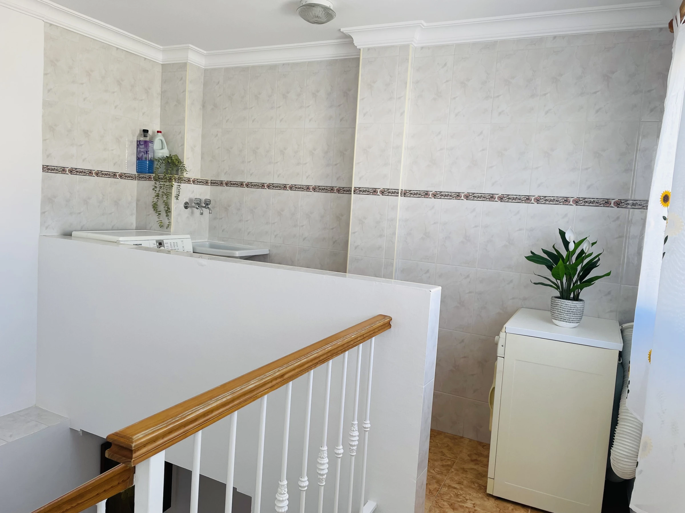 Die Immobilie bietet zudem eine große Dachterrasse im obersten Stockwerk, die ideal ist, um die Sonne und den Ausblick zu genießen. Sie ist mit einem Tisch und Stühlen sowie Liegestühlen ausgestattet und bietet den perfekten Ort, um im Freien Zeit mit Familie oder Freunden zu verbringen. Auf derselben Etage befindet sich auch ein Wäschebereich mit Waschmaschine und Wäschetrockner, was die Haushaltsaufgaben praktisch und bequem macht.