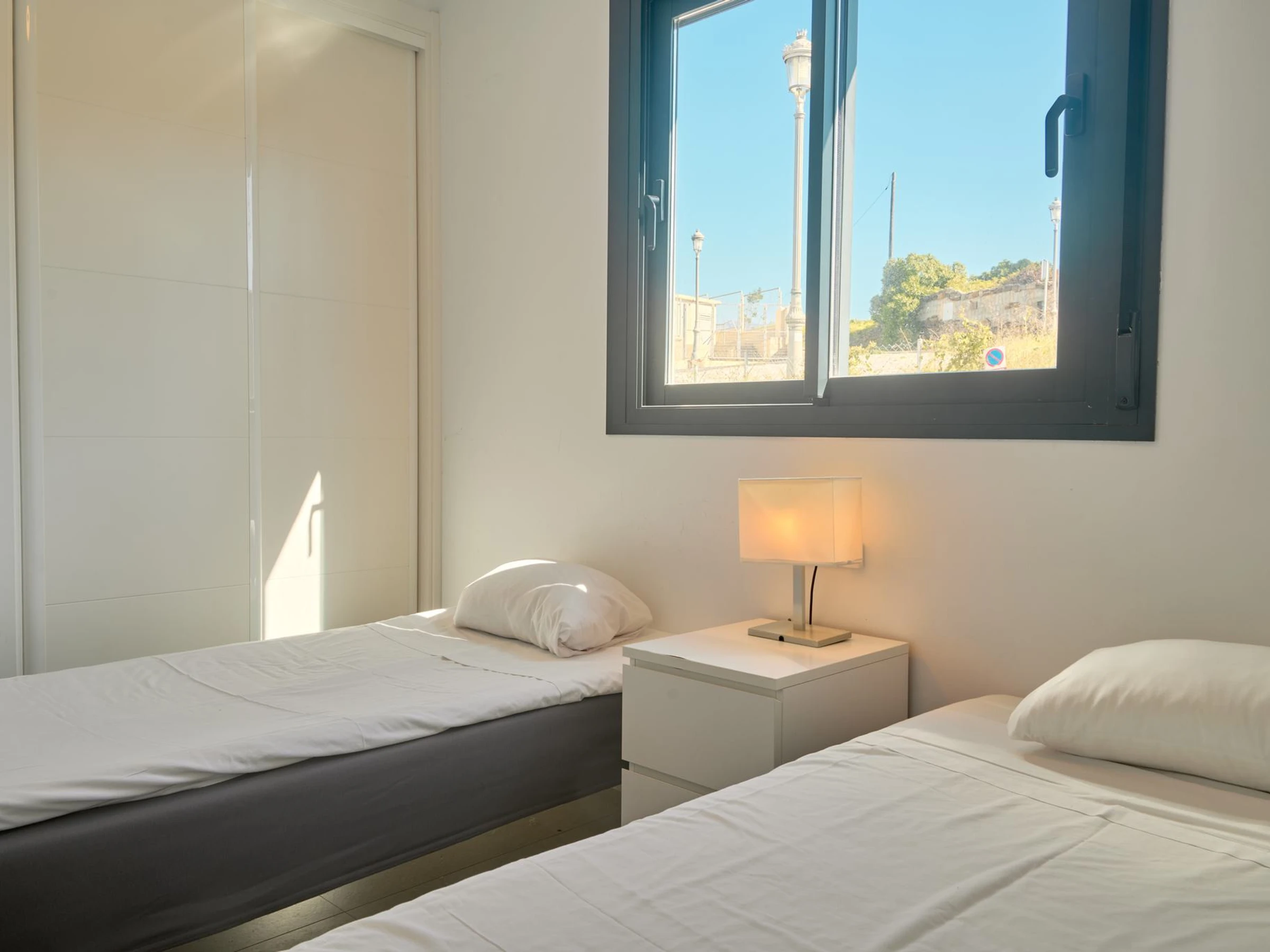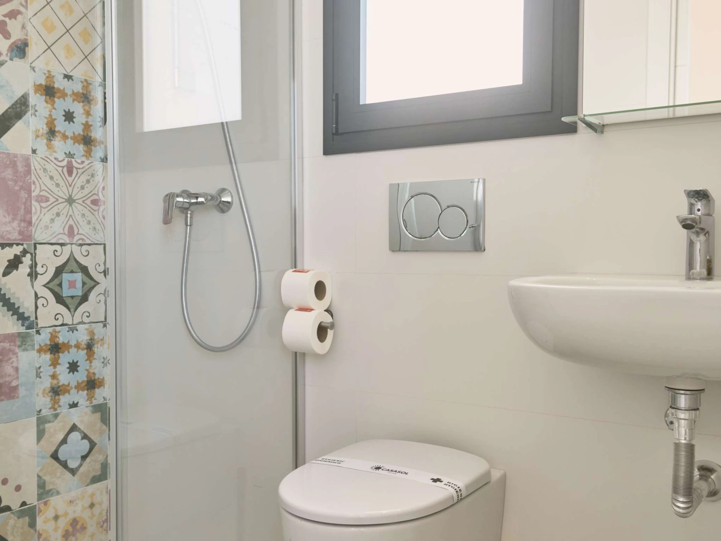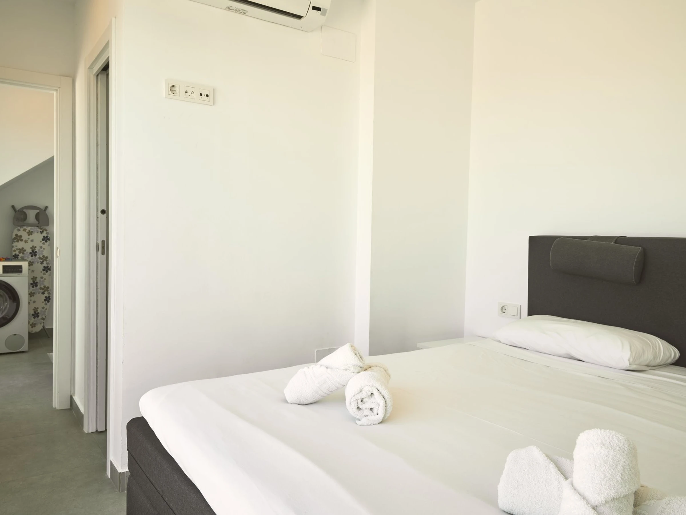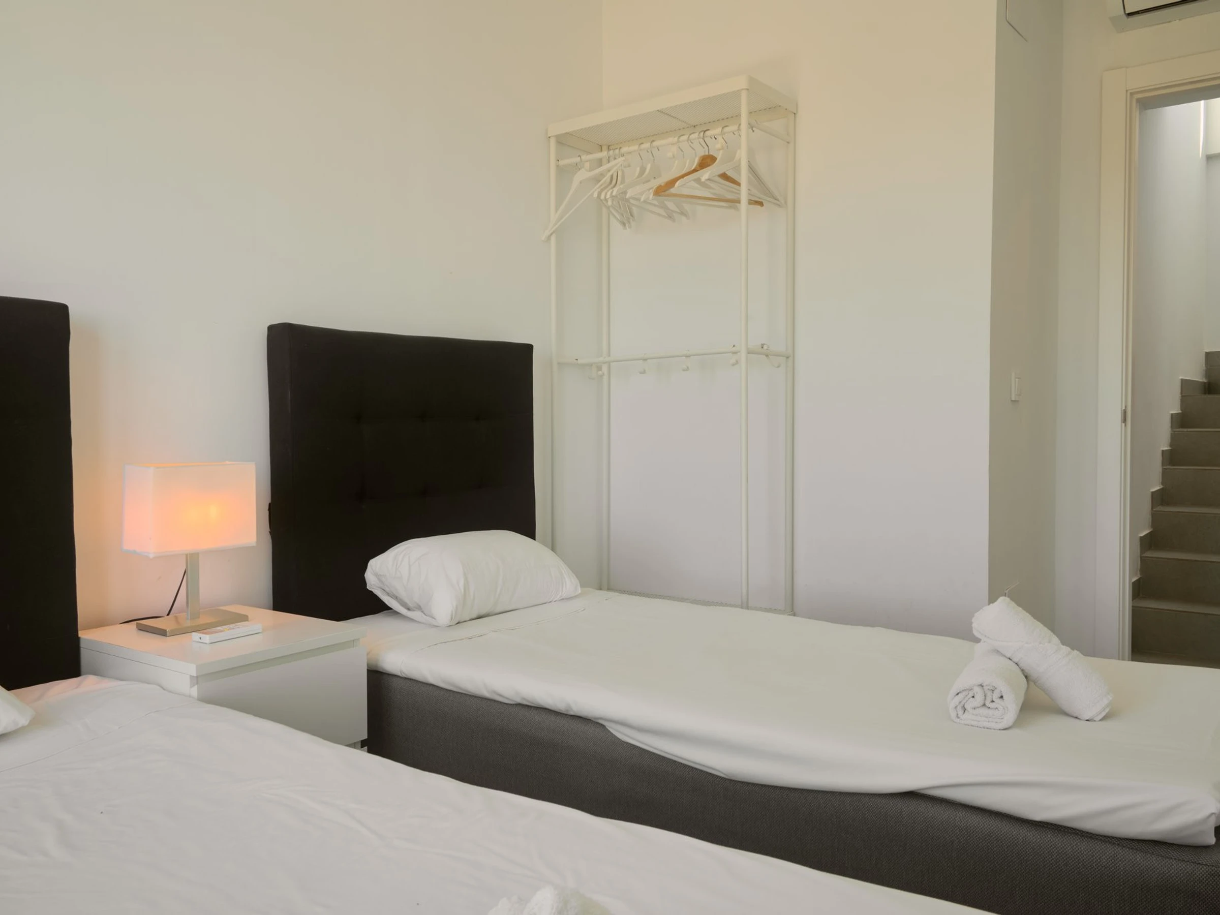 Die Unterkunft ist praktisch für Gruppen von bis zu 6 Personen eingerichtet. Im Erdgeschoss befinden sich das Wohnzimmer mit integrierter Küche, zwei Schlafzimmer mit Einzelbetten und ein Badezimmer mit Dusche. Das Obergeschoss ist dem Hauptschlafzimmer mit Doppelbett und einem zweiten Badezimmer mit Dusche vorbehalten. Von dieser Ebene aus gelangt man auf eine private Terrasse, die als Durchgang zur Dachterrasse zur exklusiven Nutzung dient und je nach Tageszeit unterschiedliche Bereiche mit Sonne und Schatten bietet.