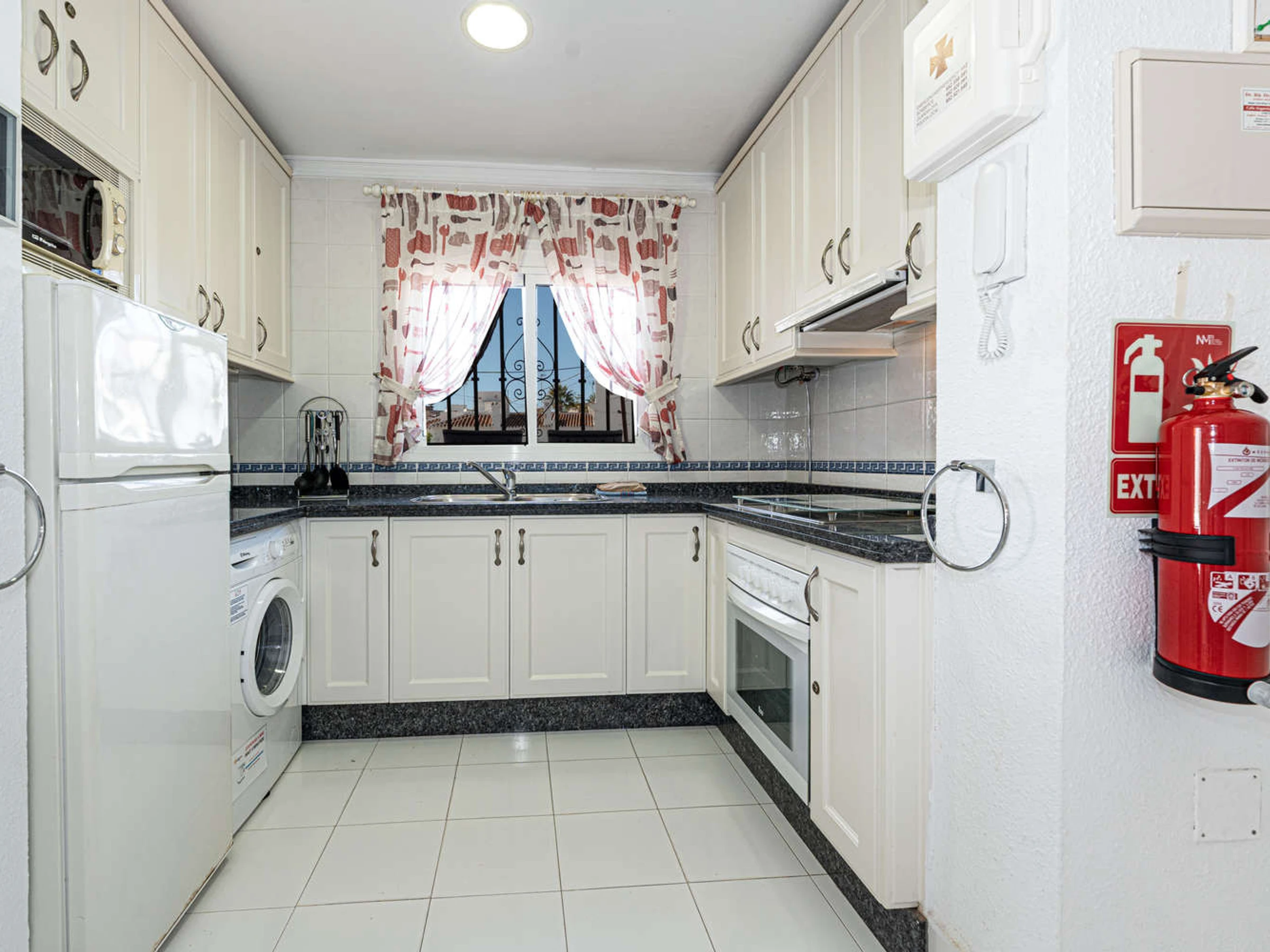 Die offene Küche mit Ceranfeld ist ausgestattet in einen Kühlschrank, eine Mikrowelle, ein Backofen, einen Gefrierschrank, eine Waschmaschine, Geschirr/Besteck, Kochutensilien, eine Kaffeemaschine, einen Toaster und einen Wasserkocher.