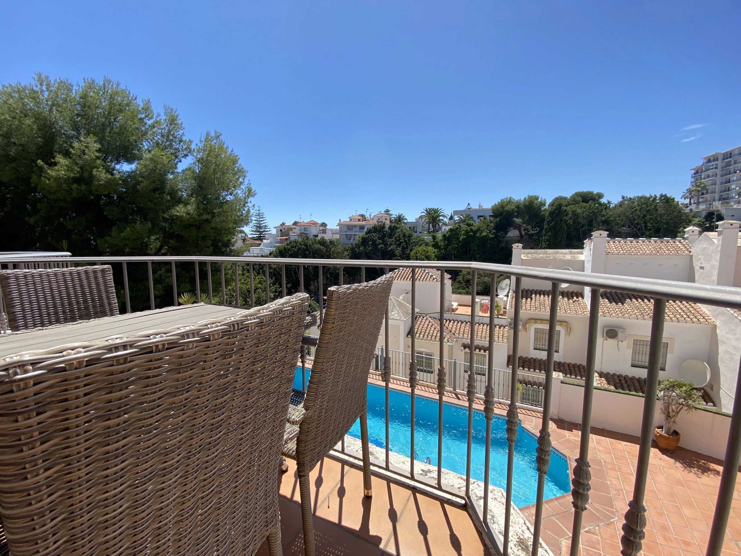 Innen- und Außenbereich: Die Wohnung zeichnet sich durch ihre Offenheit nach außen hin aus, mit zwei privaten Balkonen in Südlage, von denen einer vom Wohnzimmer und der andere vom Hauptschlafzimmer aus zugänglich ist. Beide Bereiche ermöglichen es, das Klima von Nerja mit direktem Blick auf den Poolbereich zu genießen und schaffen eine entspannte und helle Atmosphäre im gesamten Innenbereich.
