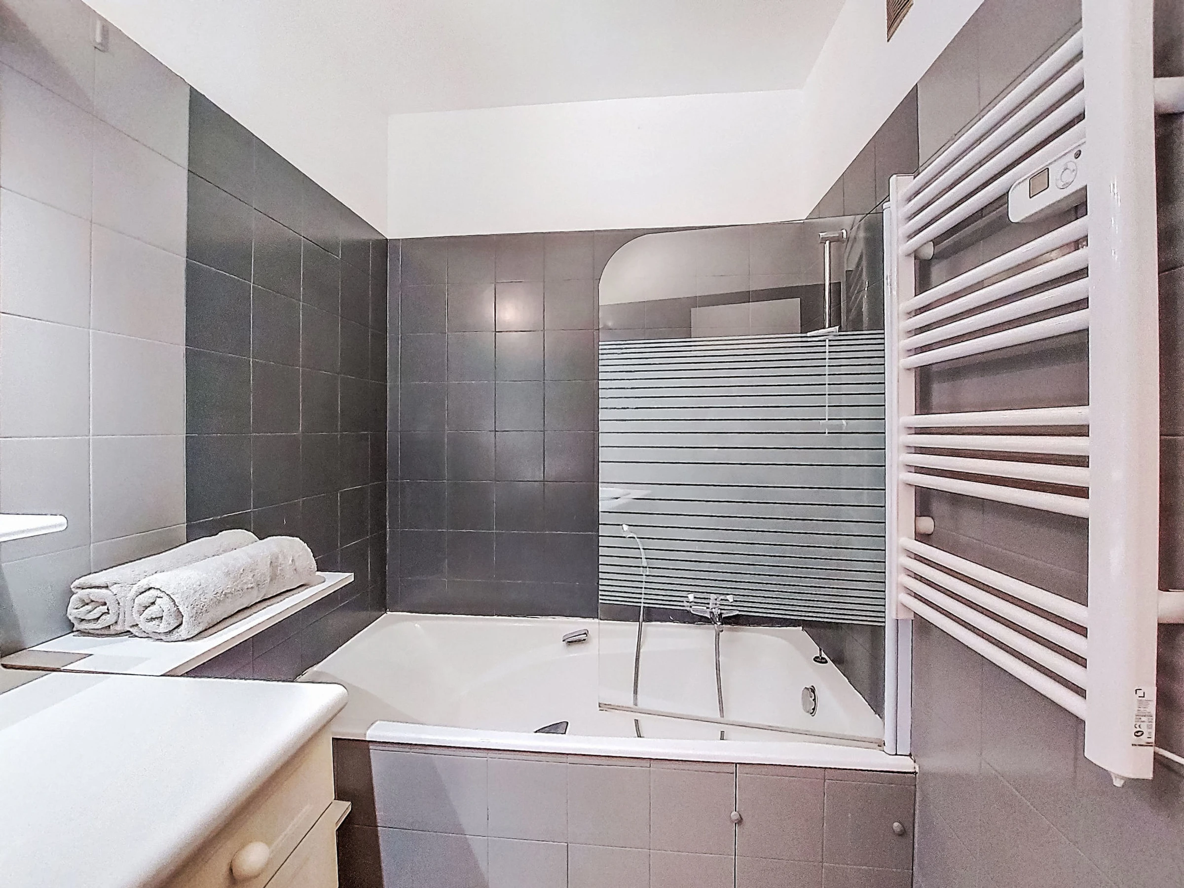 2-Zimmer-Wohnung 60 m2 im 3. Stock. Renoviert im Jahre 2023, komfortabel und modern eingerichtet: Wohn-/Esszimmer mit 1 Doppeldiwanbett (140 cm, Länge 190 cm), Kabel-TV (Flachbildschirm). Ausgang zur Terrasse. 1 Zimmer mit 1 franz. Bett (160 cm, Länge 190 cm), Klimaanlage. Ausgang zur Terrasse. Offene Küche (Backofen, Geschirrspüler, 3 Glaskeramikplatten, Mikrowelle, Tiefkühler, elektrische Kaffeemaschine) mit Bar. Ausgang zur Terrasse. Bad, sep. WC. E-Heizung. Grosse Terrasse 12 m2, Südlage. Terrassenmöbel. Sicht auf die Landschaft. Zur Verfügung: Waschmaschine, Bügeleisen, Haartrockner. Internet (Wireless LAN, gratis). Garage Nr. 14 (1 Auto). Bitte beachten: Parkplatz nur für kleine Wagen. [hidden]