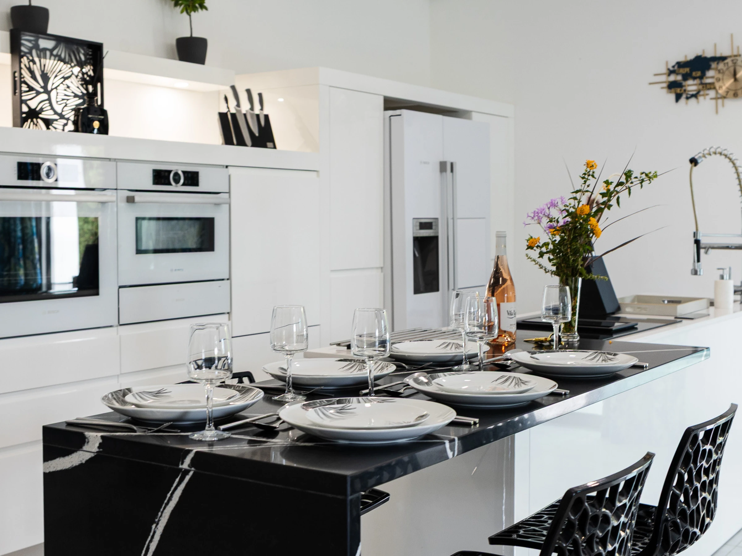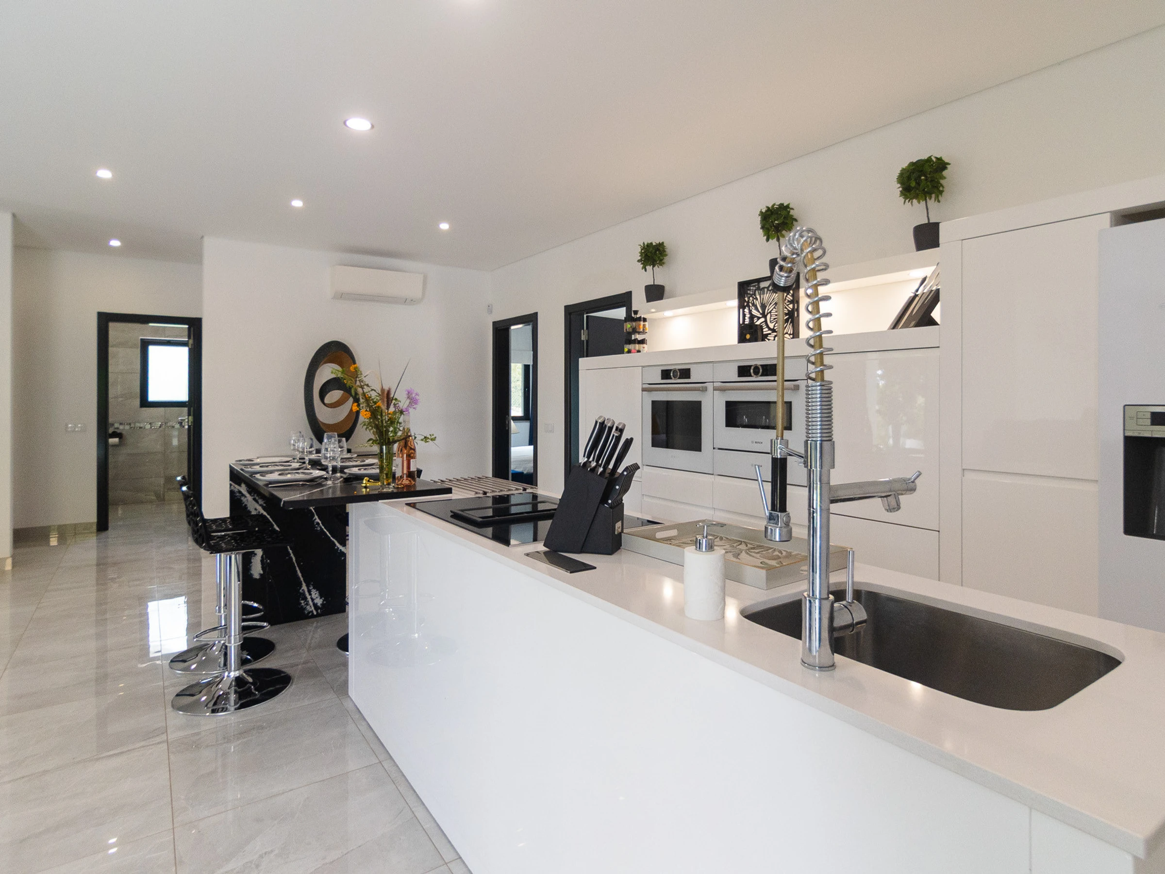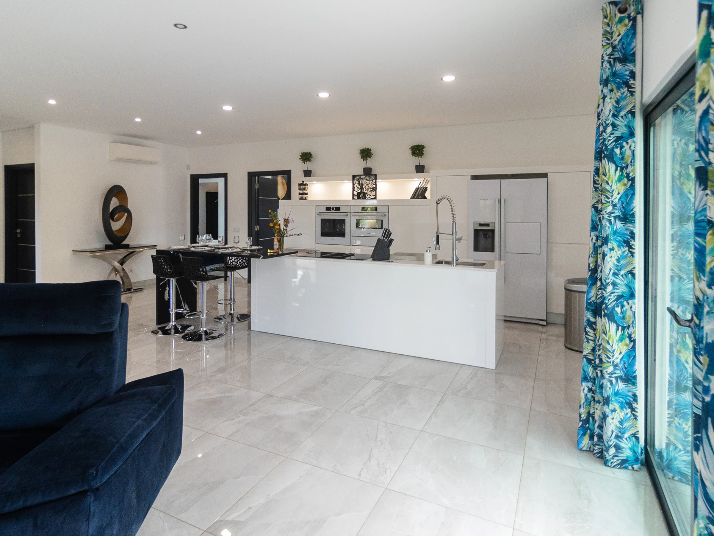 Dieses offene küche, mit induktions-kochfeld, ist ausgestattet in kühlschrank, mikrowelle, backofen, gefrierschrank, spülmaschine, geschirr/besteck, kochutensilien, kaffeemaschine, friteuse, toaster und wasserkocher.