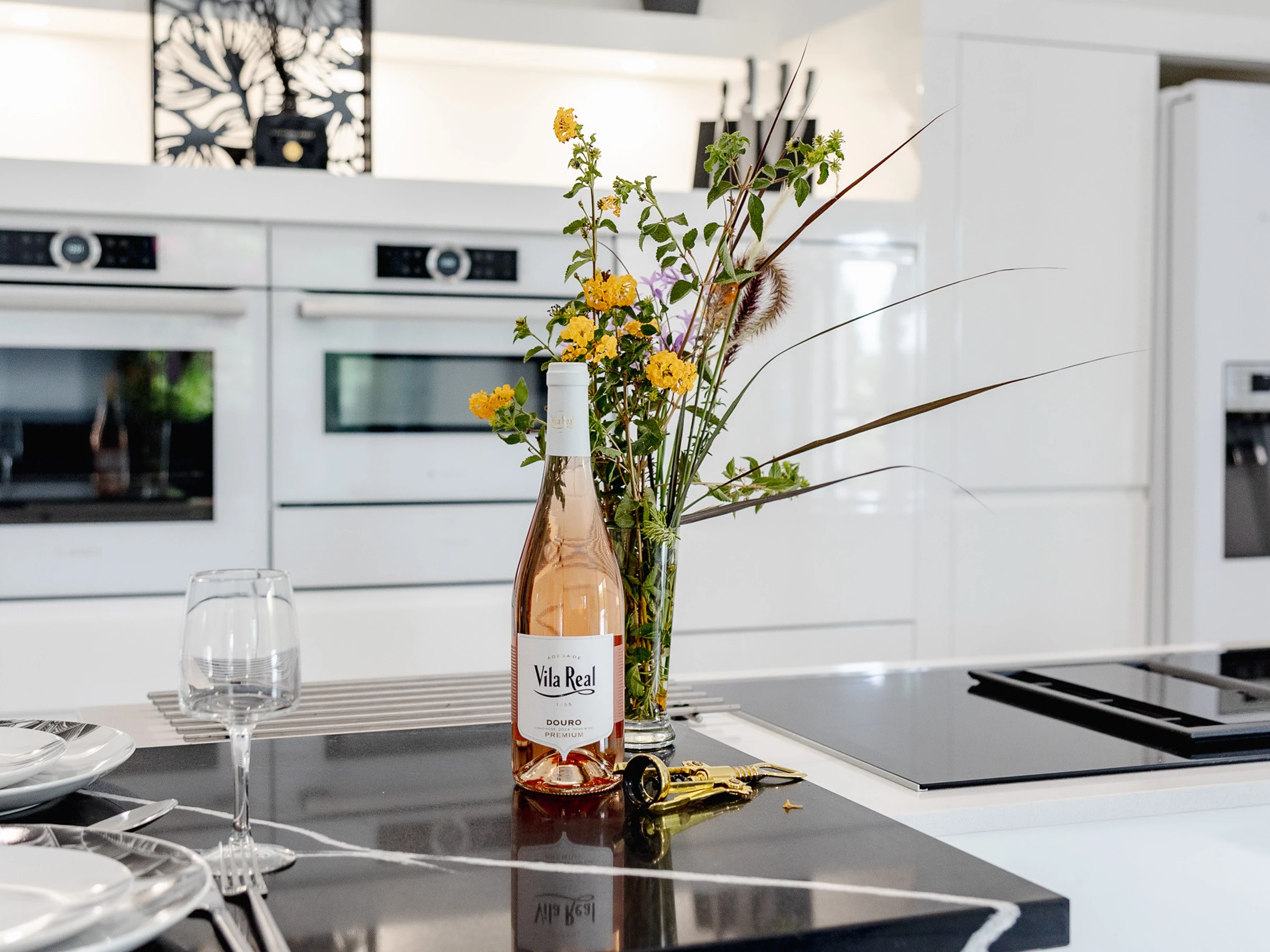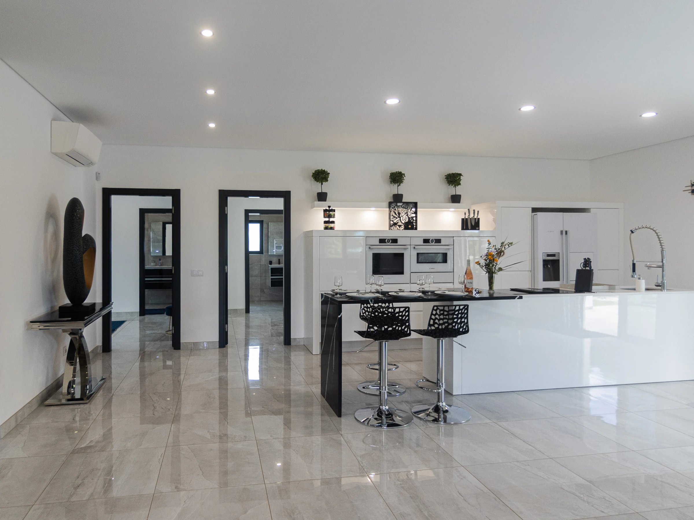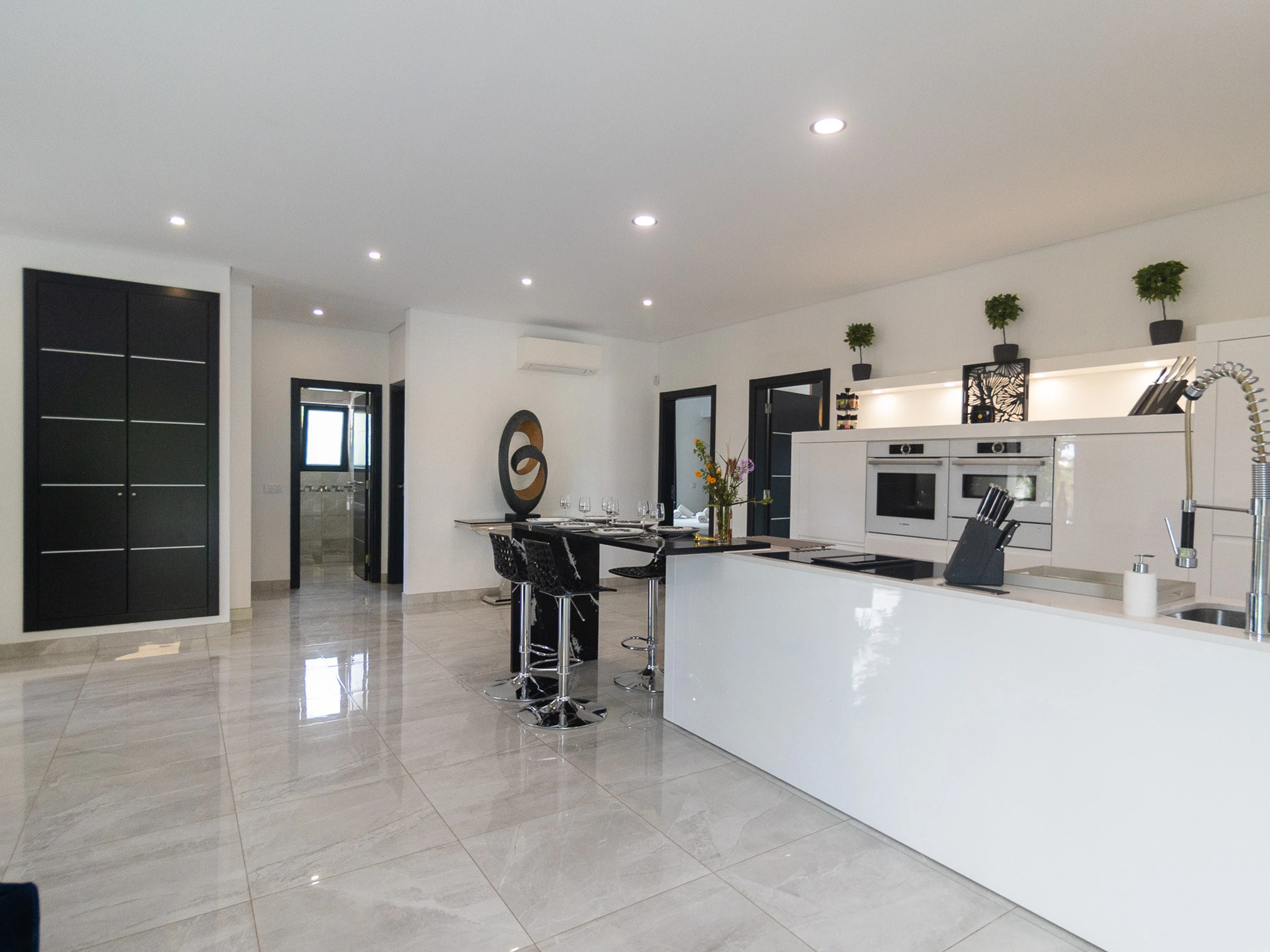 Dieses offene küche, mit induktions-kochfeld, ist ausgestattet in kühlschrank, mikrowelle, backofen, gefrierschrank, spülmaschine, geschirr/besteck, kochutensilien, kaffeemaschine, friteuse, toaster und wasserkocher.