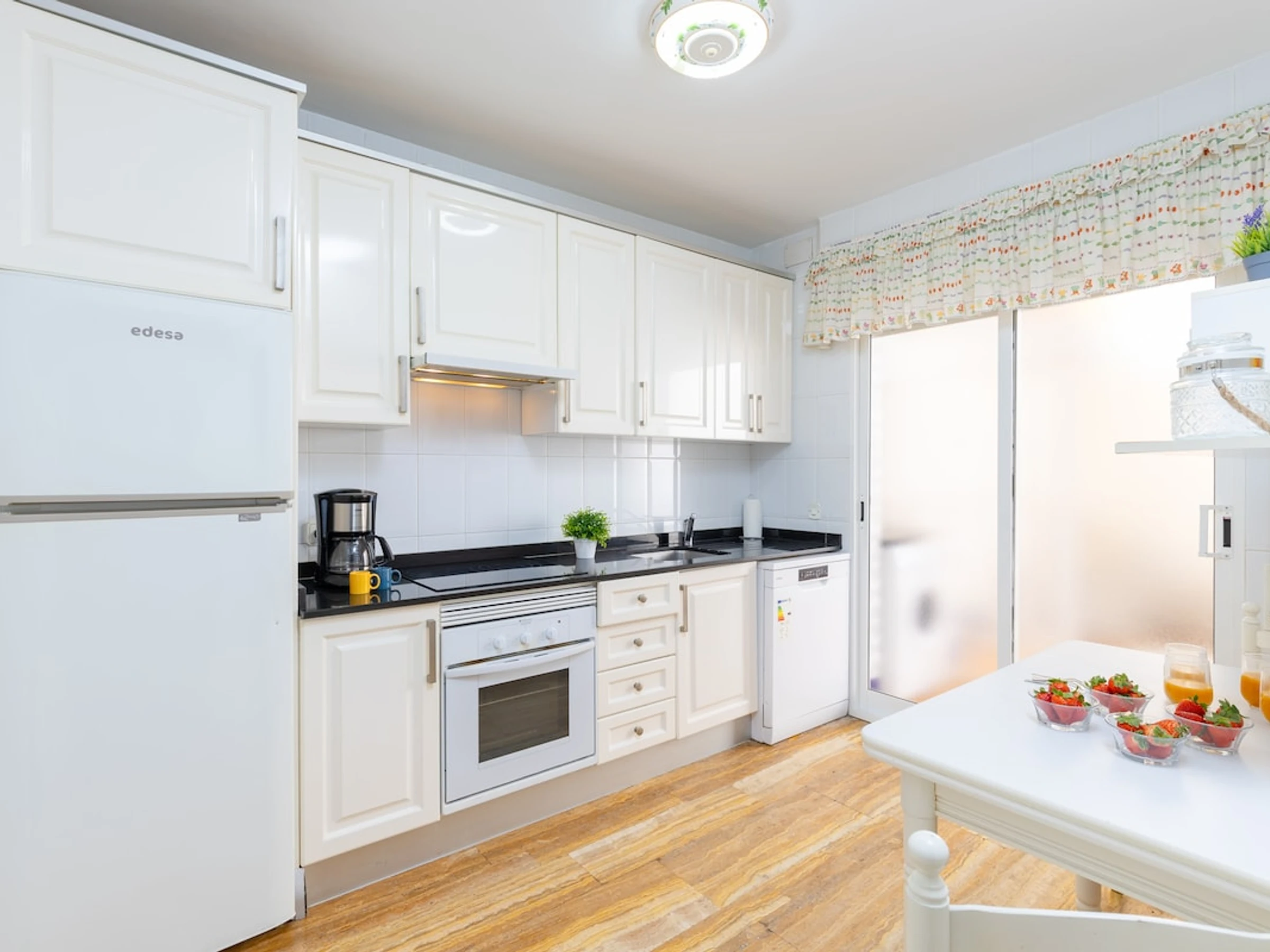 Dieses küche, ist ausgestattet in kühlschrank, mikrowelle, backofen, gefrierschrank, spülmaschine, kaffeemaschine und toaster.