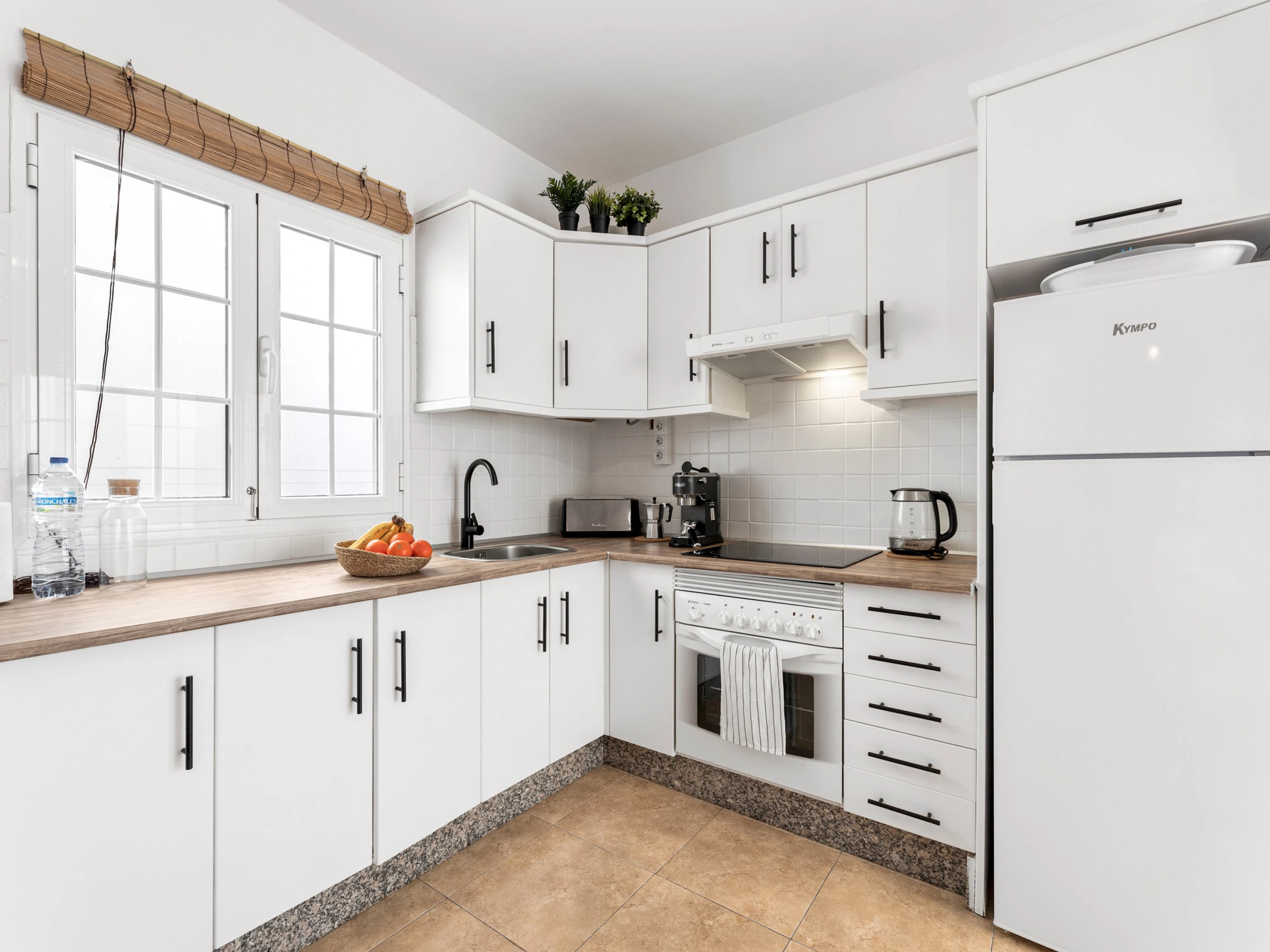 Dieses küche, ist ausgestattet in backofen, kochutensilien und kaffeemaschine.