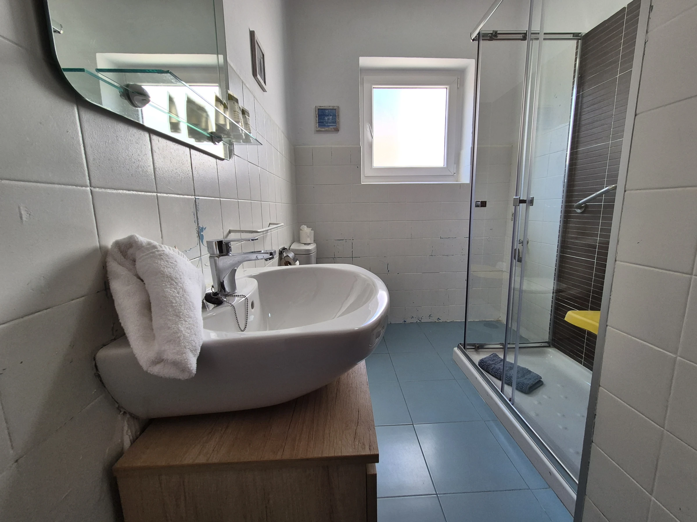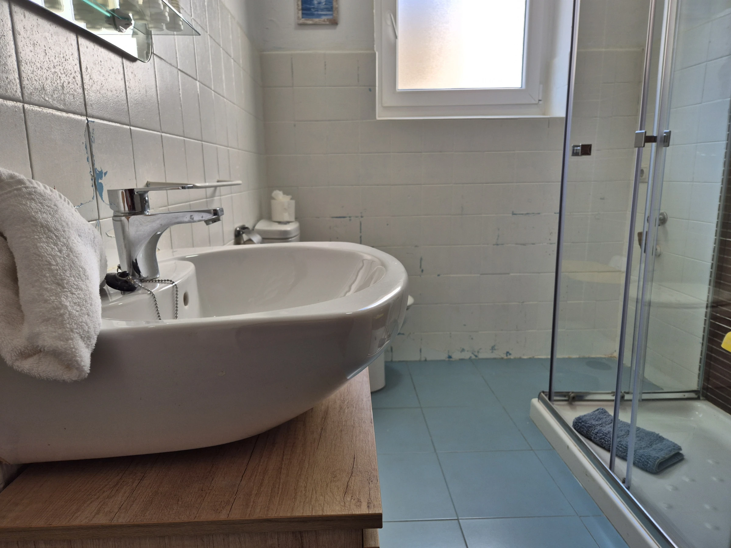 Badezimmer: Ein vollständiges Badezimmer mit Dusche, Handtüchern und Pflegeprodukten für Ihren Komfort.