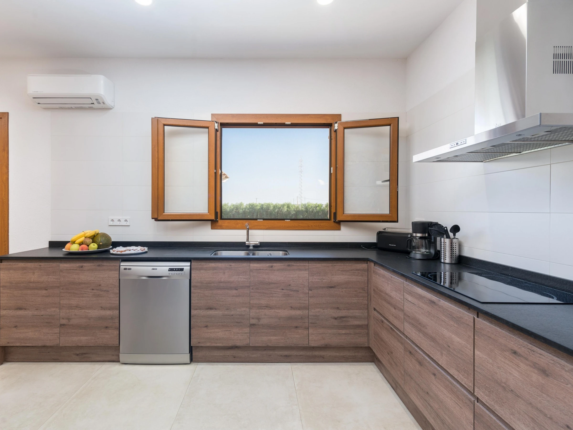 Dieses küche, ist ausgestattet in kühlschrank, mikrowelle, backofen, gefrierschrank, spülmaschine, kaffeemaschine und toaster.