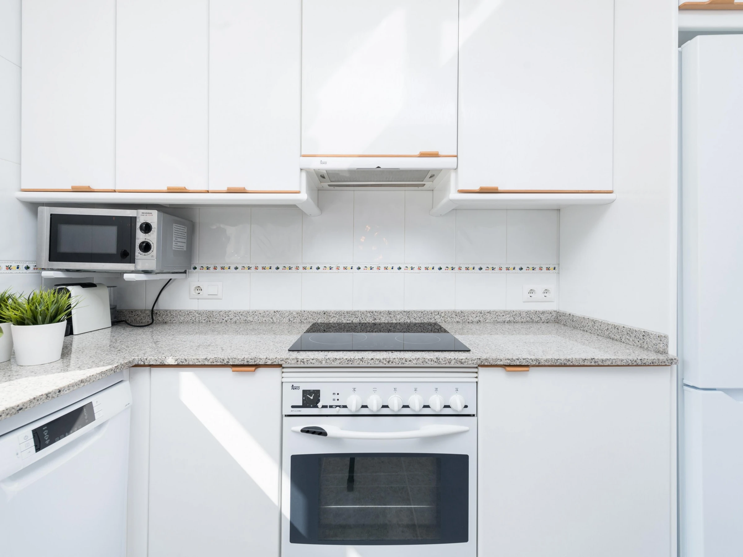 Dieses küche, ist ausgestattet in kühlschrank, mikrowelle, backofen, gefrierschrank, spülmaschine, kaffeemaschine und toaster.