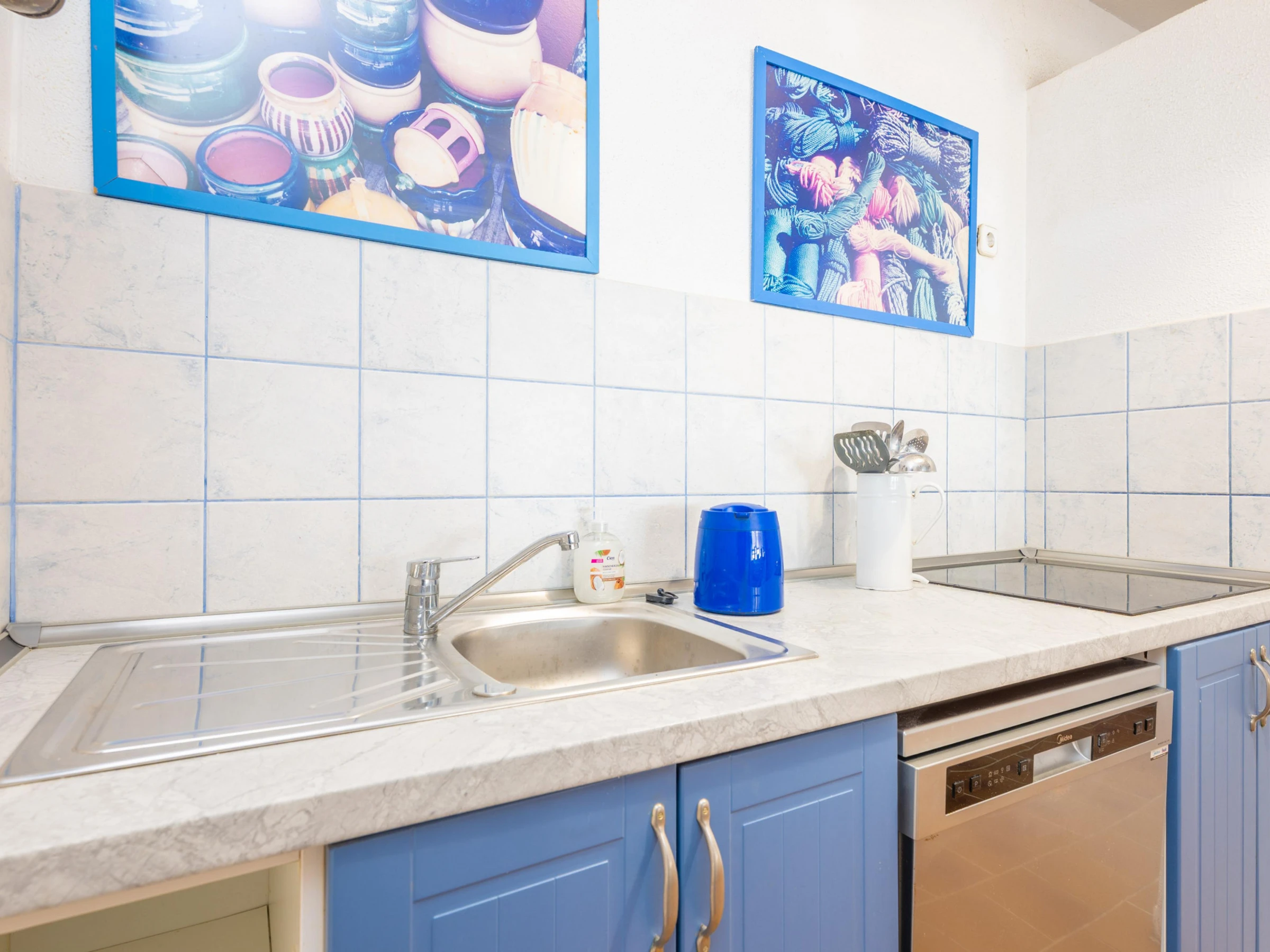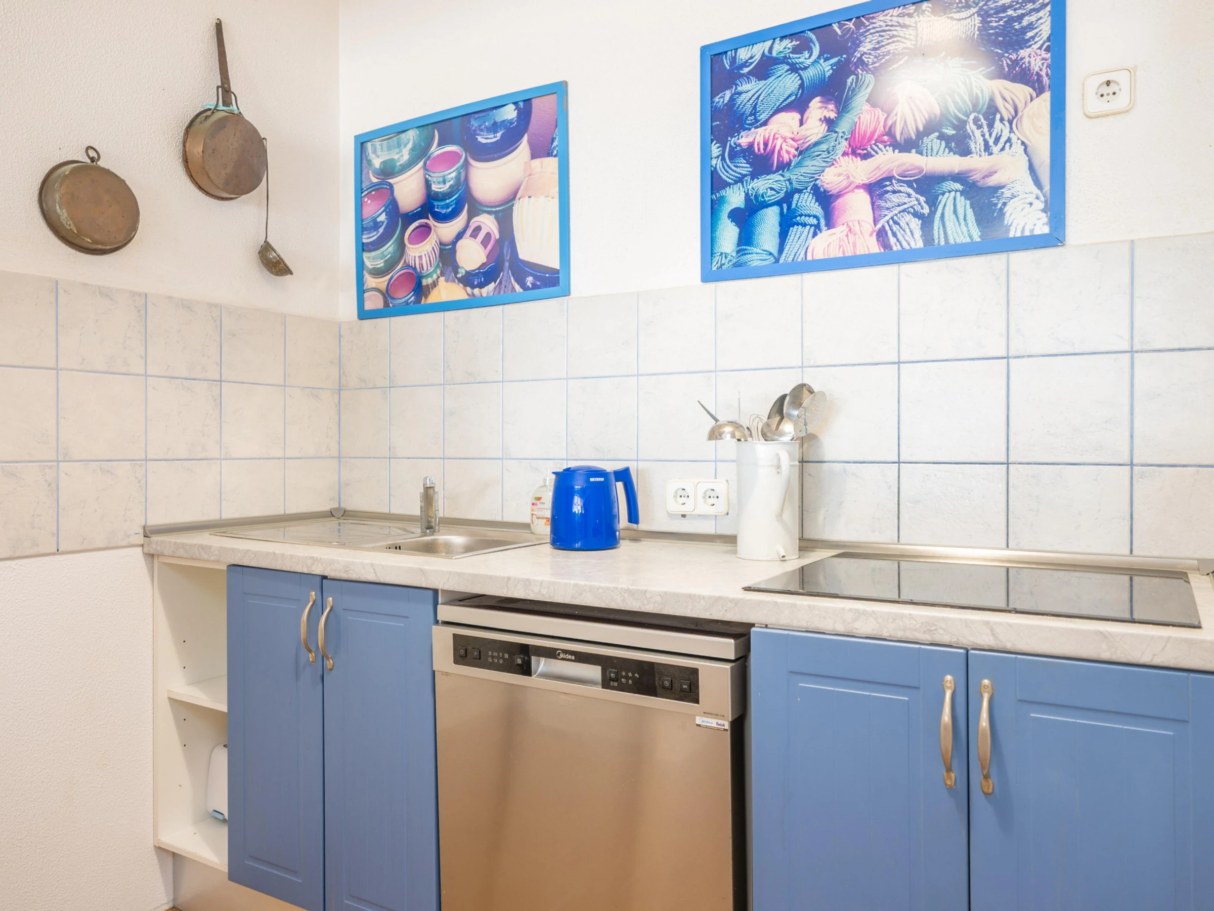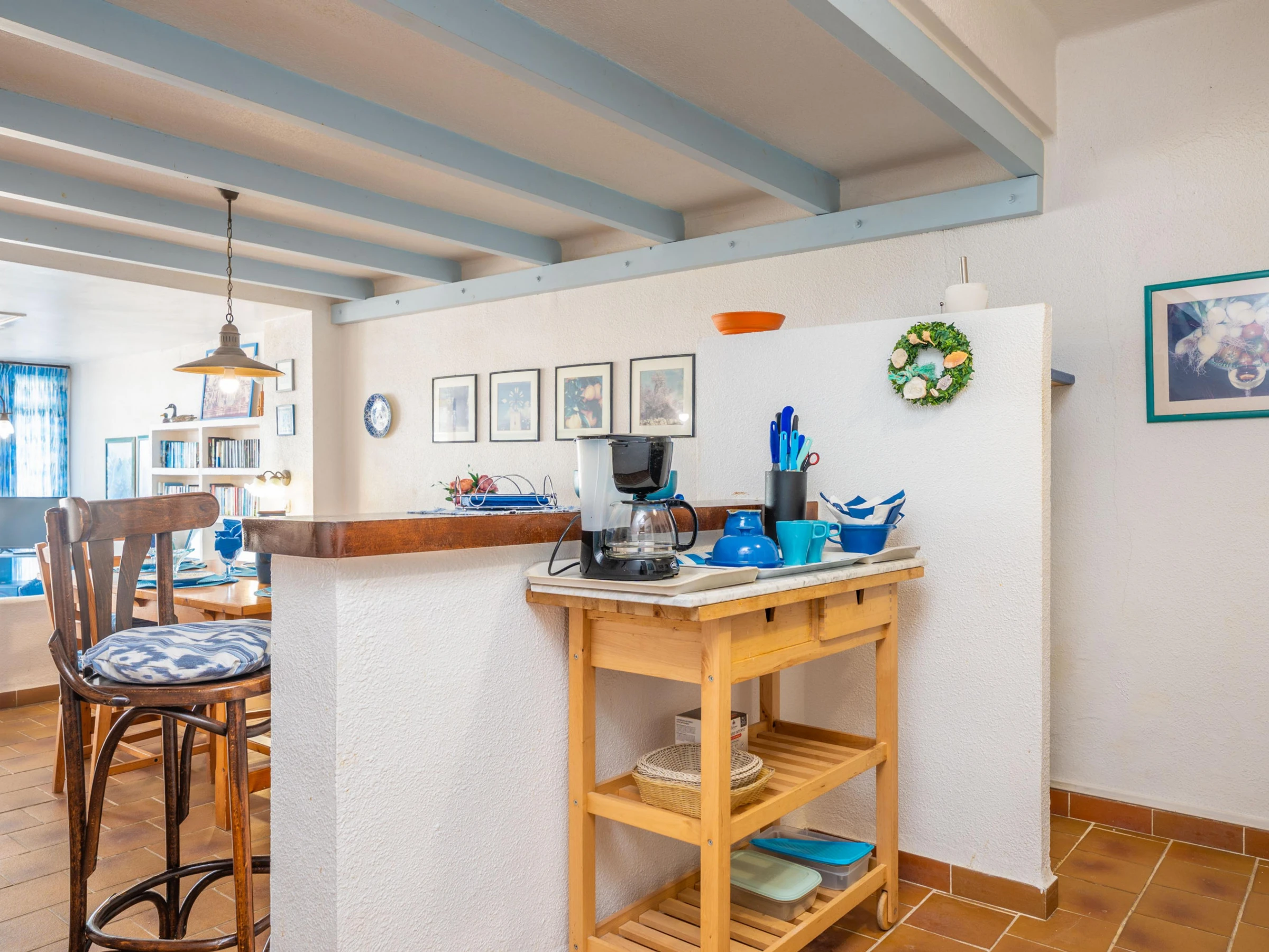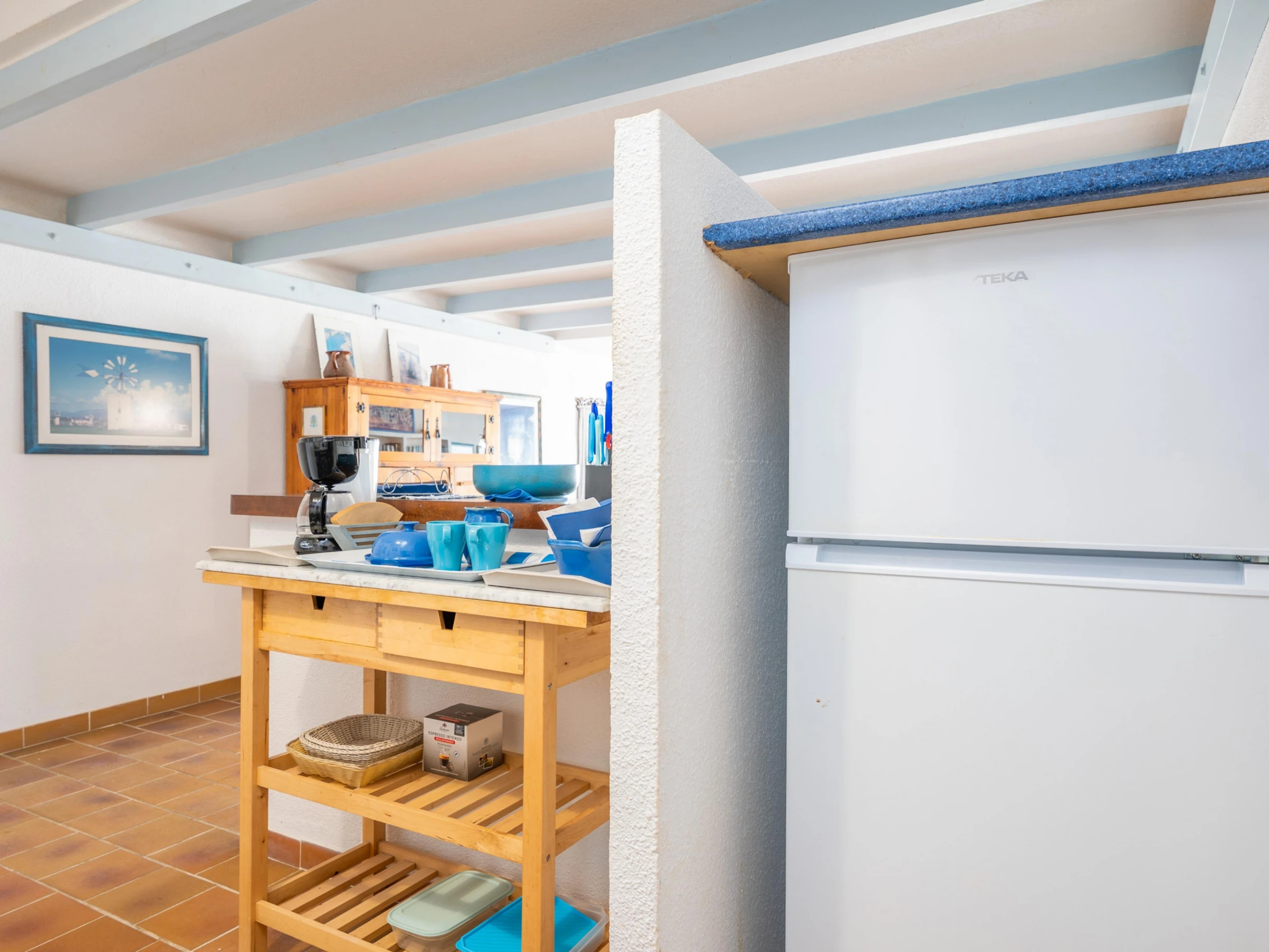 Die Küche ist mit Kühlschrank, Gefrierschrank, Geschirrspüler, Kaffeemaschine und Toaster ausgestattet.
