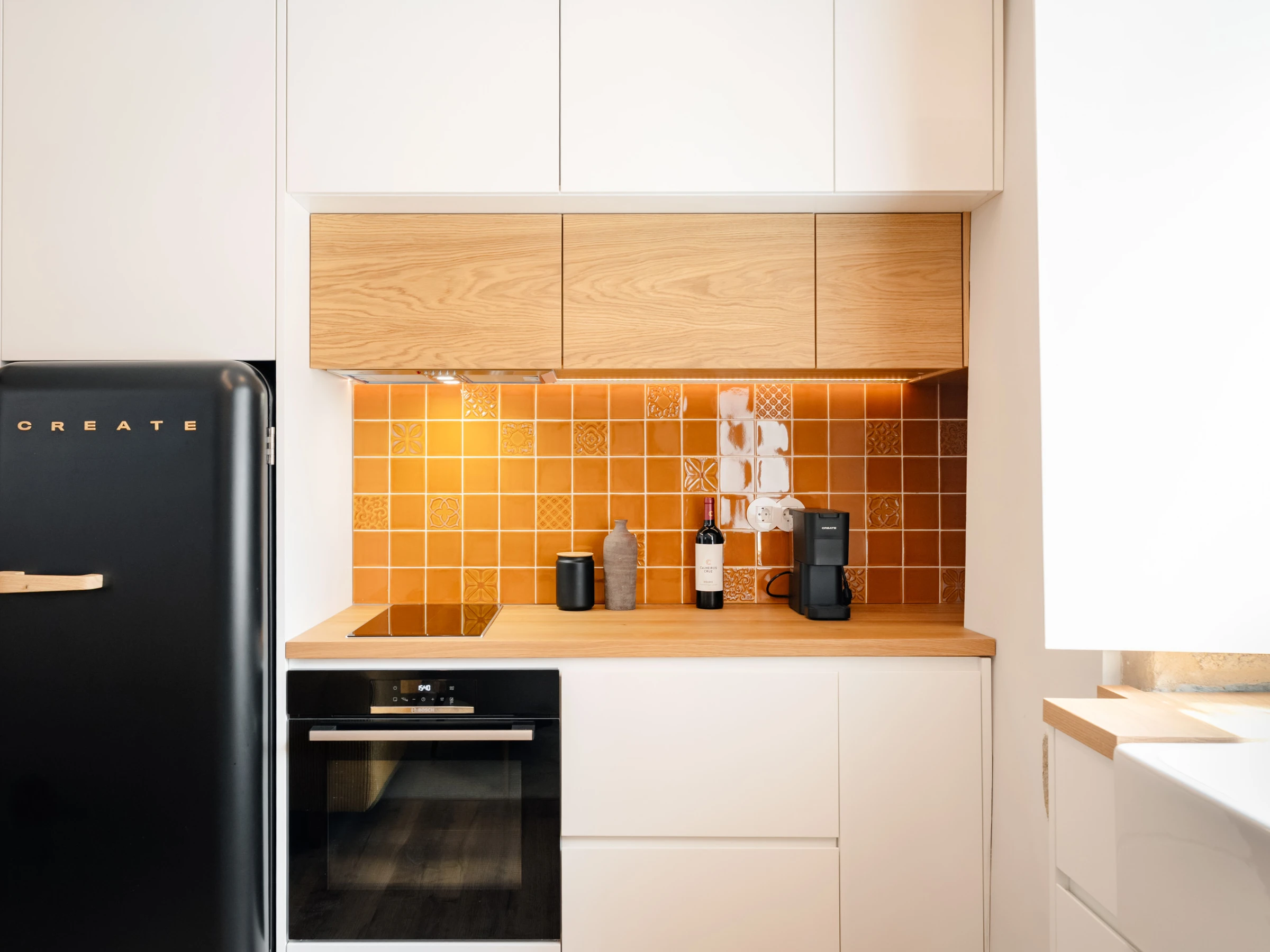Dieses offene küche, mit induktions-kochfeld, ist ausgestattet in kühlschrank, mikrowelle, backofen, gefrierschrank, geschirr/besteck, kochutensilien, kaffeemaschine, toaster und wasserkocher.