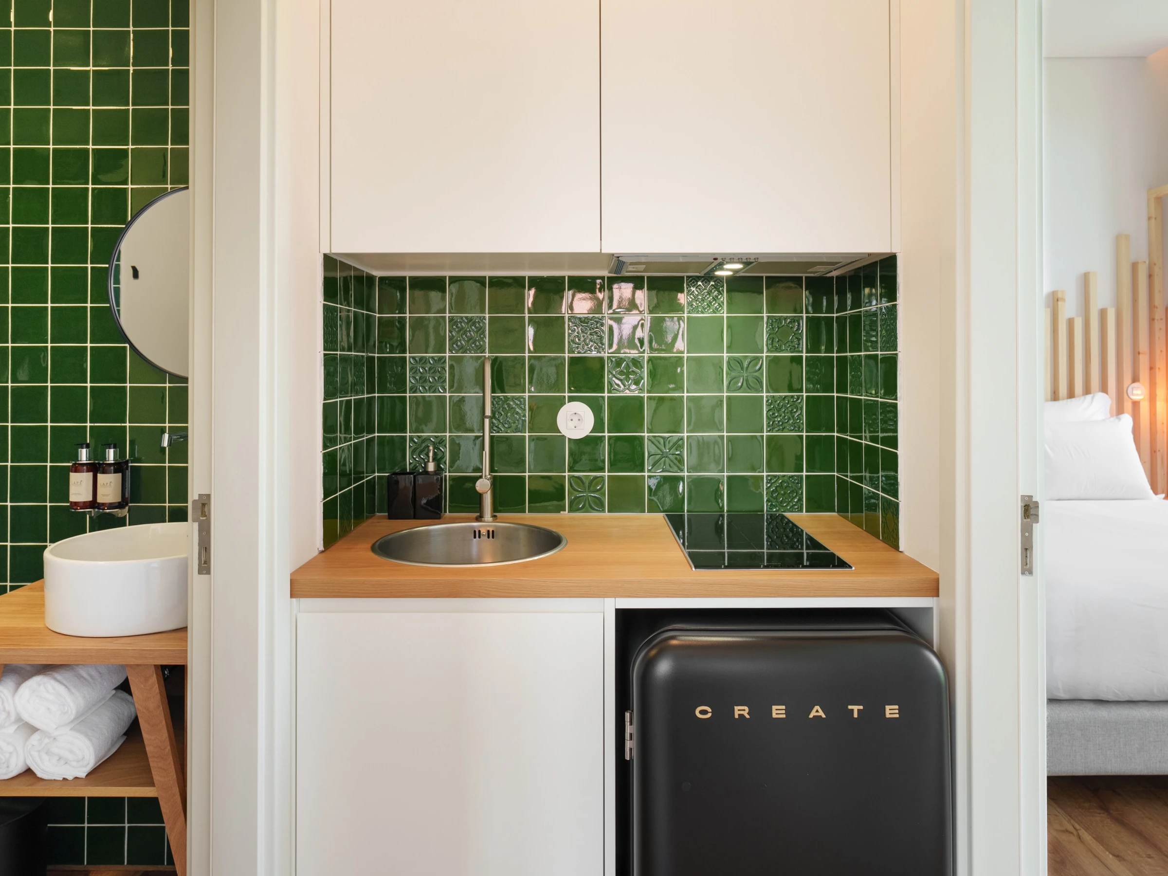 Dieses offene küche, mit induktions-kochfeld, ist ausgestattet in kühlschrank, mikrowelle, geschirr/besteck, kochutensilien, kaffeemaschine, toaster und wasserkocher.