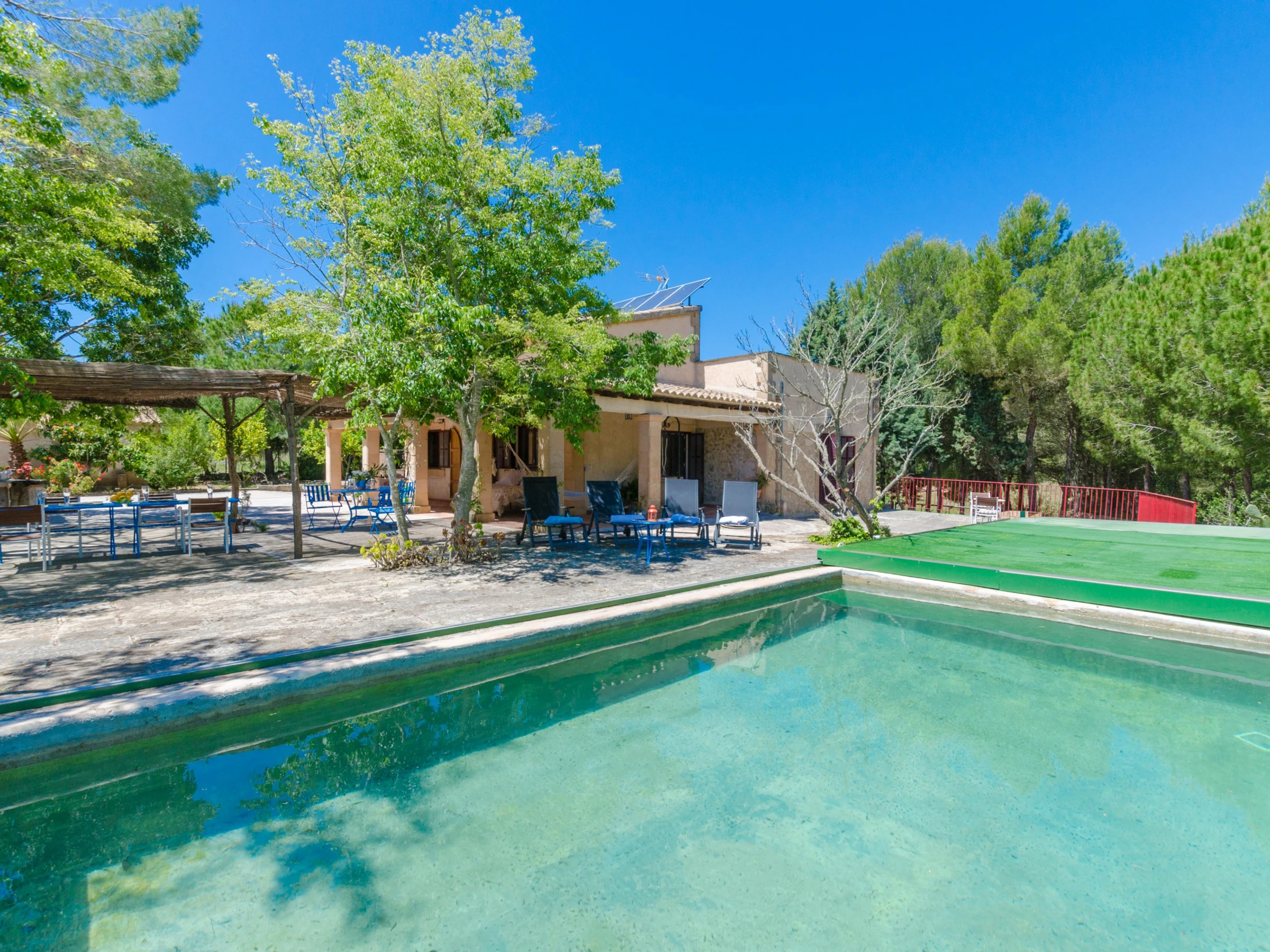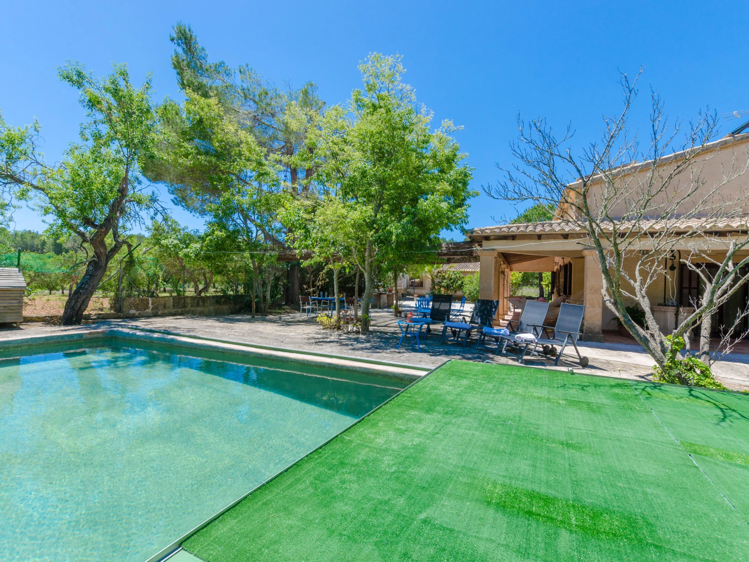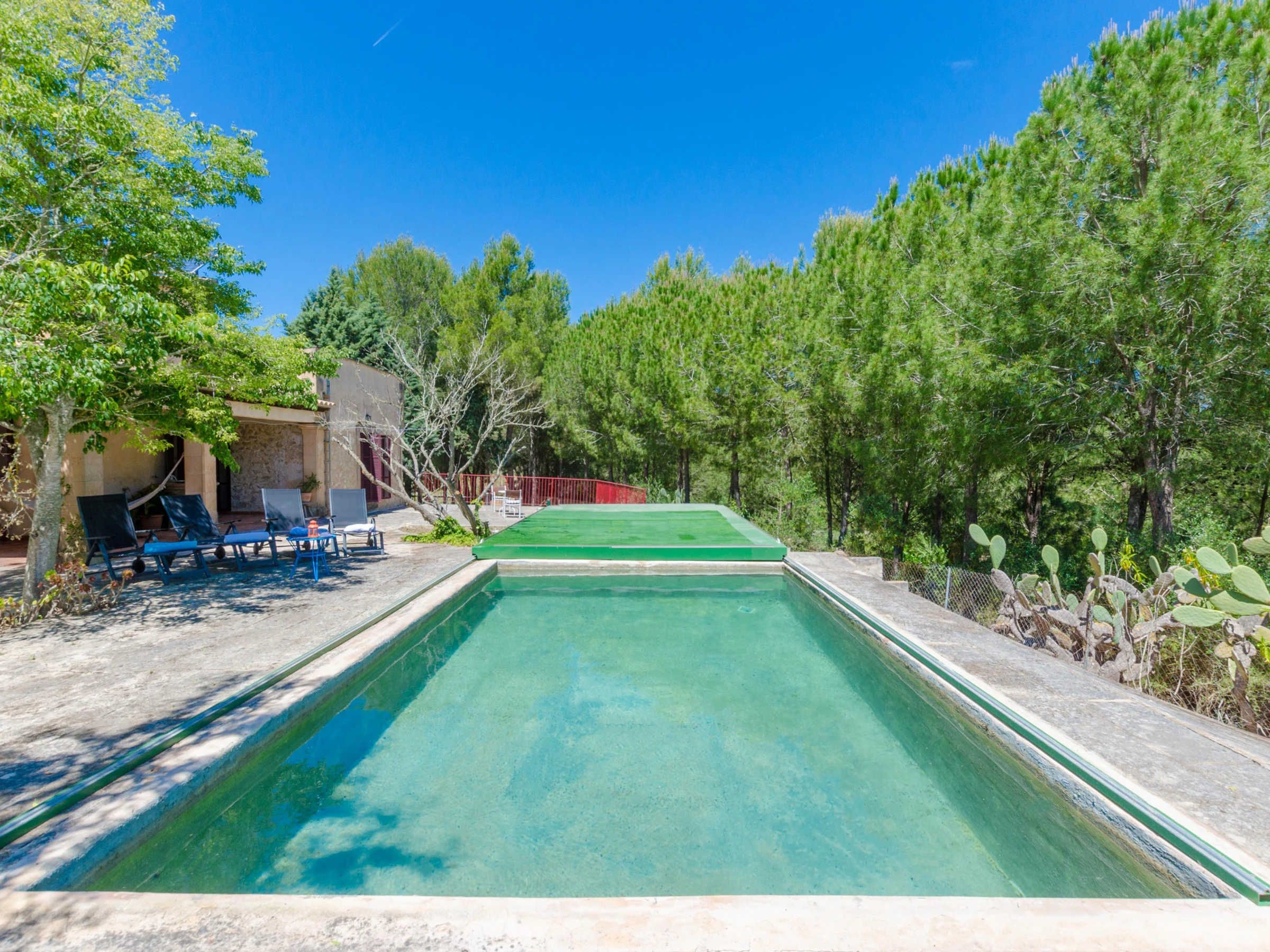 Der 7 x 4.5 Meter grosse und zwischen 1.3 und 2.3 Meter tiefe Naturpool kommt ohne Zusatz von Chlor, Salz oder anderen künstlichen Reinigungsmitteln aus, sondern wird über ein spezielles System mit Sauerstoff gereinigt. Der Pool ist übere eine Leiter zugänglich. Auf der geräumigen Terrasse finden unsere Gäste viele Ecken zum Entspannen. Entweder schnappt man sich eine der Sonnenliegen und lässt sich eine schöne Sommerbräune stehen oder man freut sich auf ein leckeres Barbecue. Das zweistöckige Haus ist ganz im Landhausstil, rustikal und gemütlich, ausgestattet. Im hellen Wohn-Esszimmer kann man es sich auf dem Sofa gemütlich machen, einen Film im Astra-TV sehen oder an kühleren Tagen den Holzofen anmachen. Alle Chefs der Familie finden in der Fincaküche einen Gasherd, Kochutensilien, eine Mikrowelle, einen Ofen [hidden] Im Erdgeschoss gibt es ein Schlafzimmer mit Doppelbett und ein Bad mit Badewanne und Haarfön. Über die Treppe gelangt man ins Obergeschoss, wo ein weiteres Zimmer mit Doppelbett untergebracht ist. Das Haus ist mit Zentralheizung für den Winter, einer Waschmaschine, Babybett und Hochstuhl versehen. Die Kleinsten der Familie finden eine Miniküche, eine Schreibtafel und ein paar Spielsachen im Haus - da kommt keine Langeweile auf!