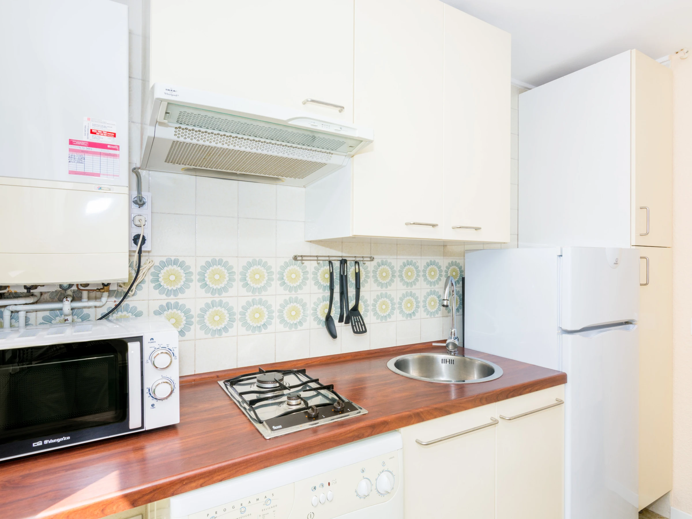 Dieses offene küche, mit gas-kochfeld, ist ausgestattet in kühlschrank, mikrowelle, gefrierschrank, geschirr/besteck, kochutensilien, kaffeemaschine und toaster.