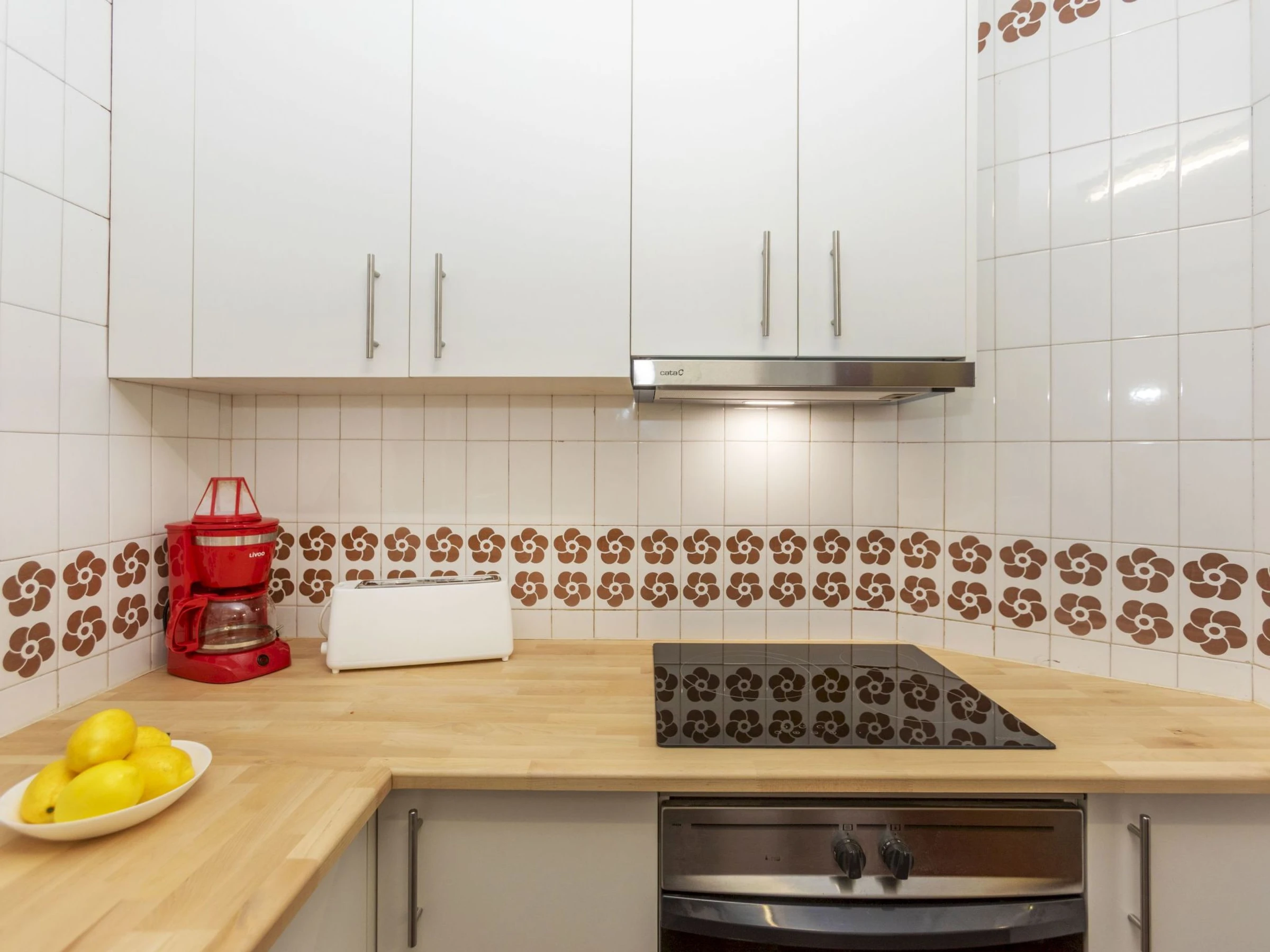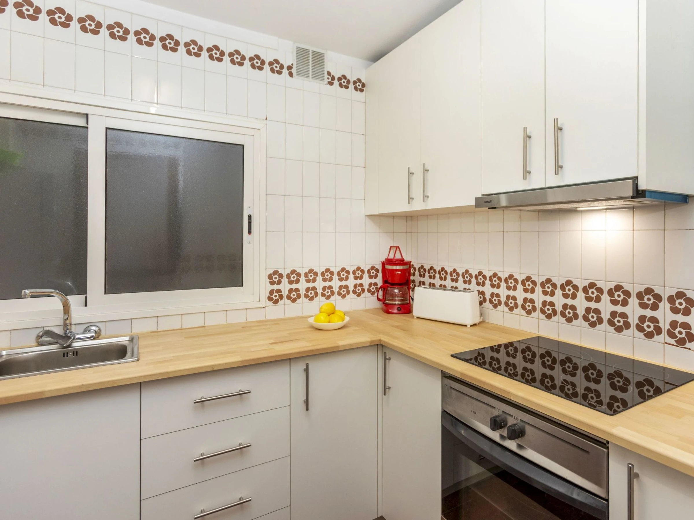 "Verd", 3-Zimmer-Wohnung 65 m2 im 5. Stock. Zweckmässig eingerichtet: Wohn-/Esszimmer mit Digital-TV. Ausgang zur Terrasse. 1 Zimmer mit 1 franz. Bett (150 cm, Länge 190 cm). Ausgang zur Terrasse. 1 Zimmer, ohne Fenster mit 1 x 2 Etagenbetten (90 cm, Länge 190 cm). Küche (Backofen, 4 Glaskeramikplatten, Toaster, Wasserkocher, Mikrowelle, elektrische Kaffeemaschine). Bad/Bidet/WC. Heizung. Grosse Terrasse. Terrassenmöbel. Herrliche Sicht auf das Meer. Zur Verfügung: Waschmaschine, Bügeleisen, Kinderhochstuhl, Babybett, Haartrockner. Bitte beachten: Nichtraucher-Unterkunft. TV nur ES. [hidden] // Reg. Nr.: ESFCTU00001701700010798100000000000000000[hidden]5