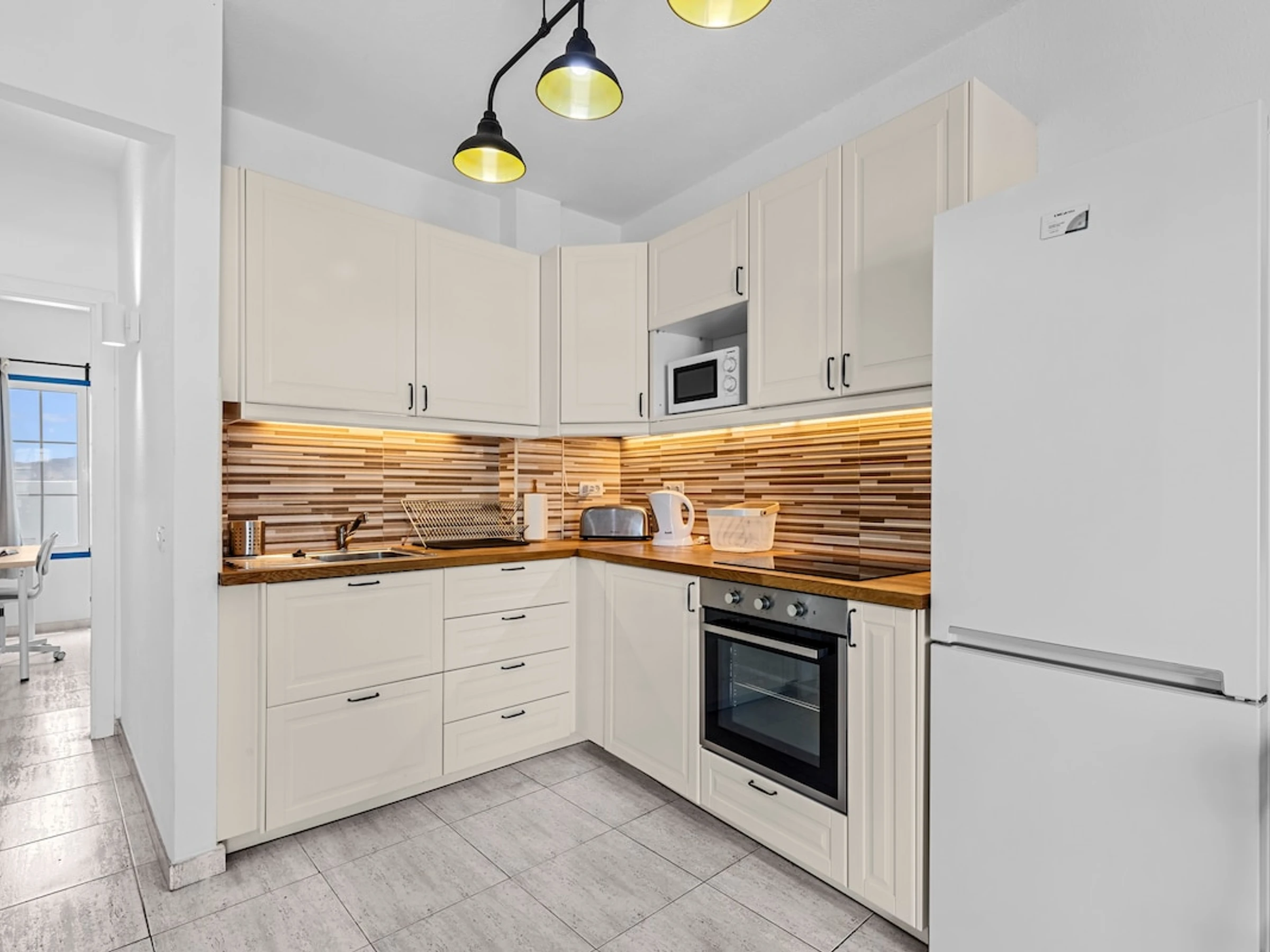Dieses küche, ist ausgestattet in mikrowelle, backofen, kochutensilien und kaffeemaschine.