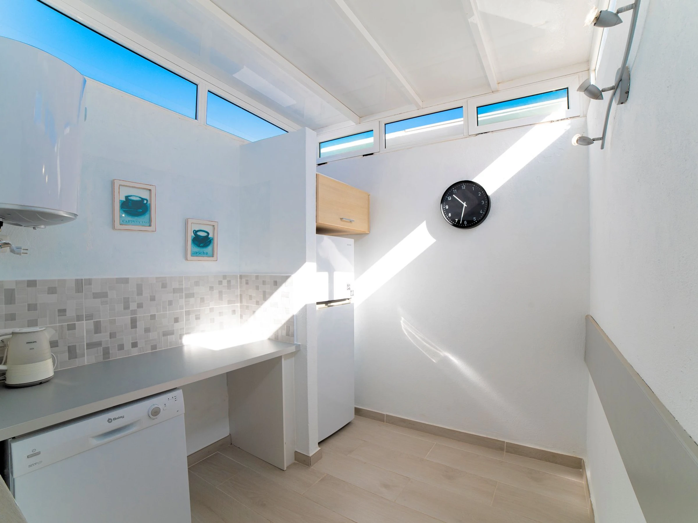Dieses küche, ist ausgestattet in kühlschrank, mikrowelle, backofen, gefrierschrank, spülmaschine, kaffeemaschine und wasserkocher.