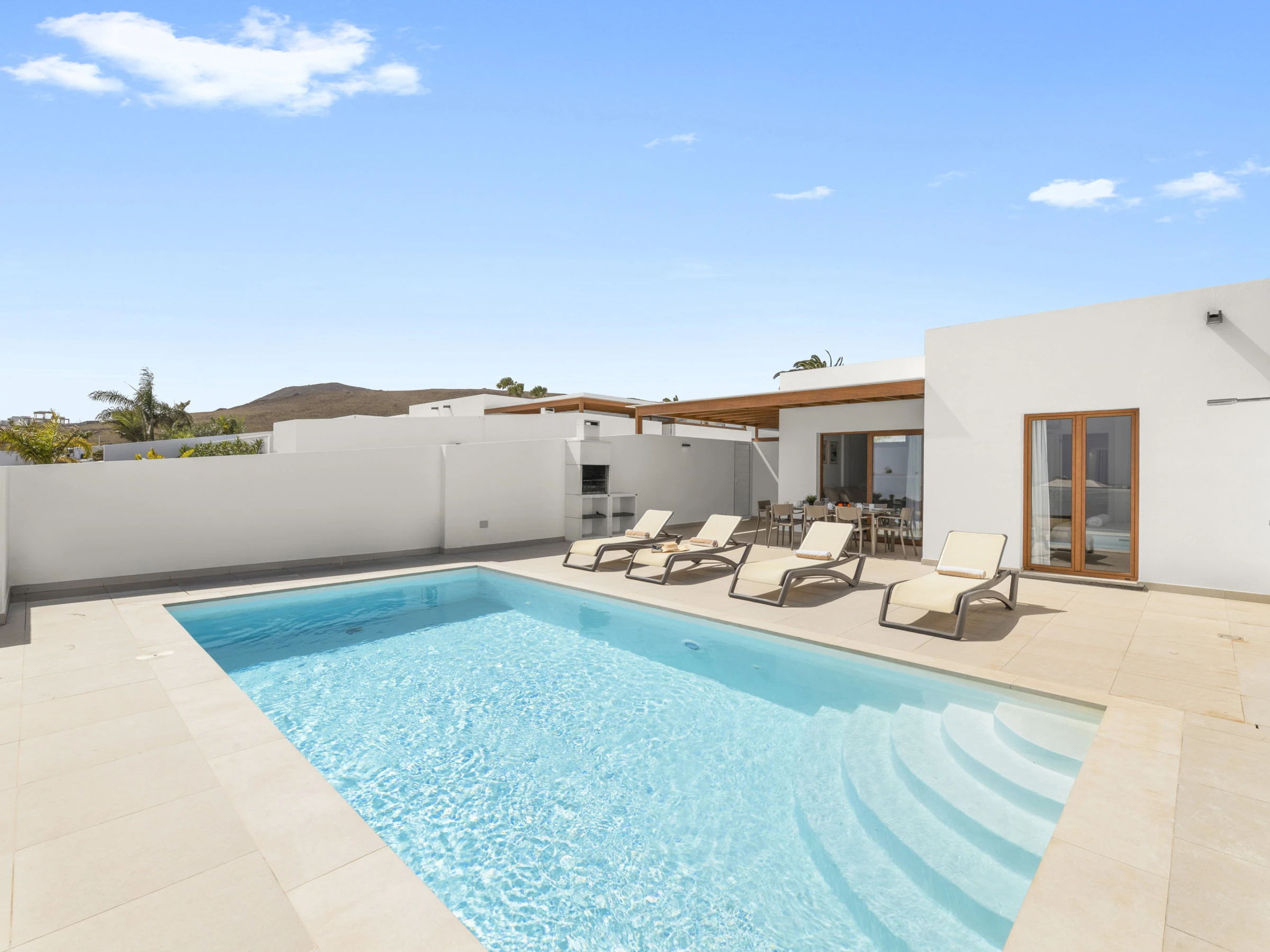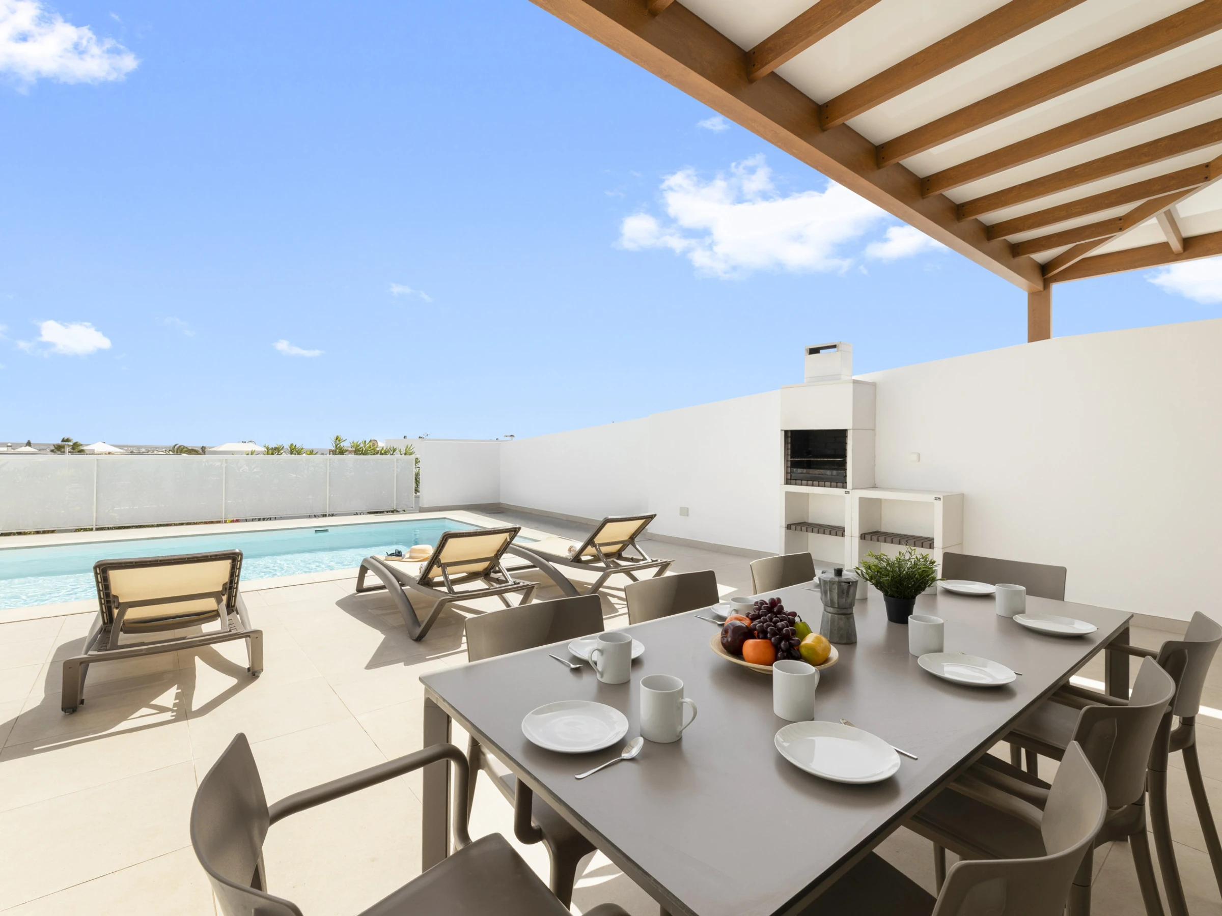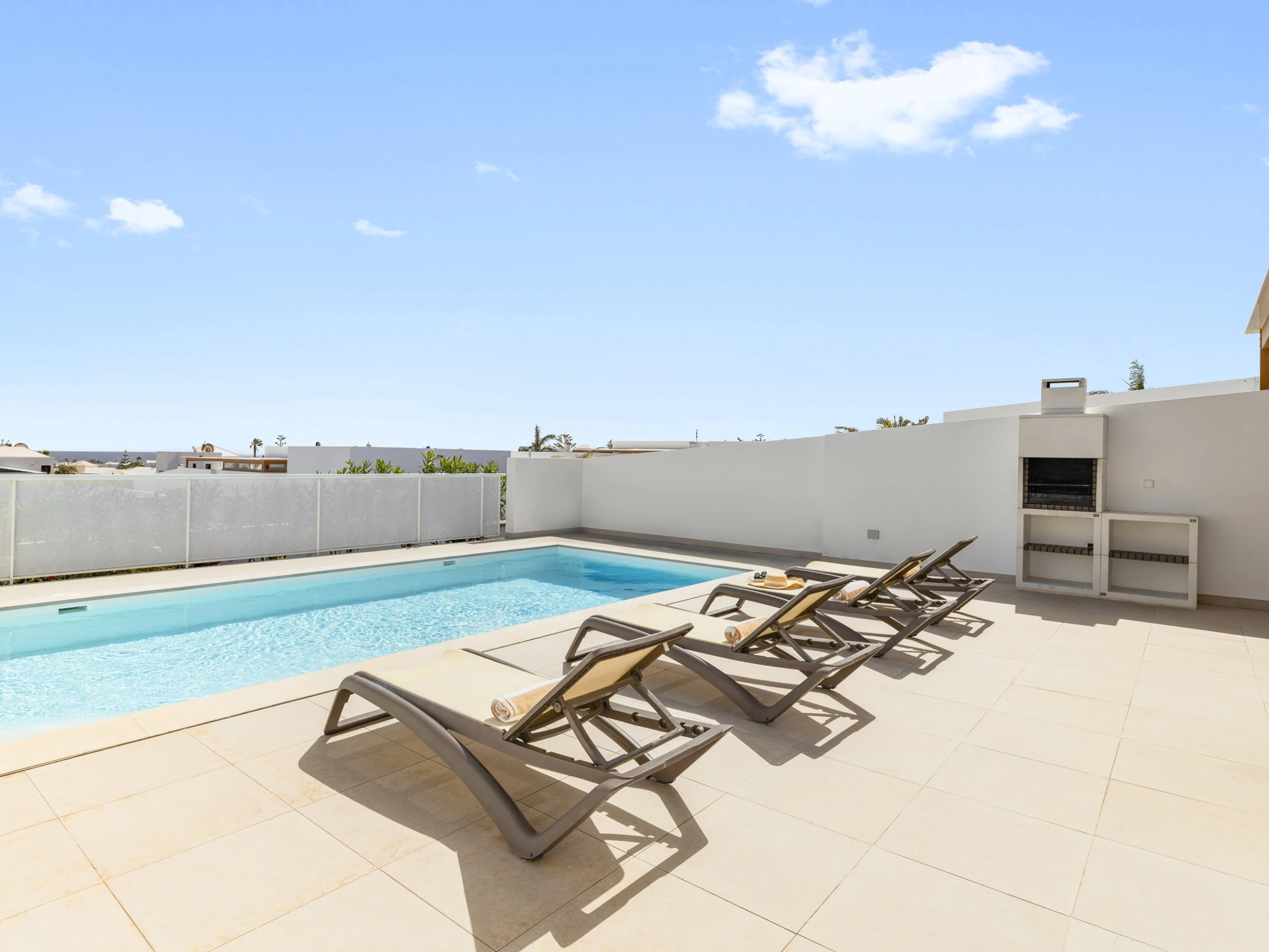 Die Außenbereiche sind ein wahres Treffpunkt, mit einem privaten Garten, der zur Entspannung und zu Gemeinschaftsmomenten einlädt. Die Villa verfügt über Gartenmöbel und einen perfekten Grill, um einzigartige Abende unter dem Himmel von Lanzarote zu genießen. Darüber hinaus verfügt sie über einen im Winter beheizten privaten Pool, der beeindruckende Ausblicke auf den Garten und die Umgebung bietet.