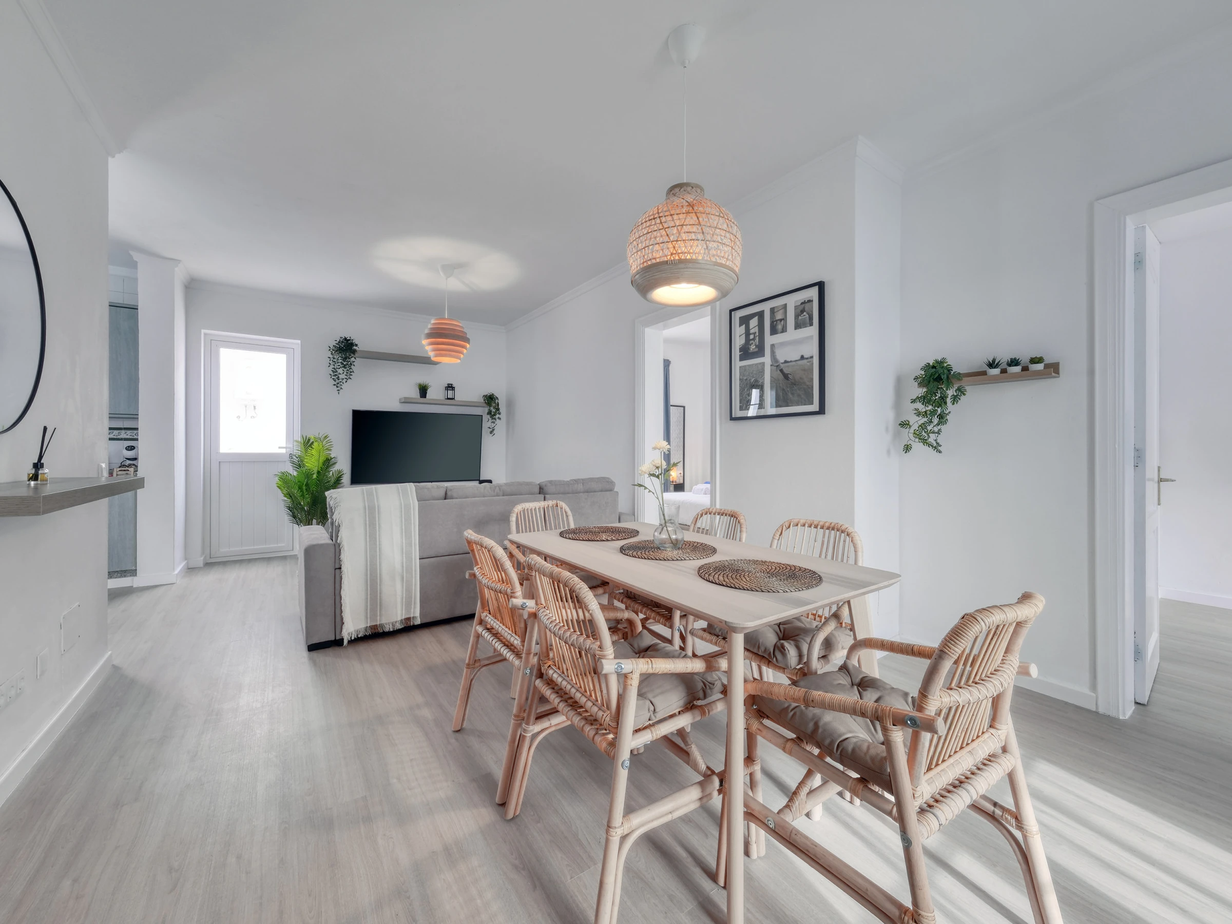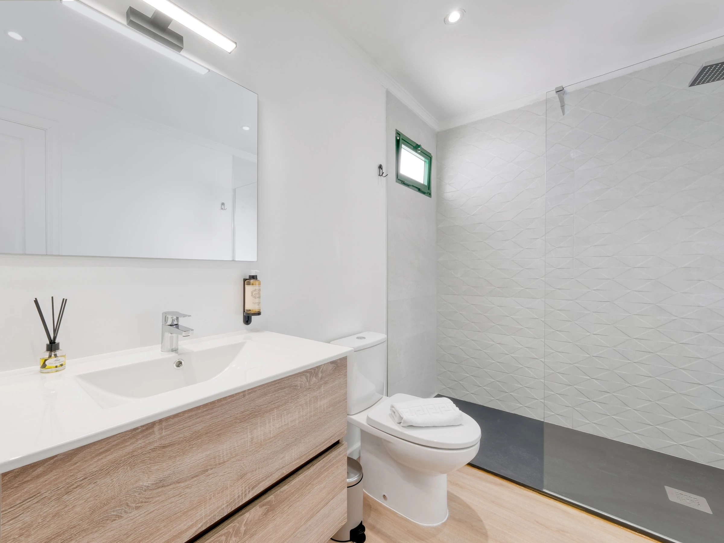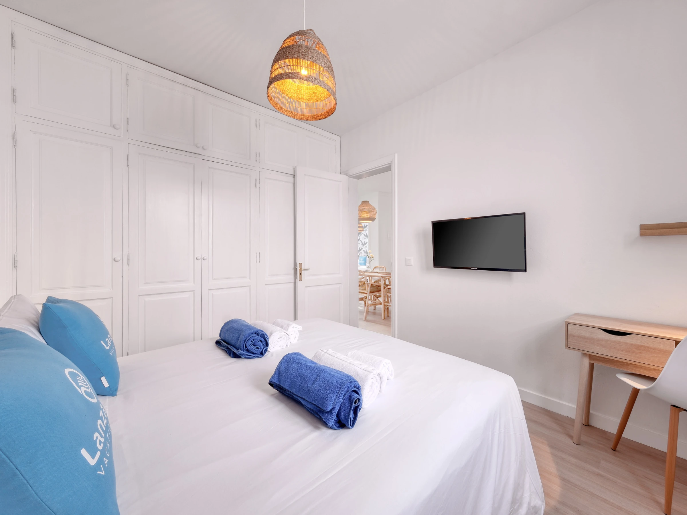 Das Haus verfügt über zwei elegante Schlafzimmer mit Traumdoppelbetten und ein drittes Schlafzimmer mit zwei Einzelbetten, die ideal für Kinder oder Freunde sind. Jeder Raum wurde sorgfältig gestaltet, um Komfort, Stil und Helligkeit zu kombinieren und eine warme und sophistizierte Atmosphäre zu schaffen.