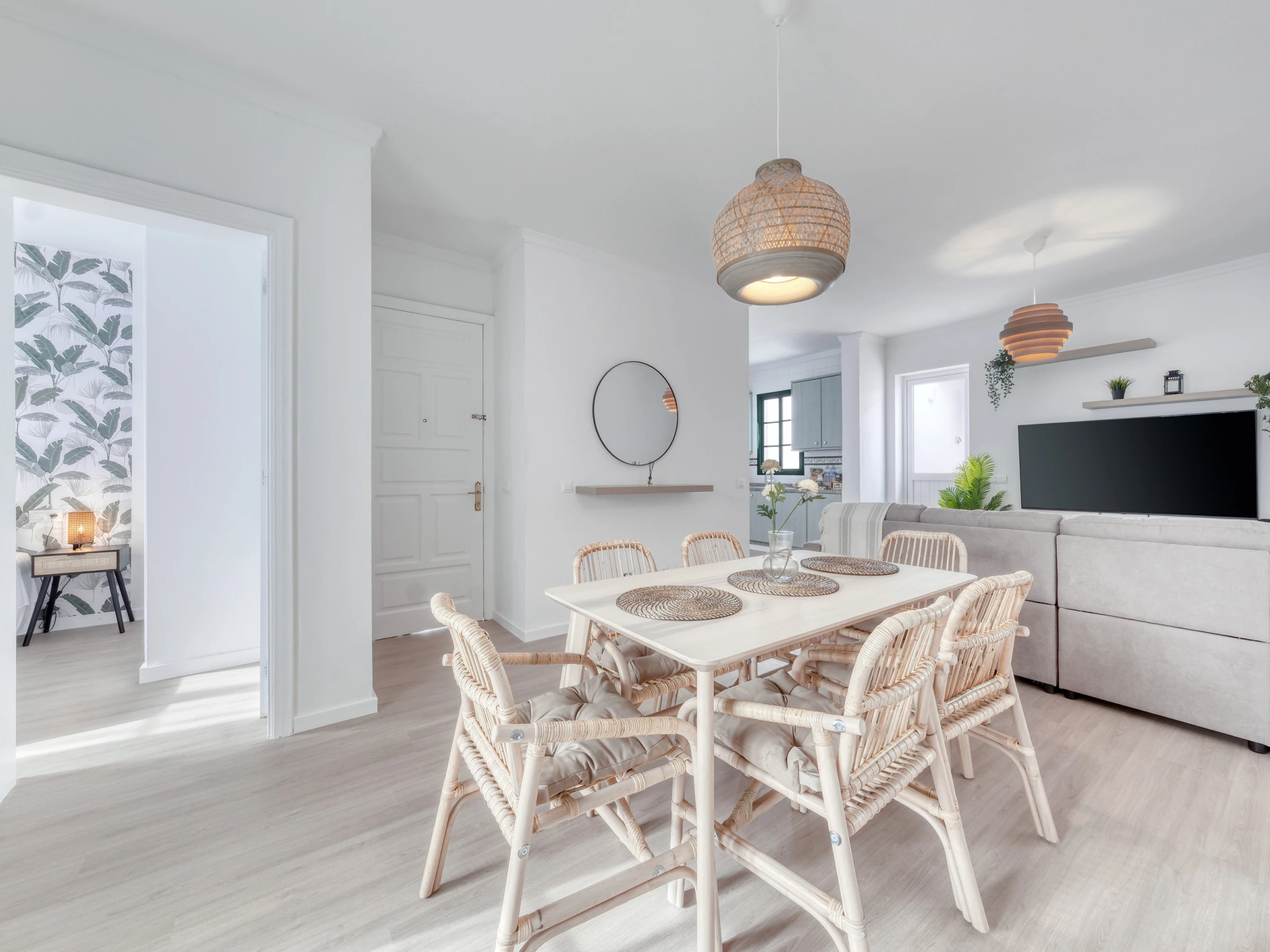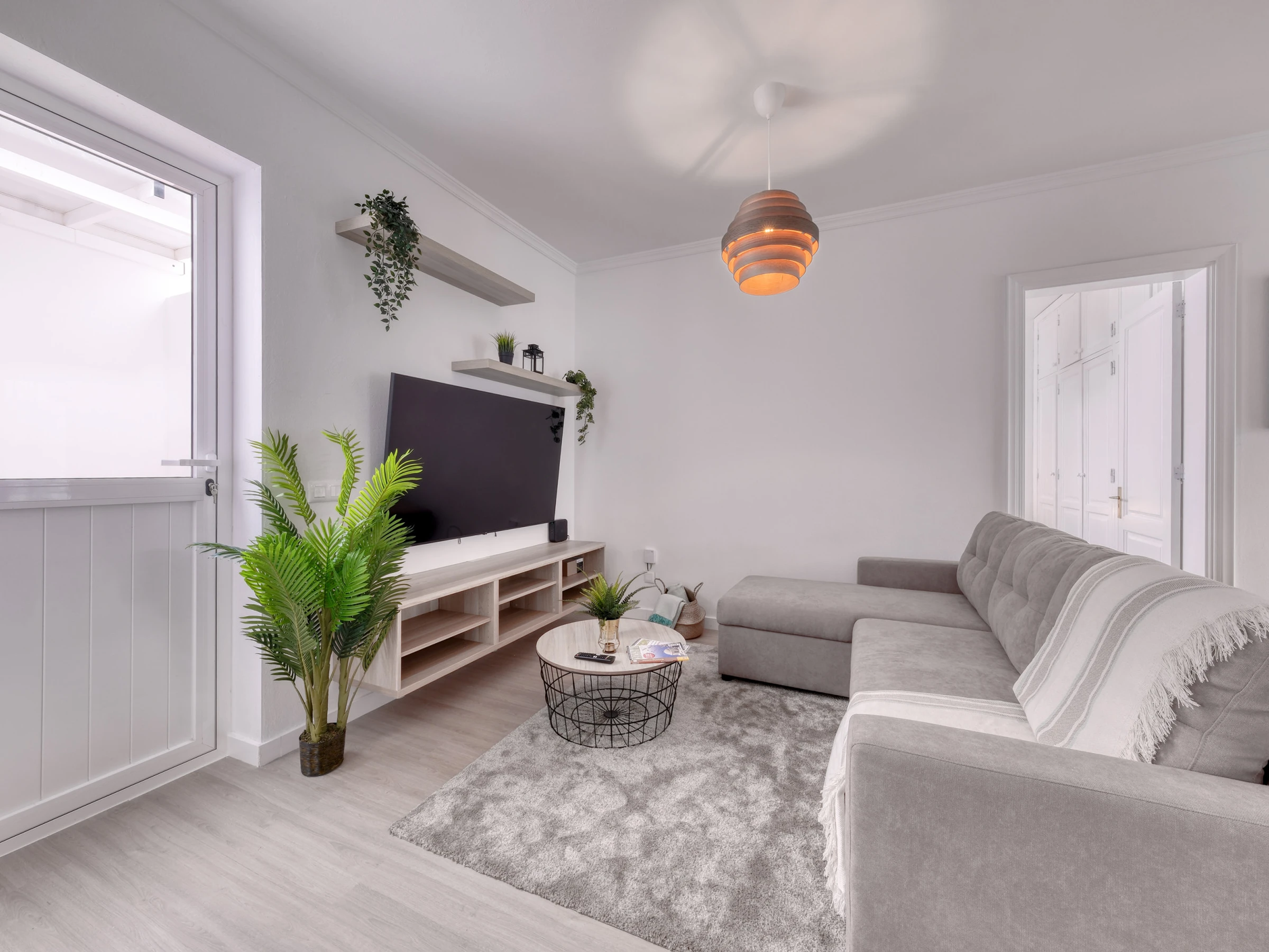 Entspanne dich in einem geräumigen und hellen Wohnzimmer mit Ecksofa und 4 Fernsehern mit Satelliten-TV in verschiedenen Sprachen, perfekt zum Ausruhen nach einem Tag Sonne und Strand.