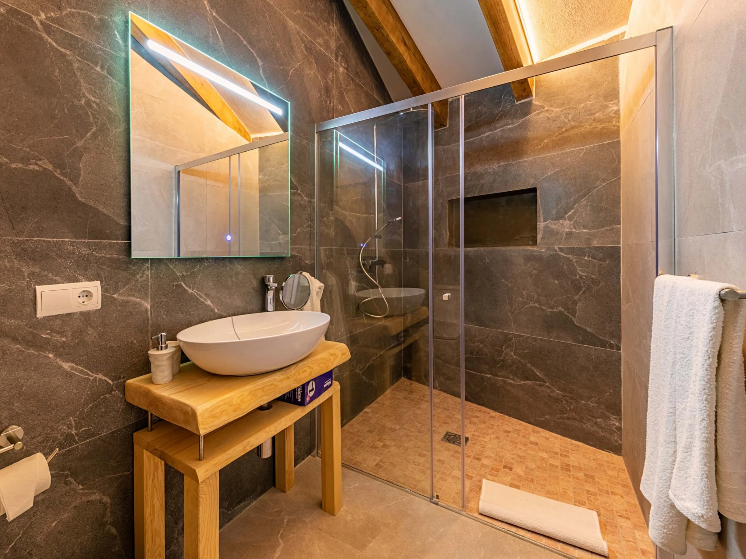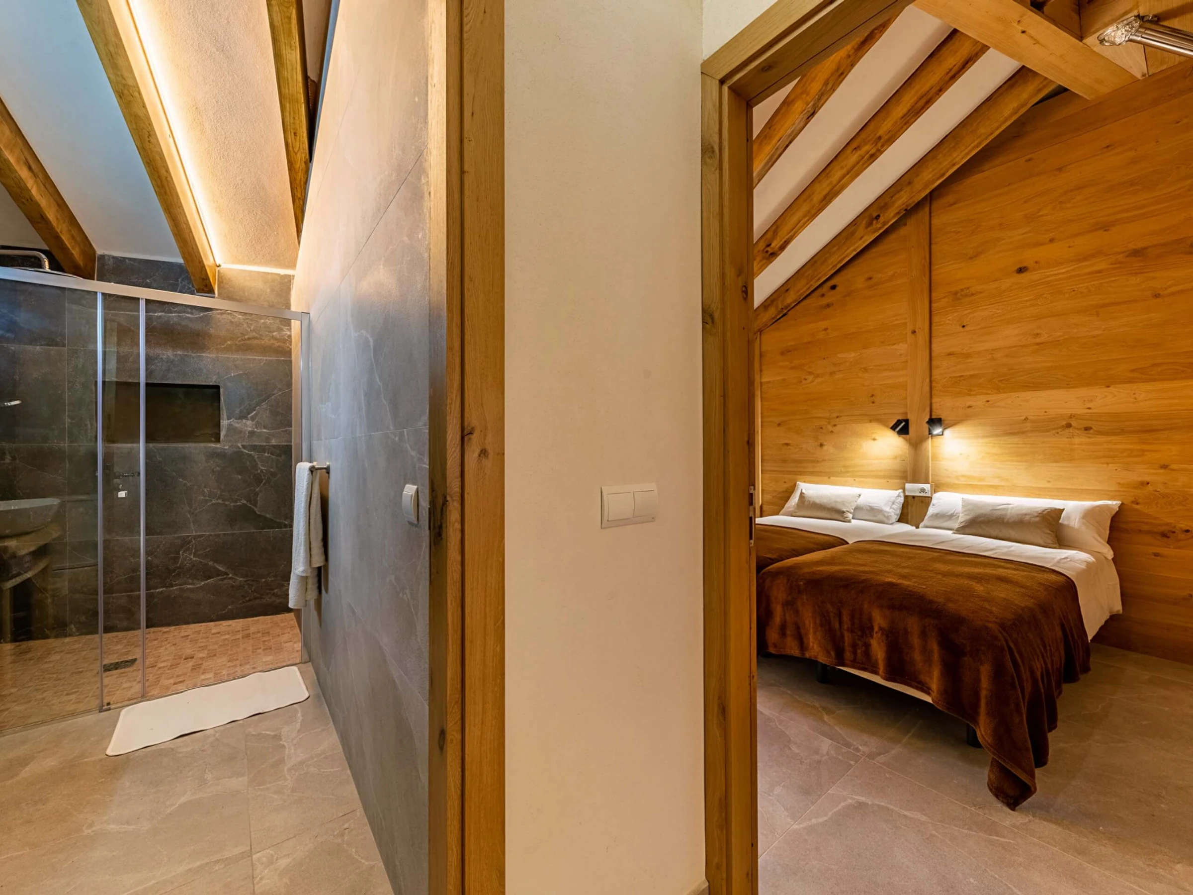 Im Erdgeschoss finden wir zwei geräumige Schlafzimmer, eines für Ehepartner und eines mit zwei Betten. Das Zimmer mit zwei Betten verfügt über ein Badezimmer mit Dusche. Das Sahnehäubchen ist der überdachte Balkon mit bequemen Sitzgelegenheiten, um die Aussicht auf das Dorf und die Bergkette zu genießen.