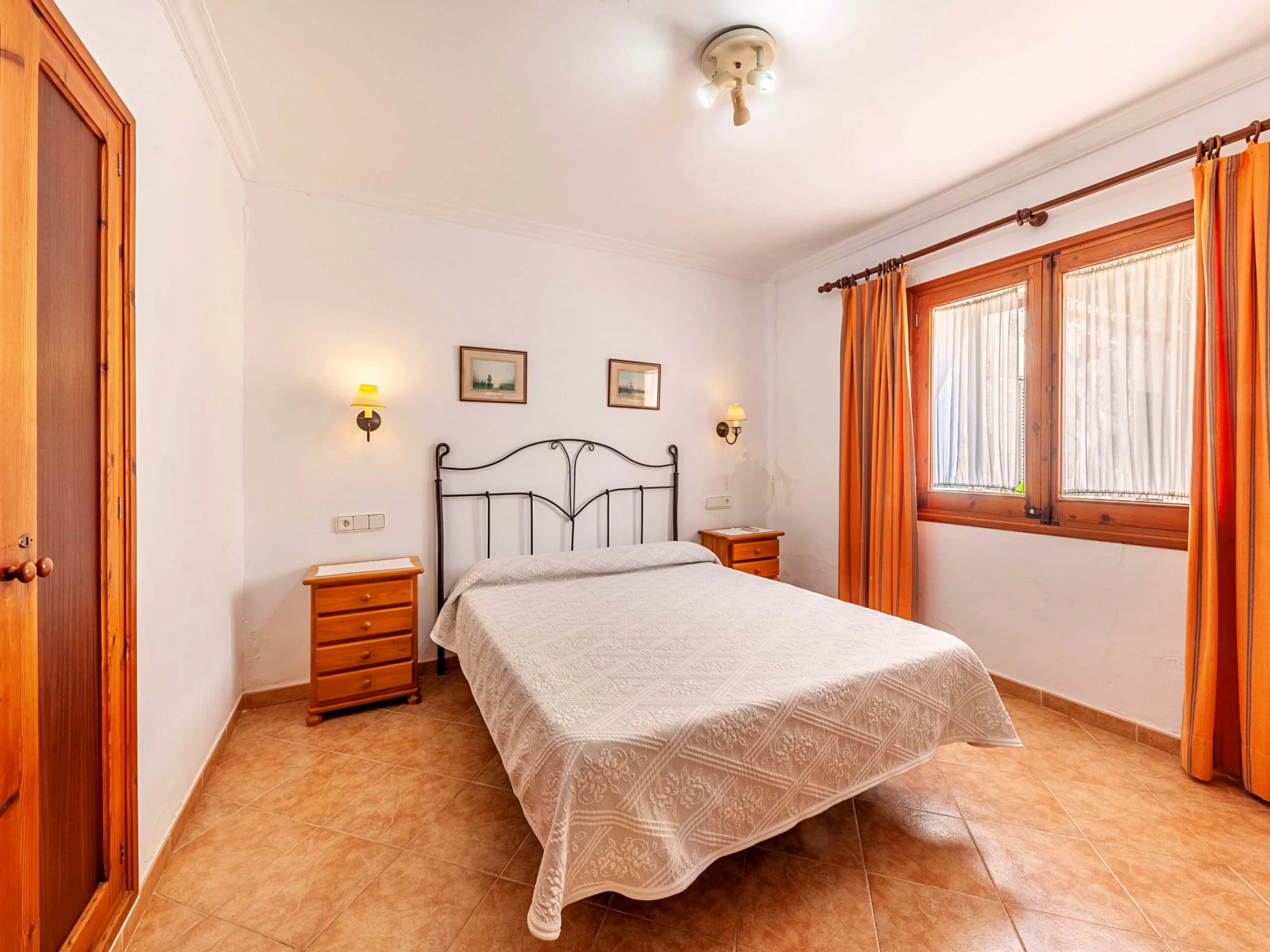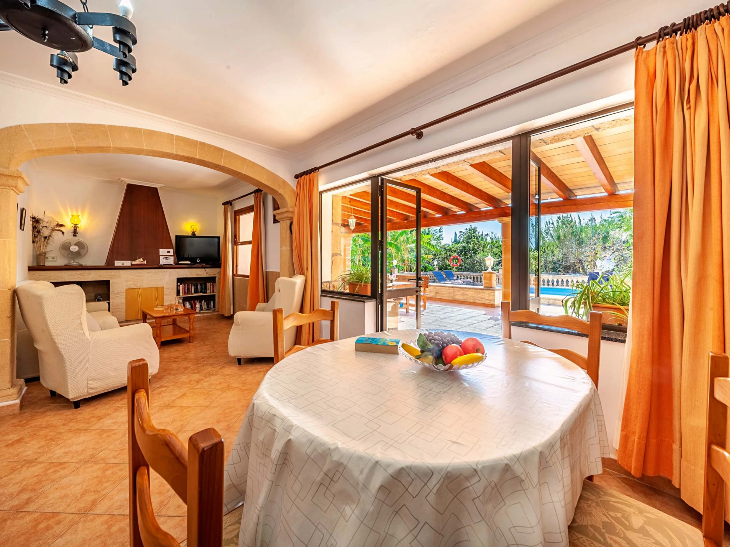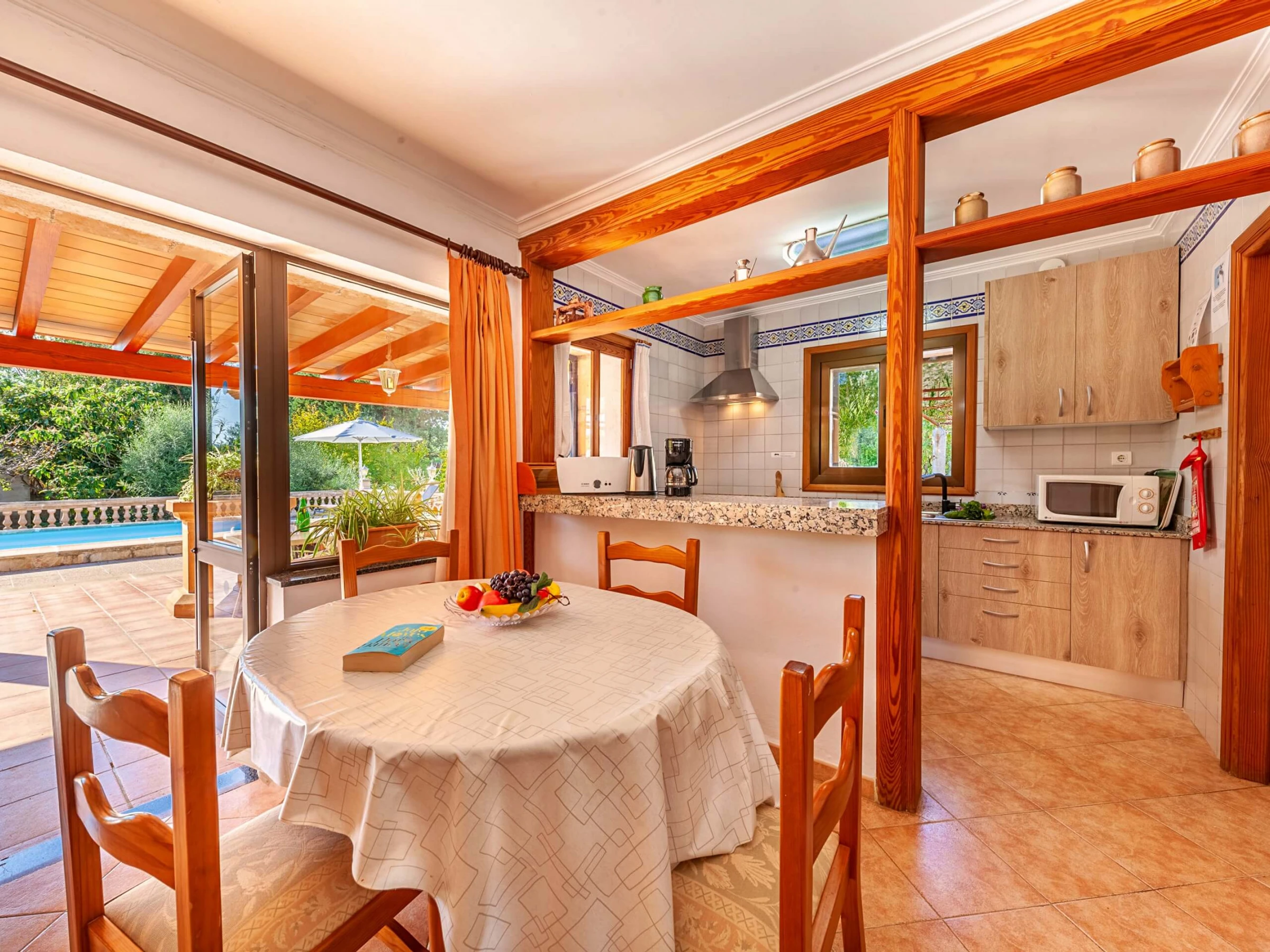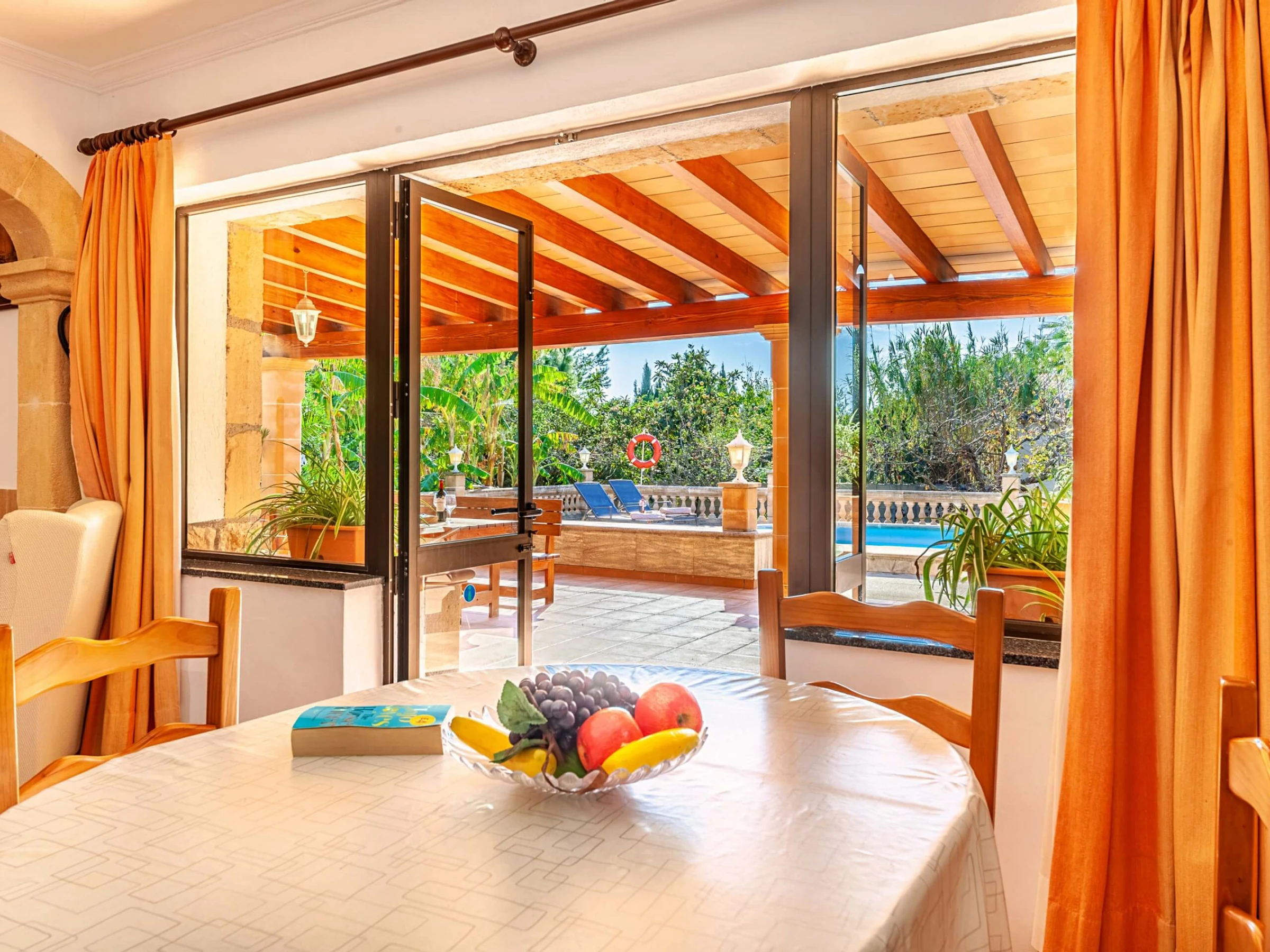 Im Inneren ist die Villa auf einer einzigen Etage verteilt. Der Eingang öffnet sich zu einem nützlichen Korridor, der in einen offenen Wohn-/Essbereich führt. Der Raum ist geräumig und hell, im traditionellen mallorquinischen Stil eingerichtet und durch einen traditionellen Steinbogen in zwei Hälften geteilt. Von beiden Bereichen aus öffnen große Französische Türen zu einer enormen überdachten Terrasse, die den Poolbereich überblickt. Sie ist an allen Seiten gepflastert und bietet klare Ausblicke. Außerhalb des Wohn-/Essbereichs befindet sich eine voll ausgestattete amerikanische Küche mit Speisekammer. Es gibt ein Zimmer mit zwei Einzelbetten und ein Doppelzimmer, und beide teilen sich ein Badezimmer mit Dusche.