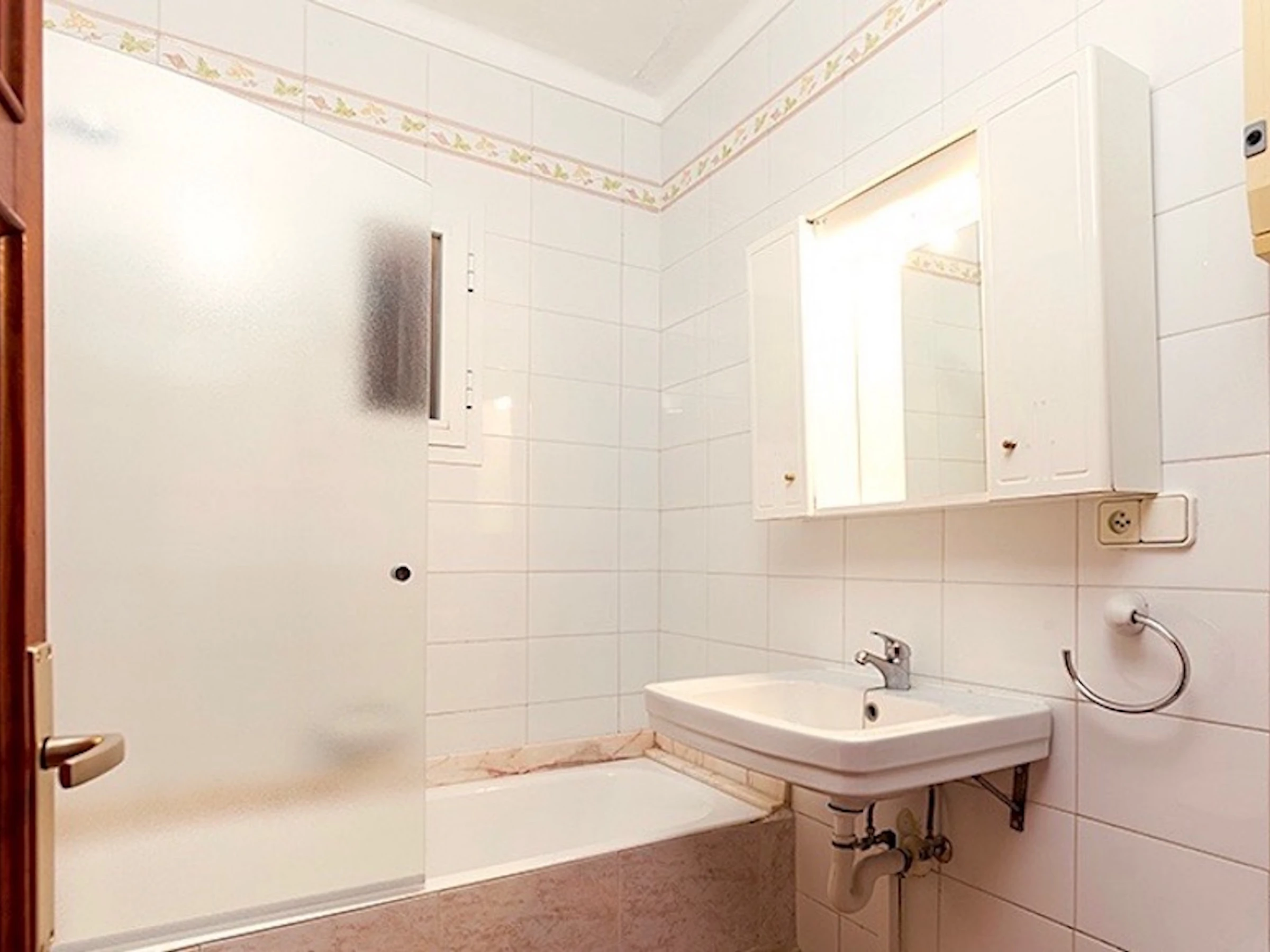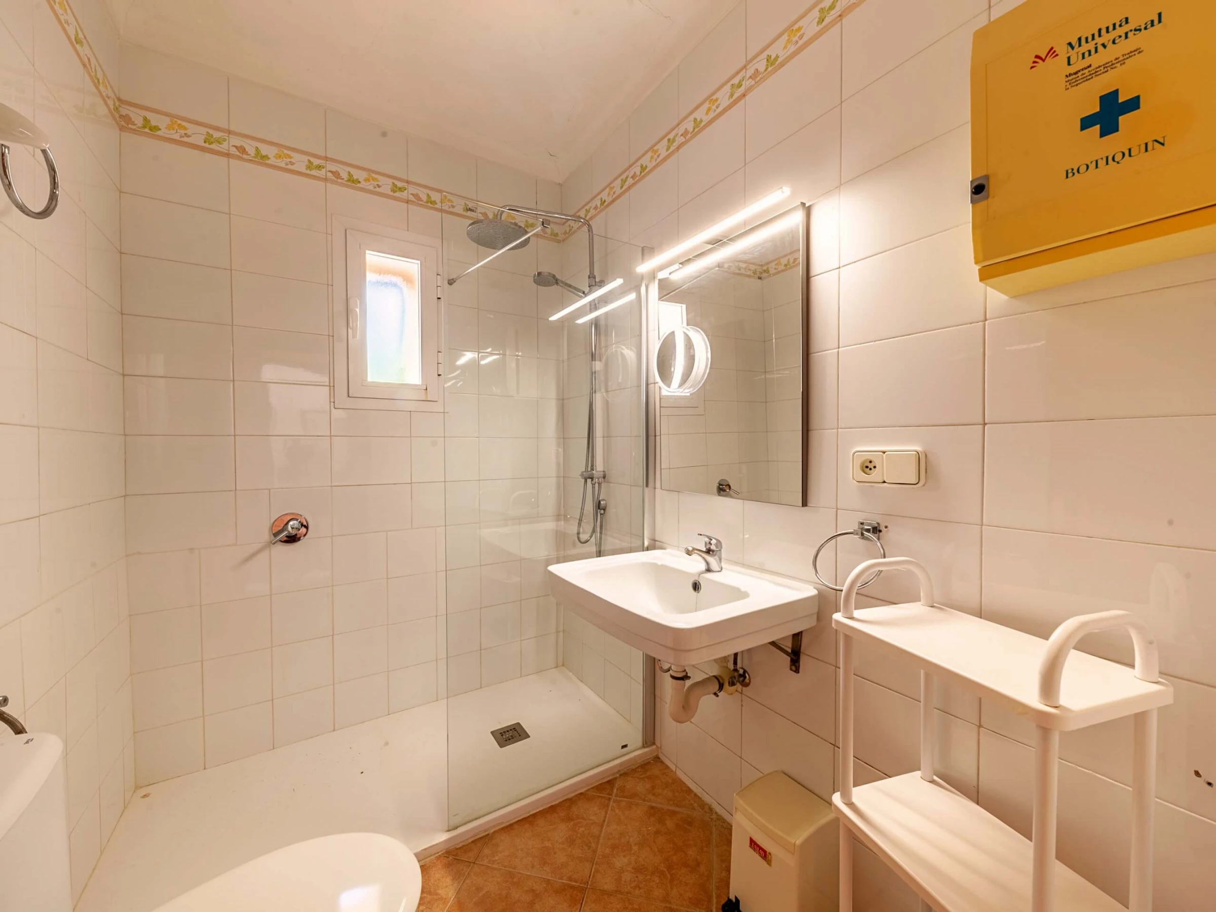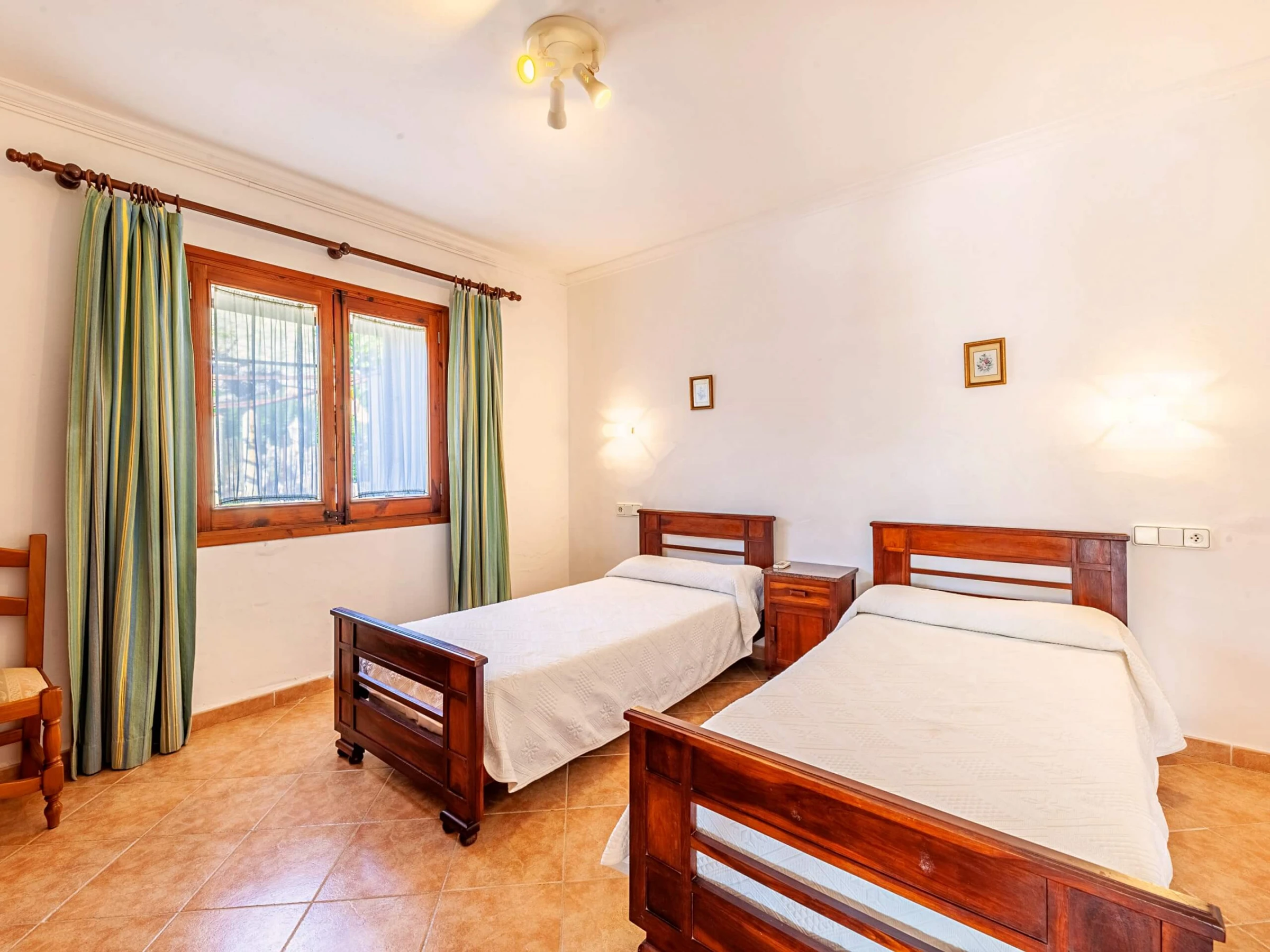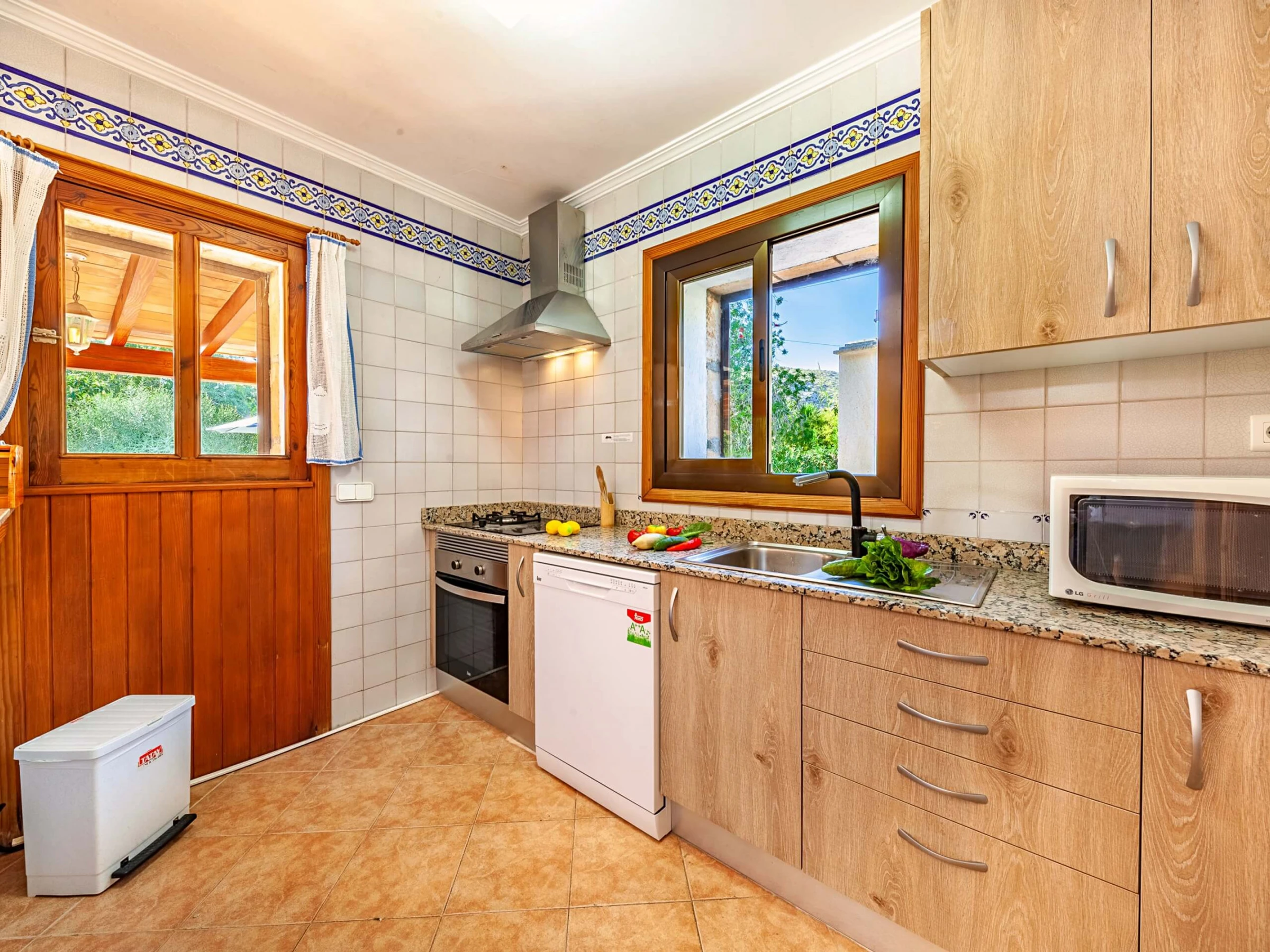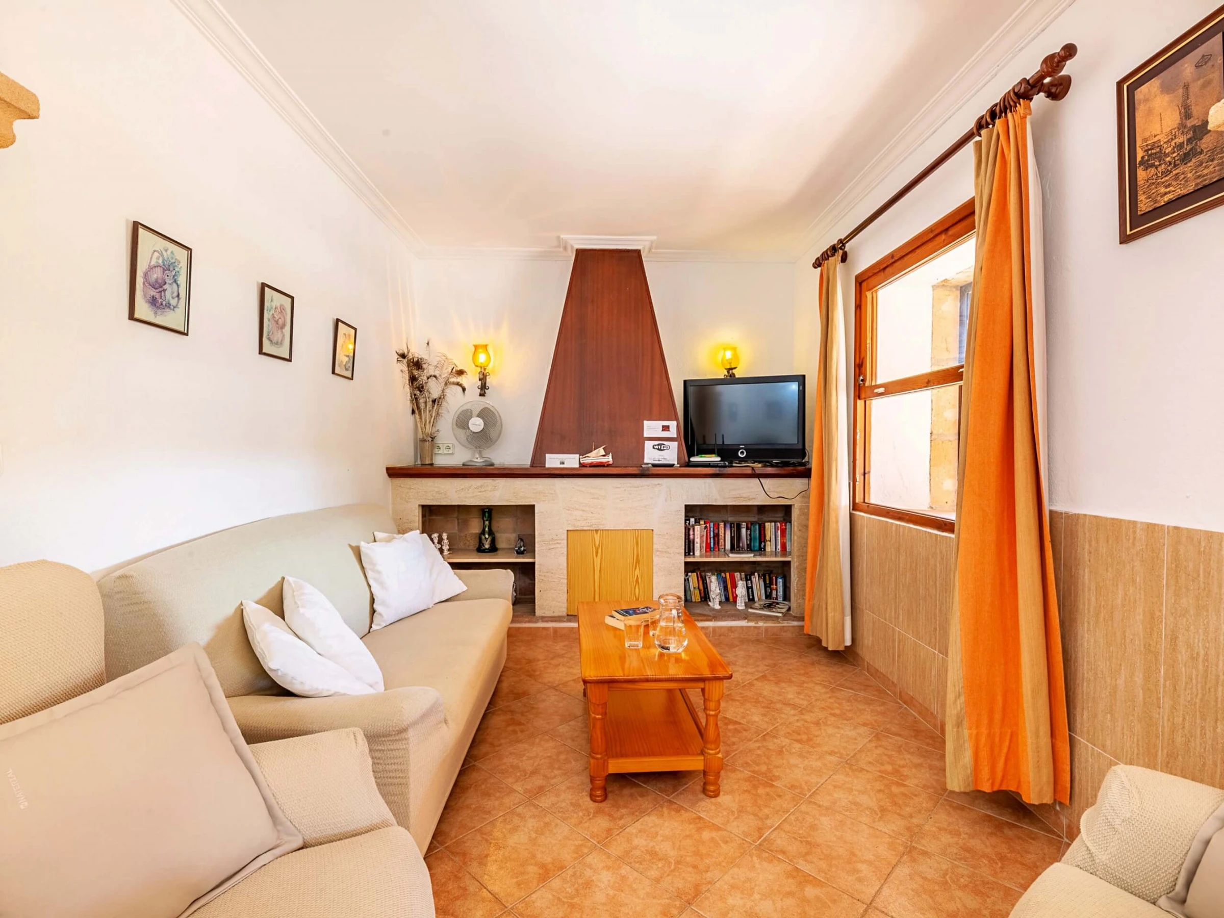 Im Inneren ist die Villa auf einer einzigen Etage verteilt. Der Eingang öffnet sich zu einem nützlichen Korridor, der in einen offenen Wohn-/Essbereich führt. Der Raum ist geräumig und hell, im traditionellen mallorquinischen Stil eingerichtet und durch einen traditionellen Steinbogen in zwei Hälften geteilt. Von beiden Bereichen aus öffnen große Französische Türen zu einer enormen überdachten Terrasse, die den Poolbereich überblickt. Sie ist an allen Seiten gepflastert und bietet klare Ausblicke. Außerhalb des Wohn-/Essbereichs befindet sich eine voll ausgestattete amerikanische Küche mit Speisekammer. Es gibt ein Zimmer mit zwei Einzelbetten und ein Doppelzimmer, und beide teilen sich ein Badezimmer mit Dusche.