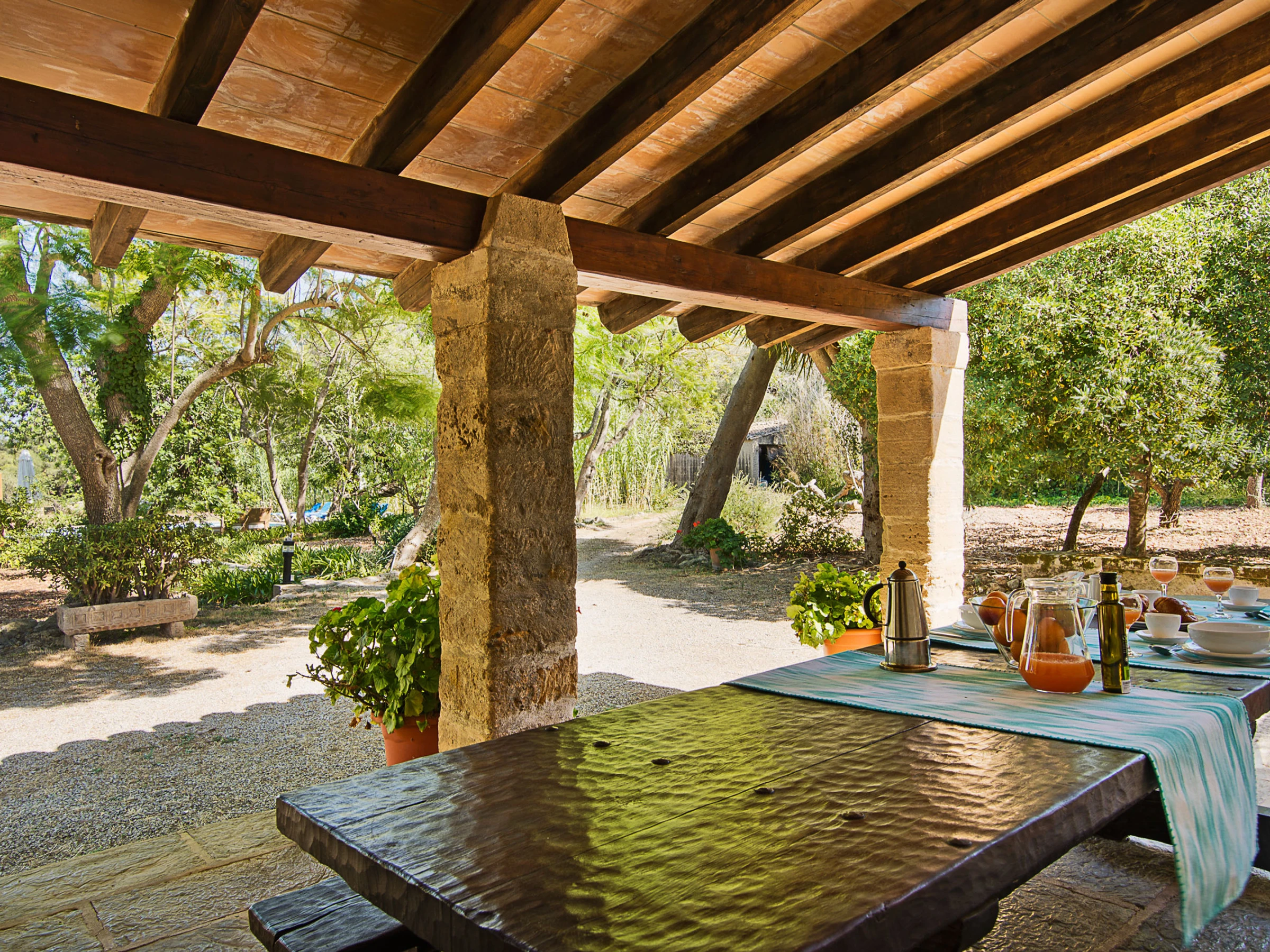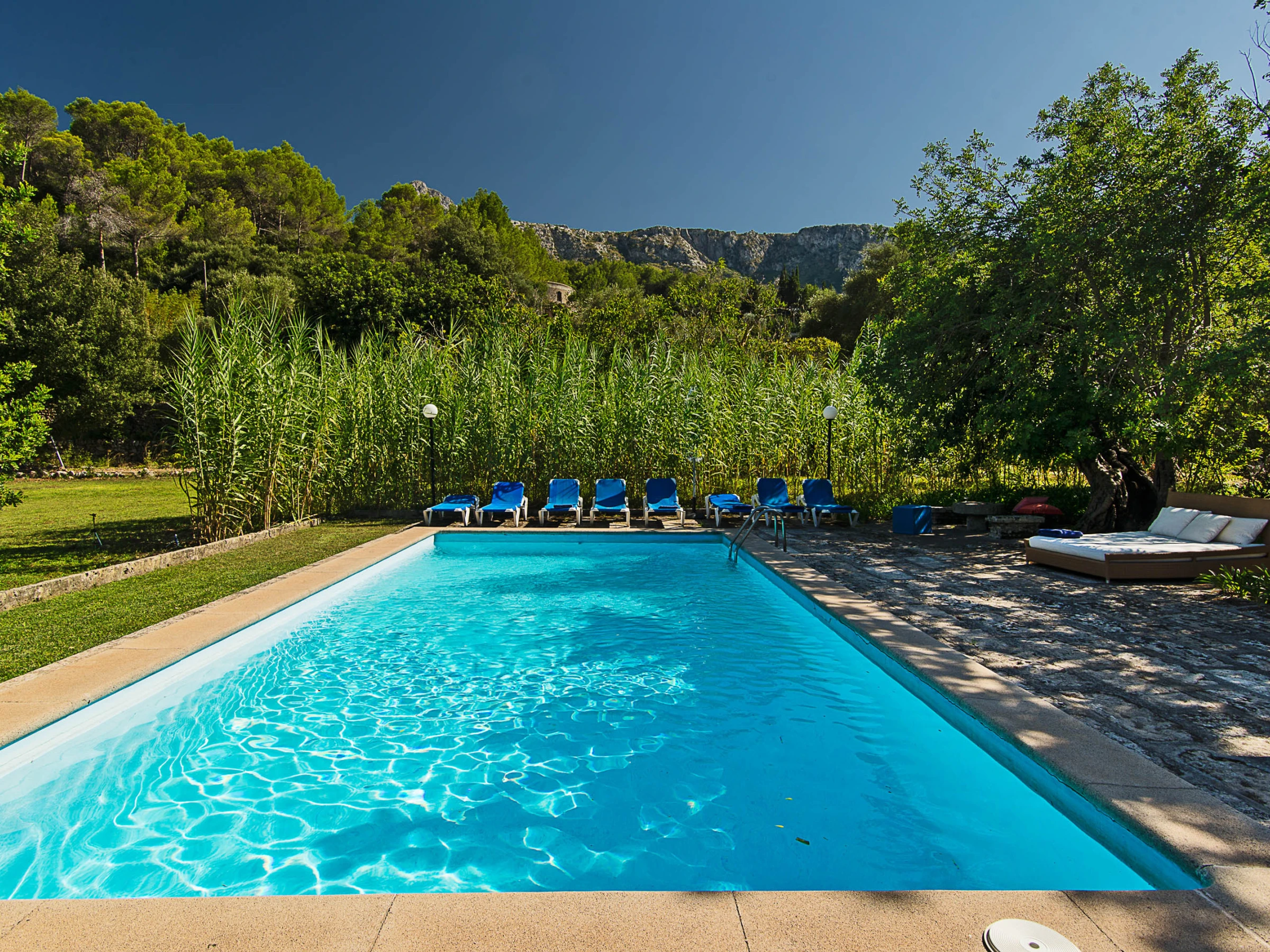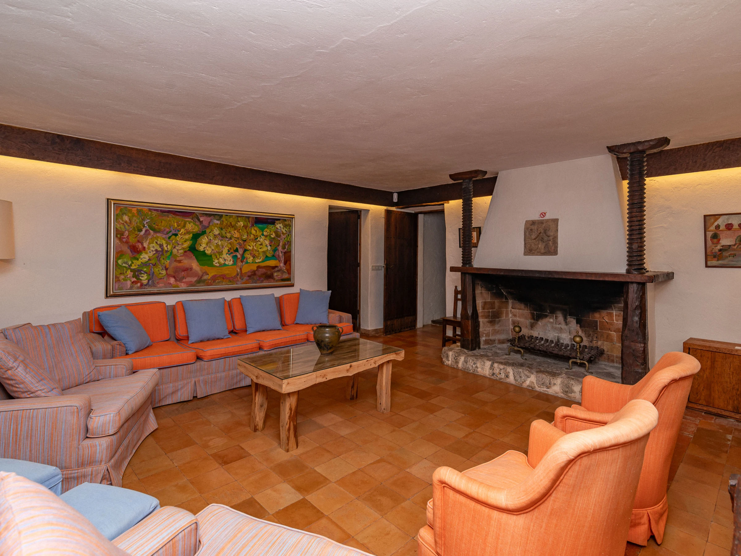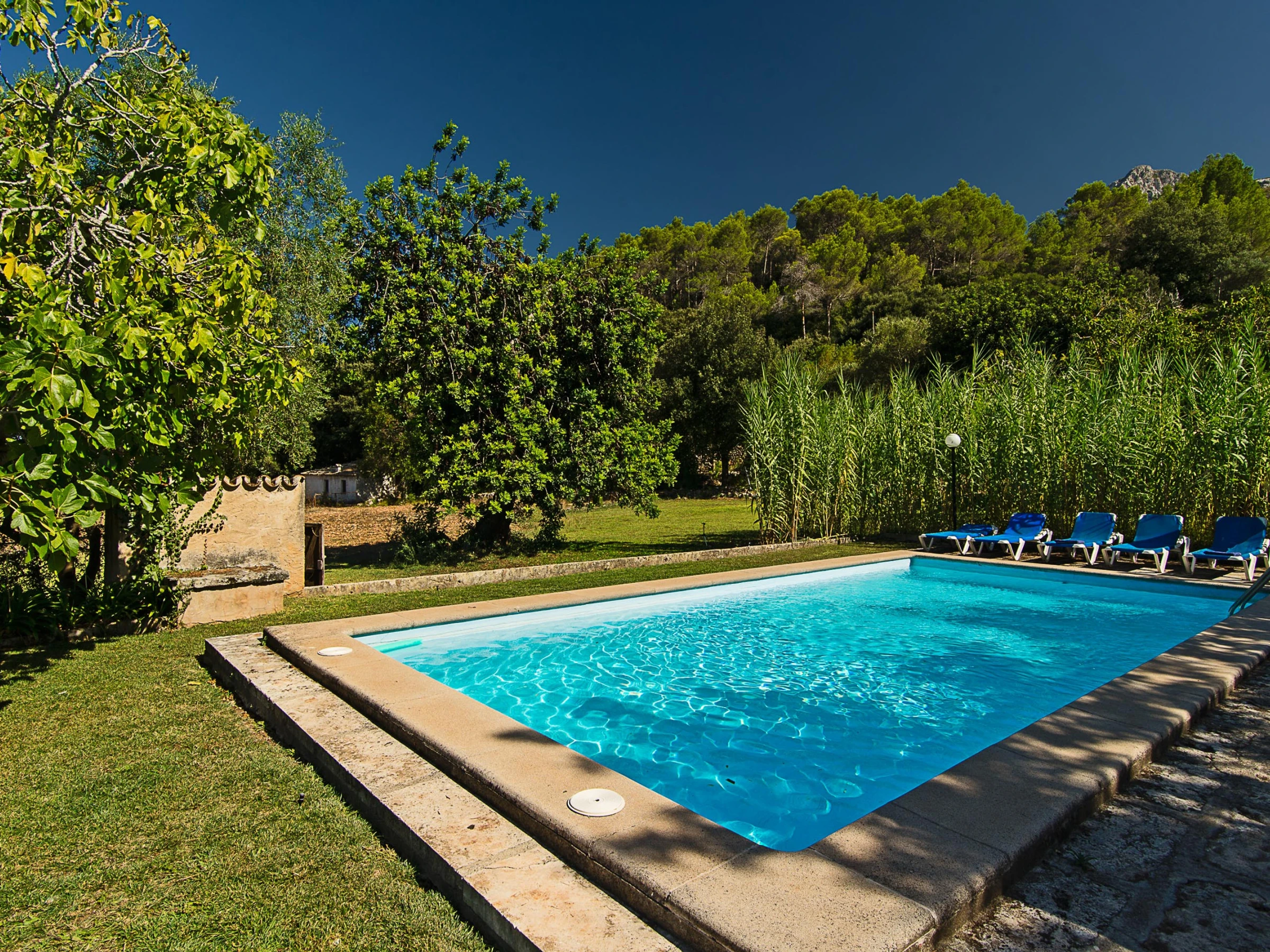 Im Freien gibt es eine überdachte Terrasse und eine charmante Poolzone, von der aus man wunderschöne Ausblicke auf die Umgebung genießen kann. Eine Rasenfläche und ein typischer Steininnenhof umgeben den Pool. Es ist ein wirklich idyllischer Ort, um sich zu entspannen oder das sanfte mallorquinische Klima in völliger Ruhe und Privatsphäre zu genießen.