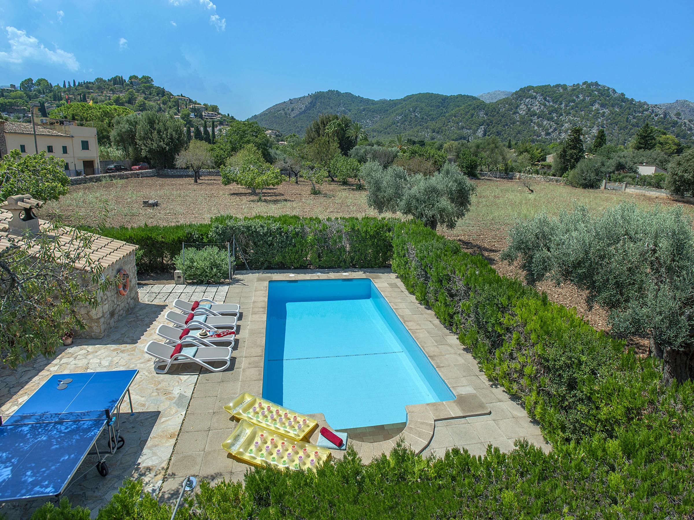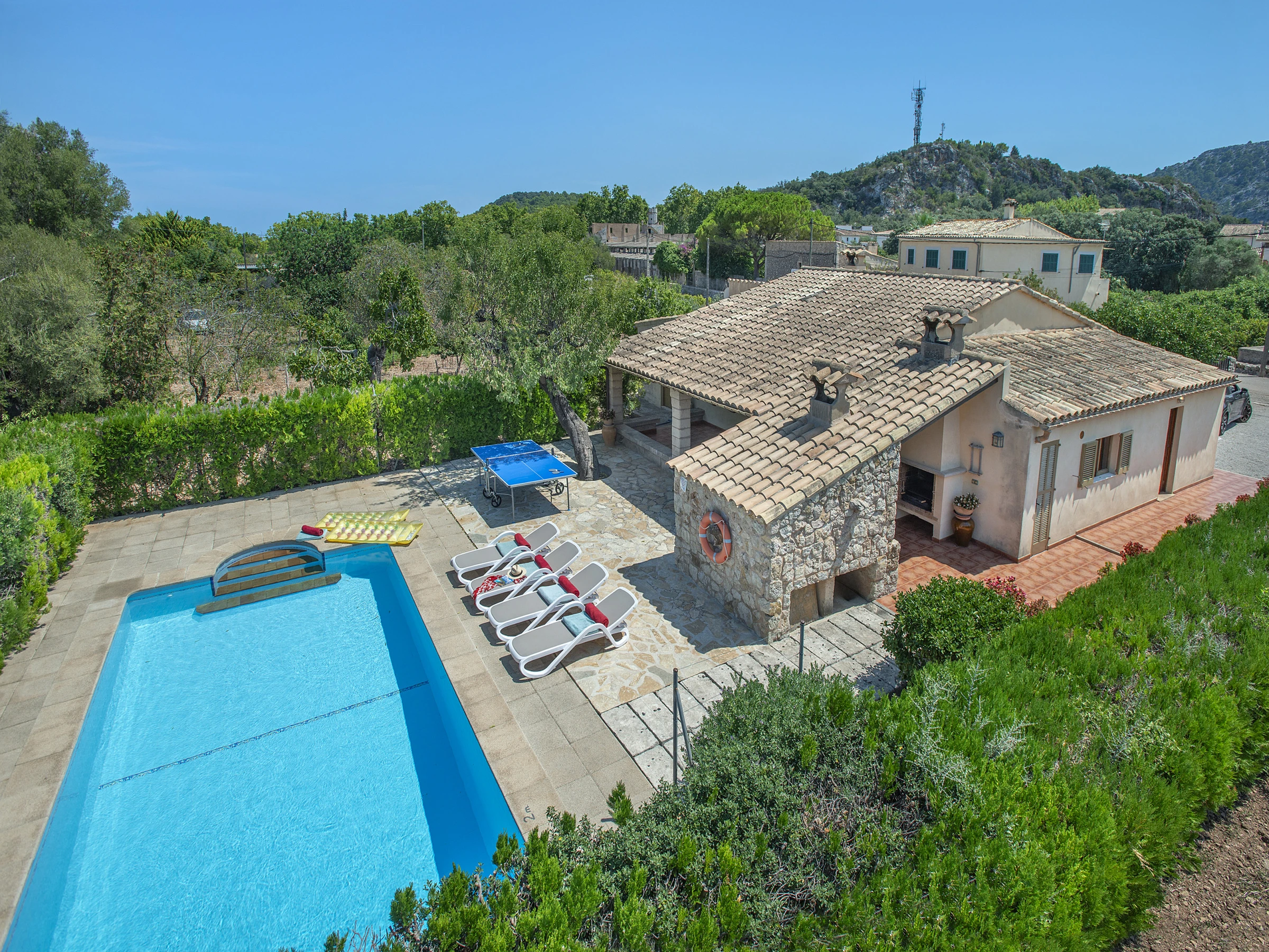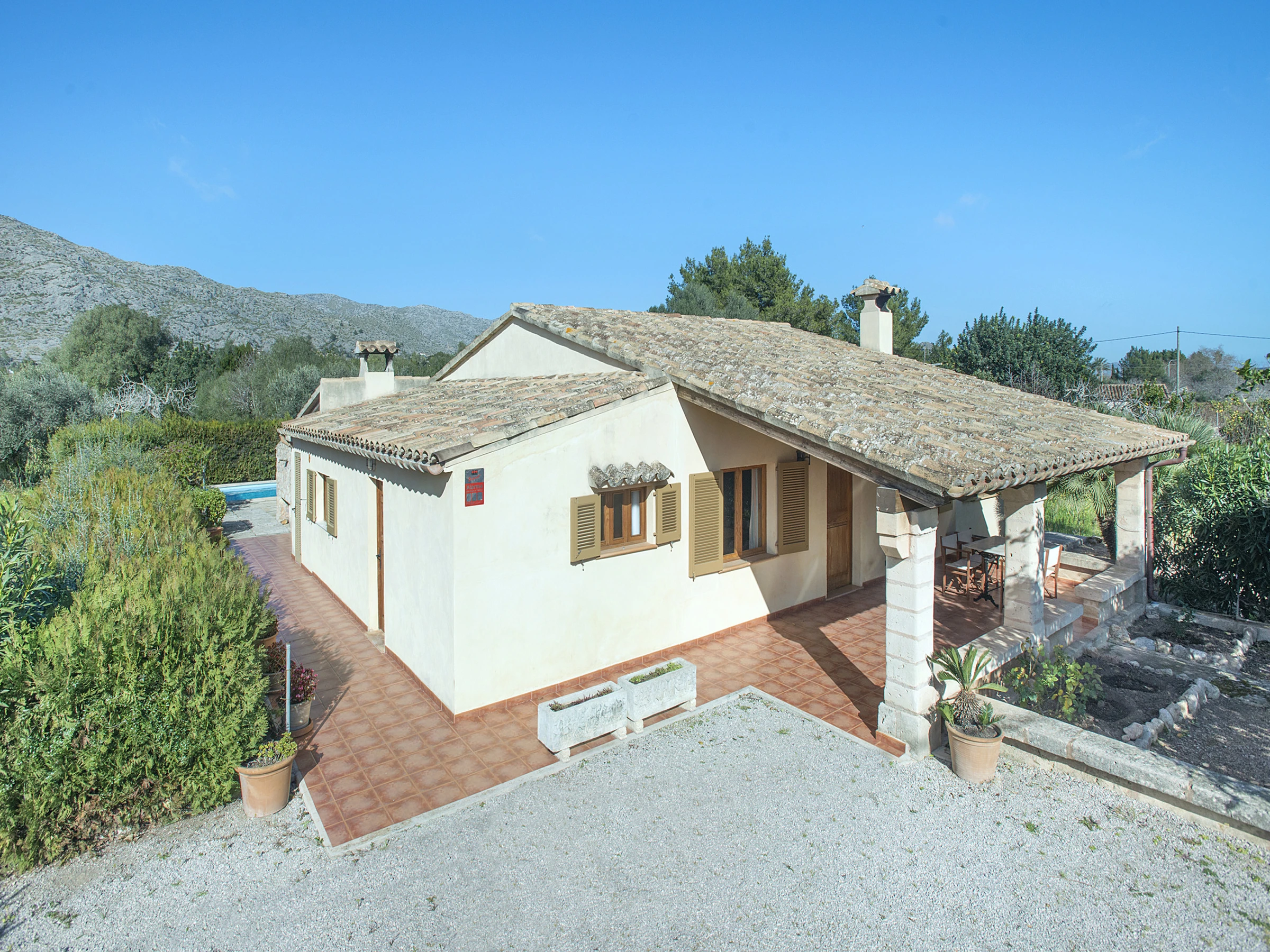 Von der Küche aus gelangen Sie auf die große Terrasse mit überdachtem Essbereich, einem Grillplatz und einem privaten Pool mit Blick auf die Berge von Pollença. Im Außenbereich gibt es zudem ein komplettes Bad mit Dusche – ideal für Pooltage.