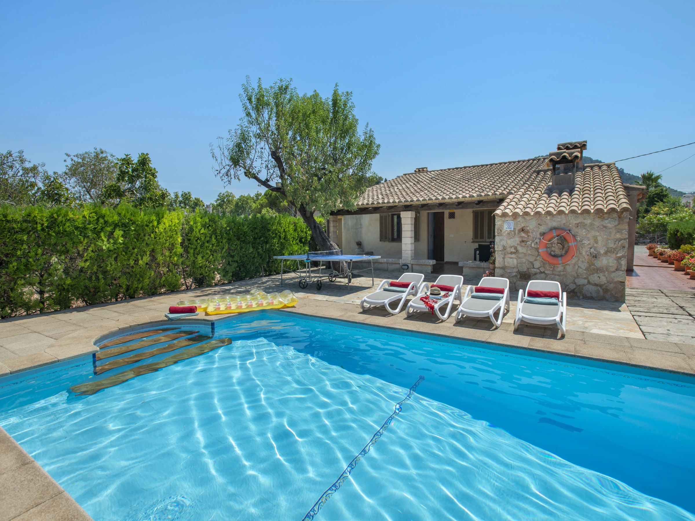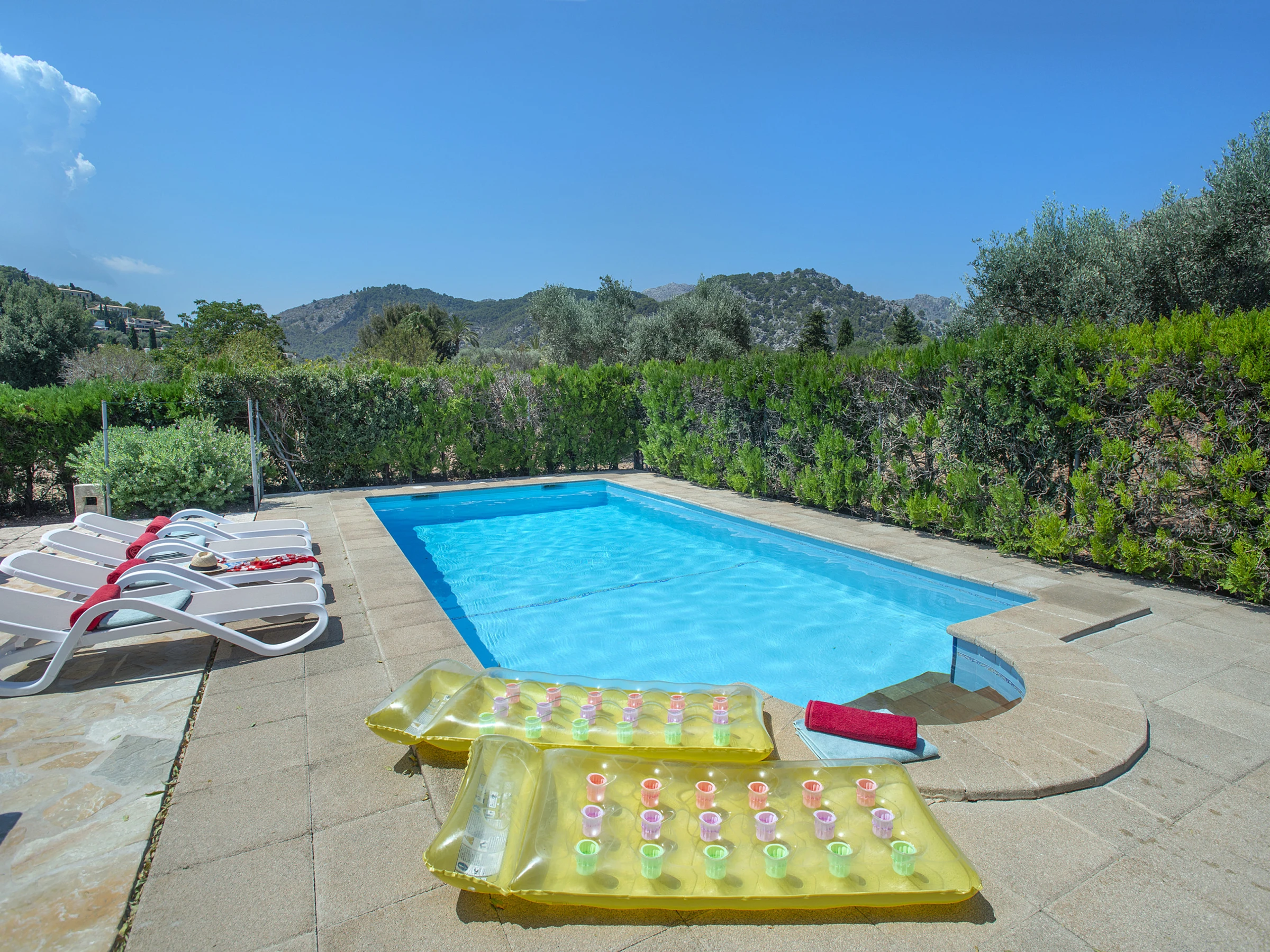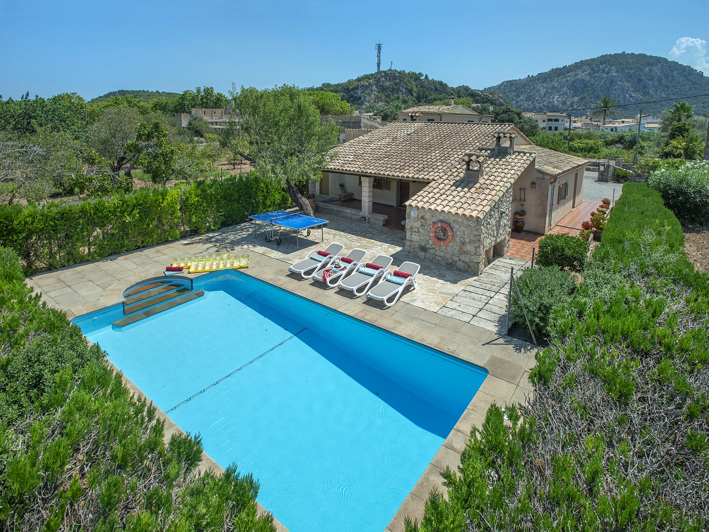 Von der Küche aus gelangen Sie auf die große Terrasse mit überdachtem Essbereich, einem Grillplatz und einem privaten Pool mit Blick auf die Berge von Pollença. Im Außenbereich gibt es zudem ein komplettes Bad mit Dusche – ideal für Pooltage.