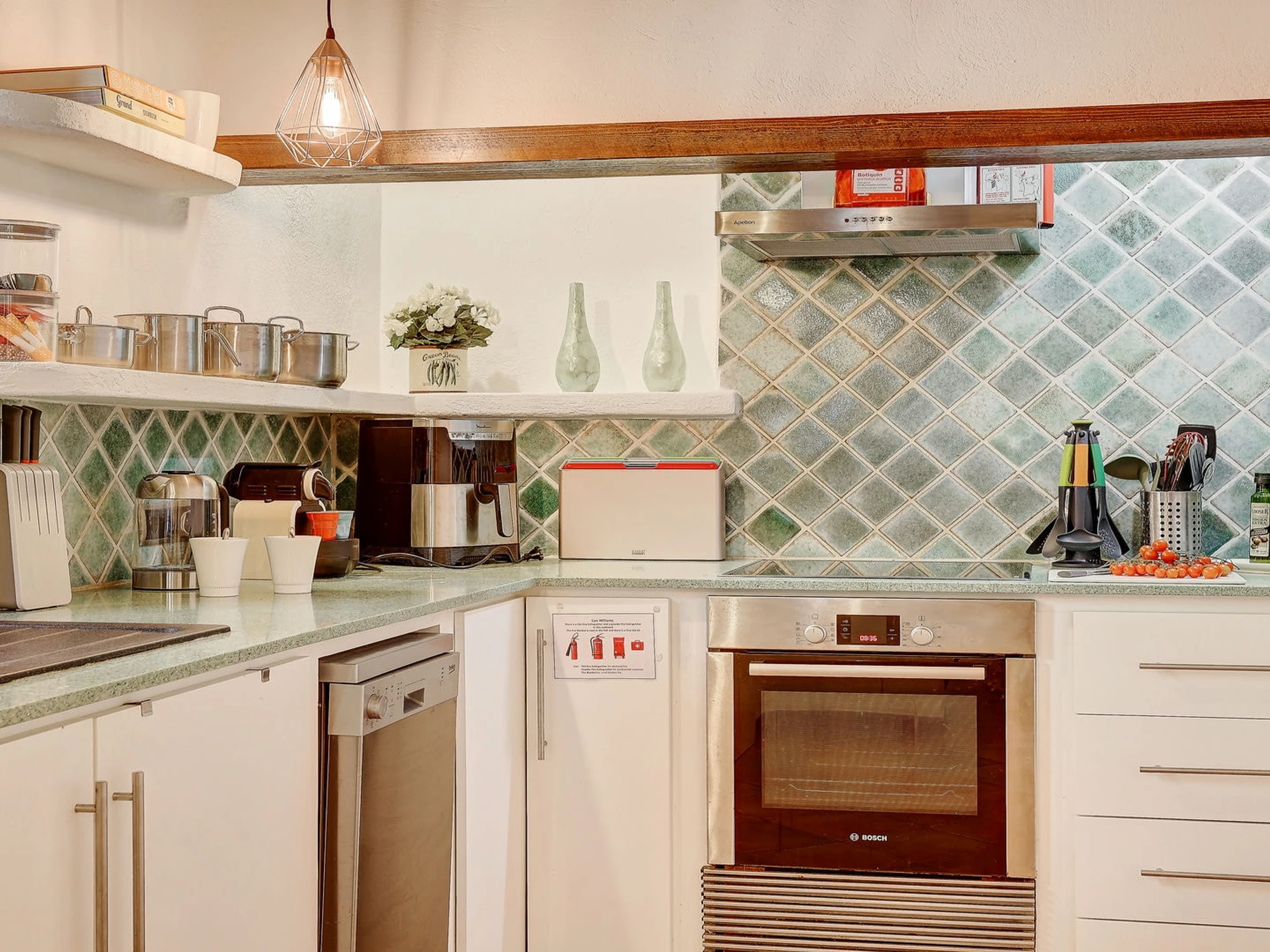 Das Erdgeschoss ist offen gestaltet. Es verfügt über eine gut bemessene Küche mit einer Frühstückstheke und sehr cooler Beleuchtung. Sie ist gut ausgestattet mit einer Spülmaschine, einer Heißluftfritteuse, einem Wasserkocher, einem Toaster und einer Nespresso-Kaffeemaschine!