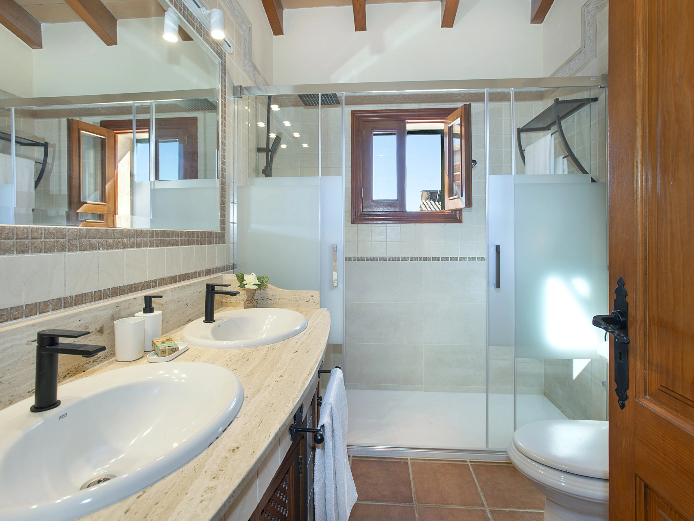 Alle Schlafzimmer sind mit Klimaanlage für warme und kalte Luft ausgestattet. Im Einklang mit lokalen Energieeinsparungsinitiativen verfügt die Villa über zeitgesteuerte Klimaanlagen für alle Einheiten von 21 Uhr bis 8 Uhr und von 14 Uhr bis 16 Uhr. Zwei geräumige Familienbäder, eines mit eigenem Bad mit Badewanne und Dusche, das andere mit Dusche, befinden sich nebeneinander.