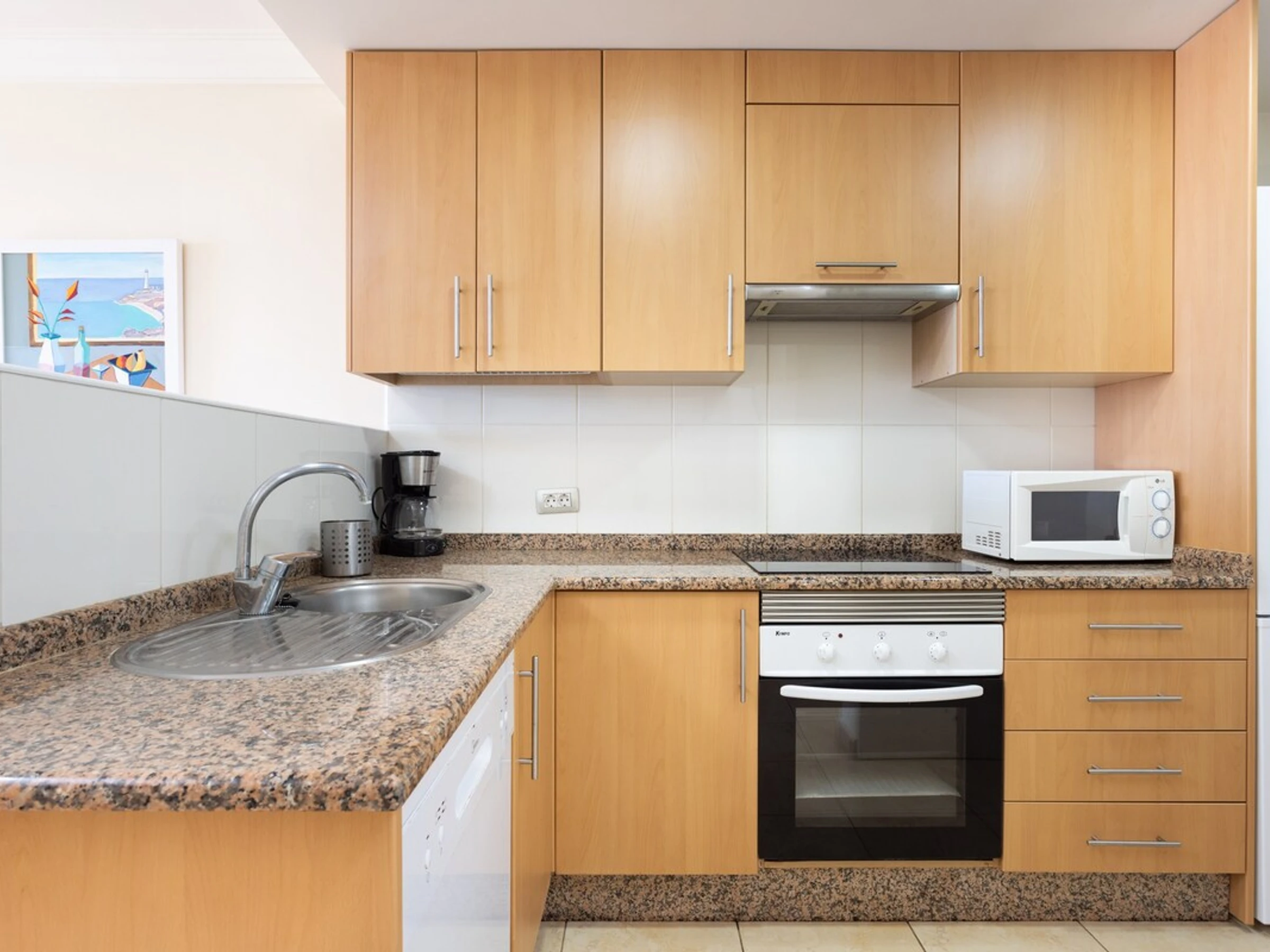 Dieses küche, ist ausgestattet in mikrowelle, backofen, spülmaschine, kochutensilien und kaffeemaschine.