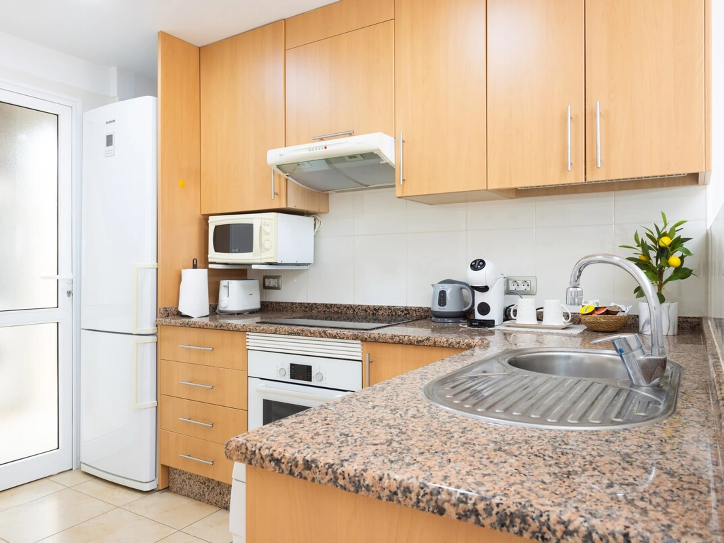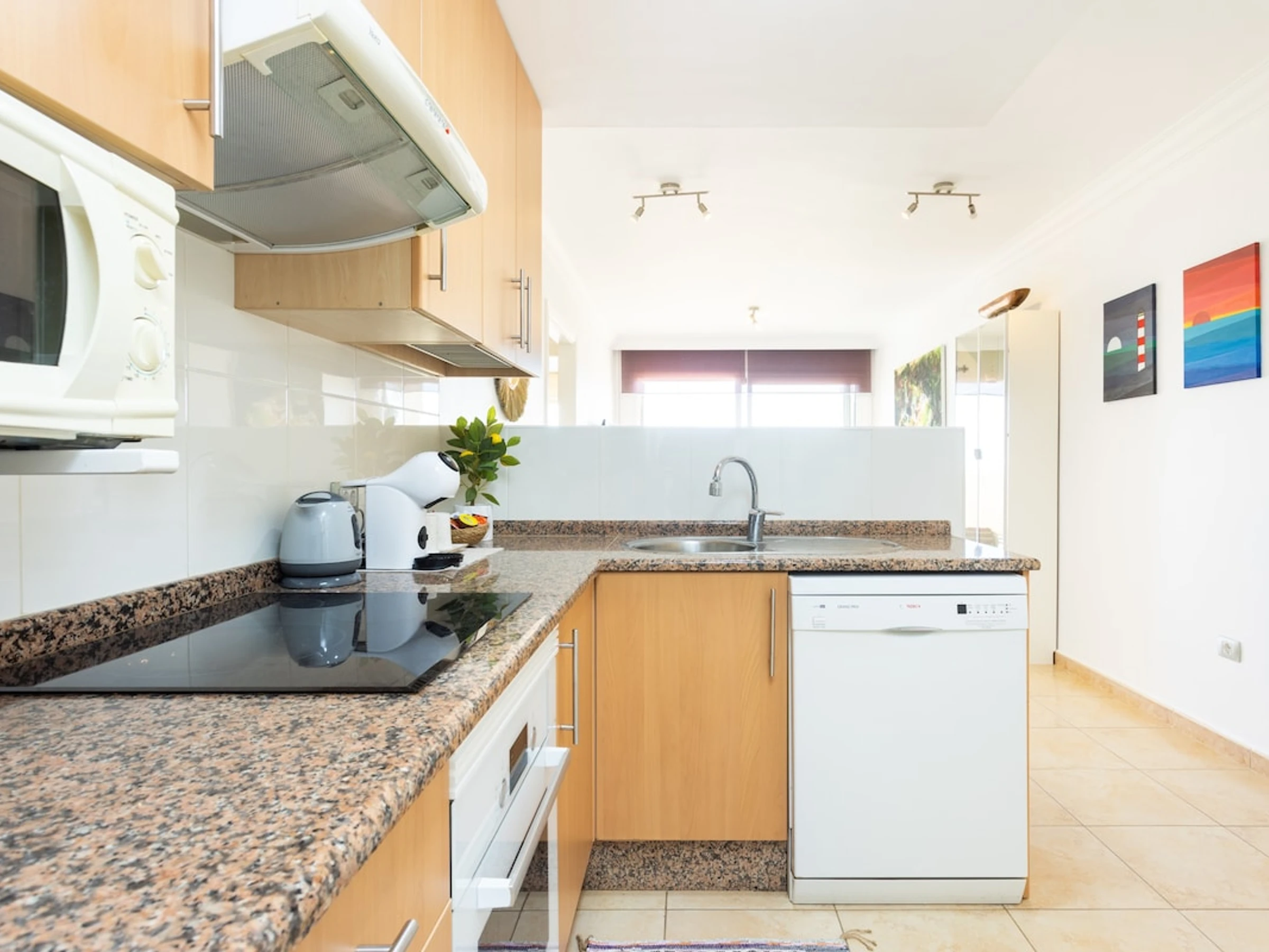 Dieses küche, ist ausgestattet in mikrowelle, backofen, spülmaschine, kochutensilien und kaffeemaschine.