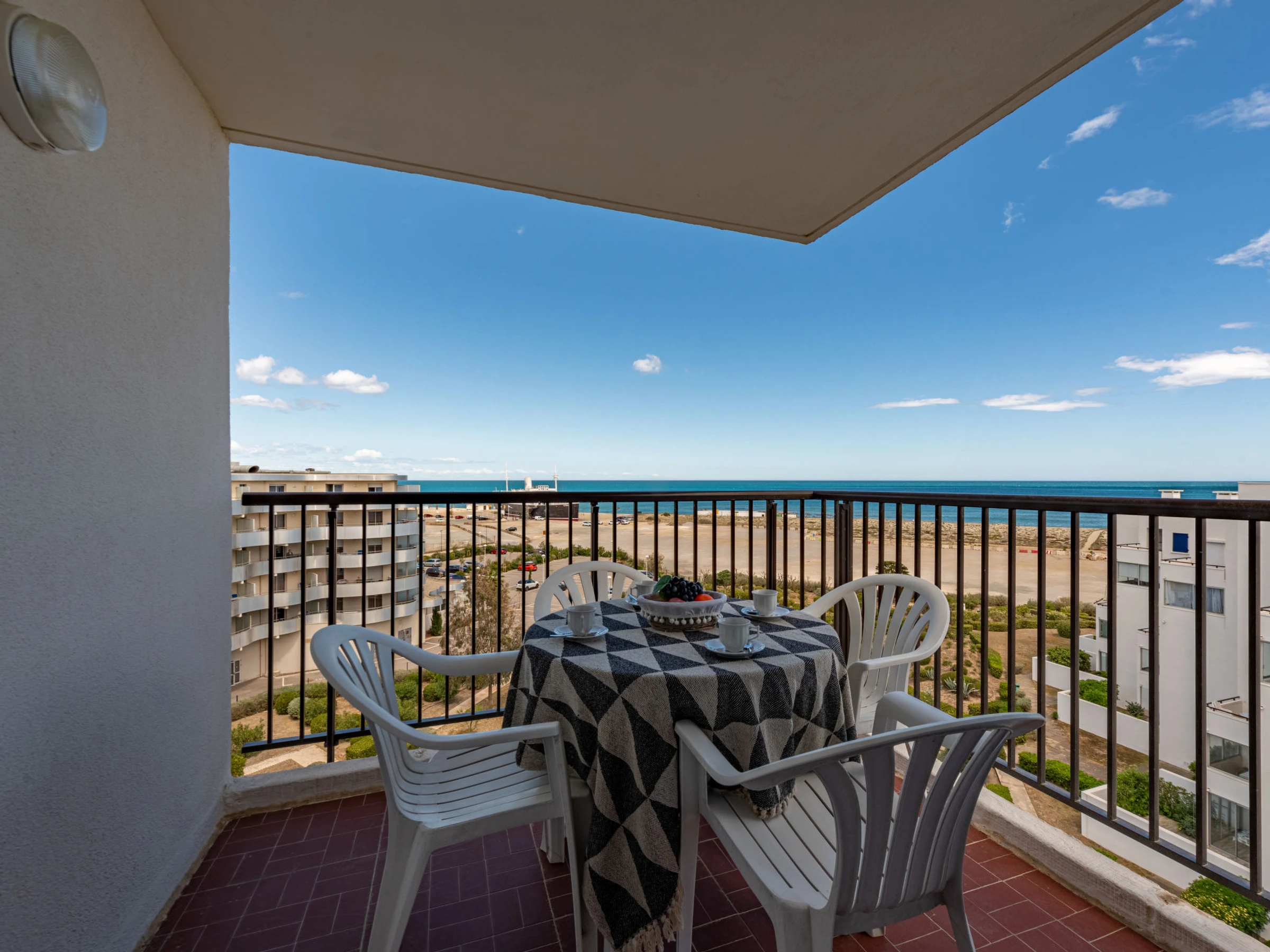 2-Zimmer-Wohnung 35 m2 im 6. Stock. Schön eingerichtet: Wohn-/Esszimmer mit 1 Doppeldiwanbett (140 cm), TV und E-Heizofen. Ausgang zur Terrasse. 1 Zimmer mit 1 franz. Bett (140 cm). Küche (2 Kochplatten, Backofen, Mikrowelle, Tiefkühler). Bad, sep. WC. Terrasse 6 m2. Terrassenmöbel. Sehr schöne Sicht auf das Meer. Zur Verfügung: Waschmaschine. Internet (Wireless LAN, extra). Parkplatz. Bitte beachten: Rauchmelder.