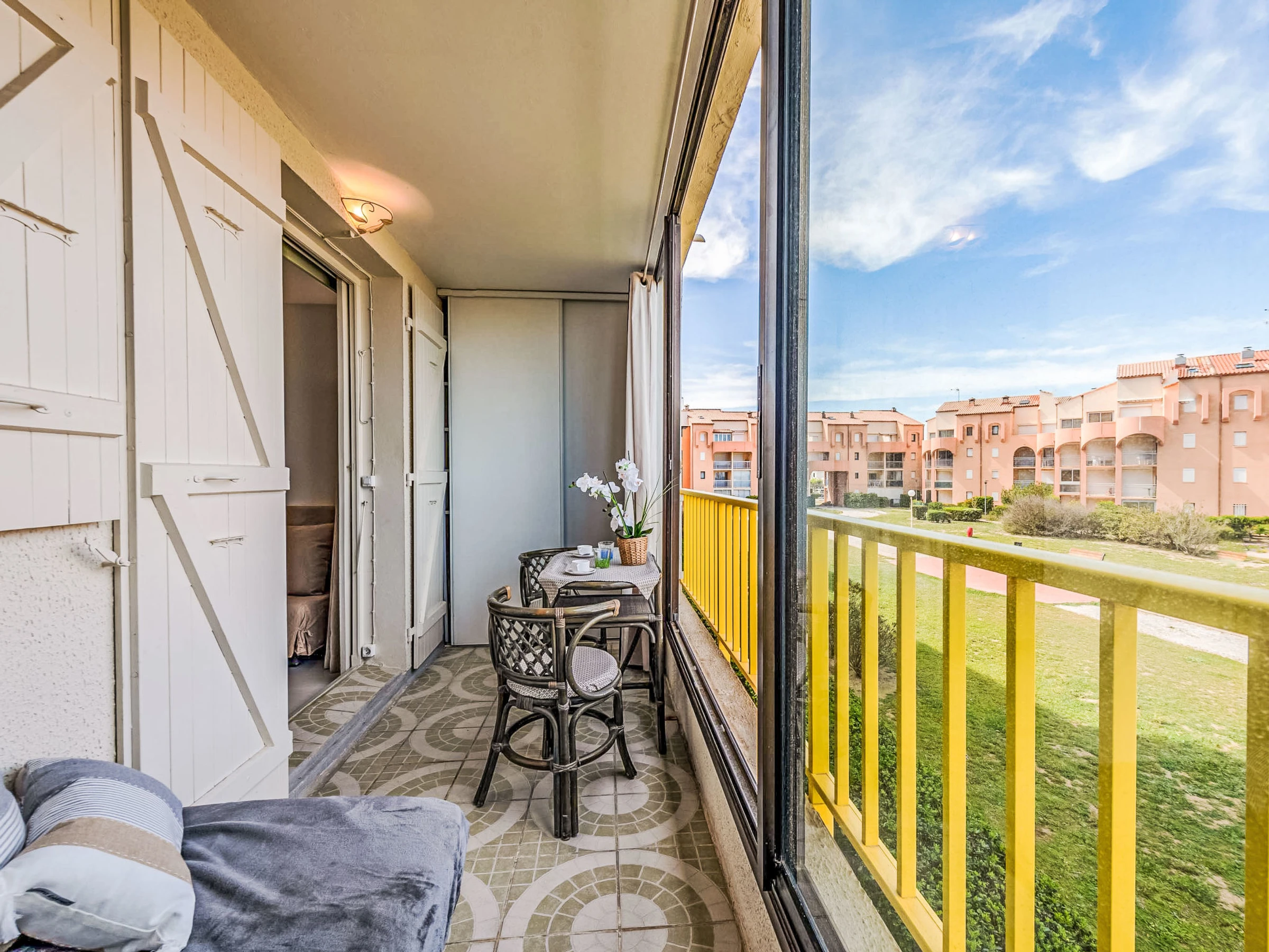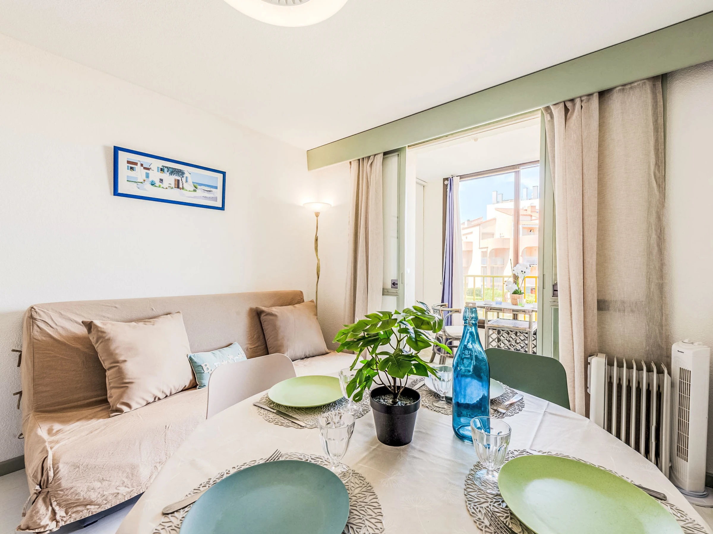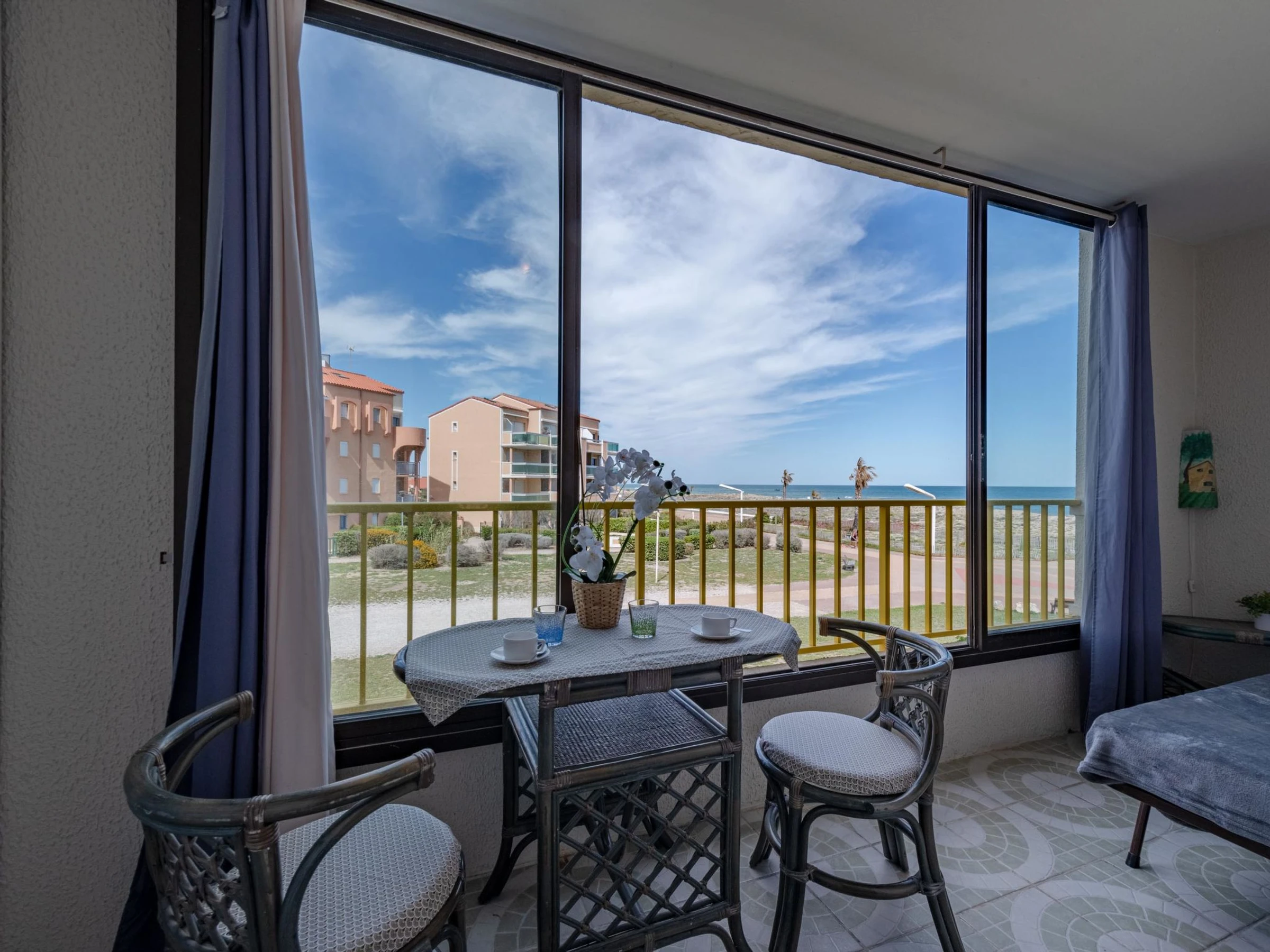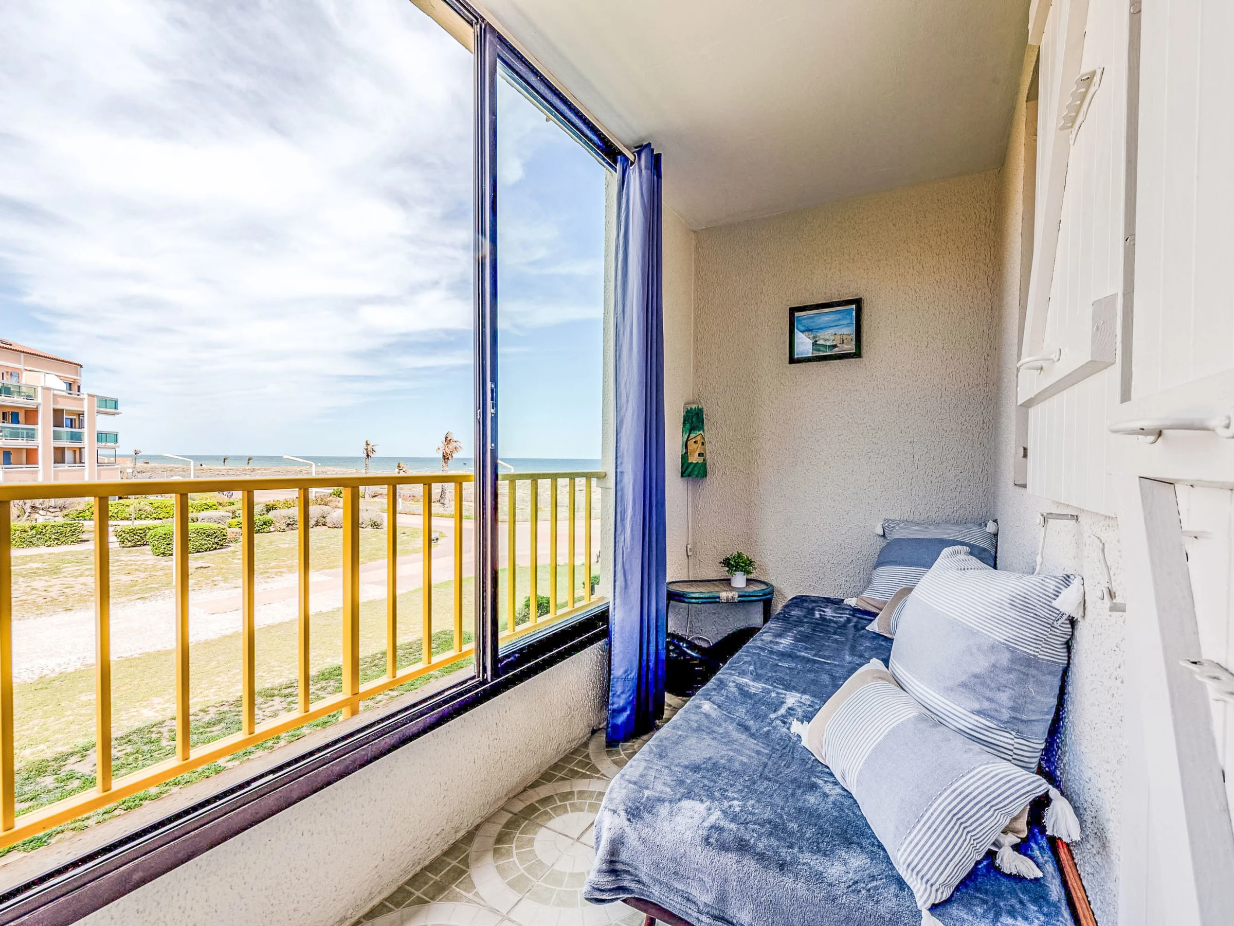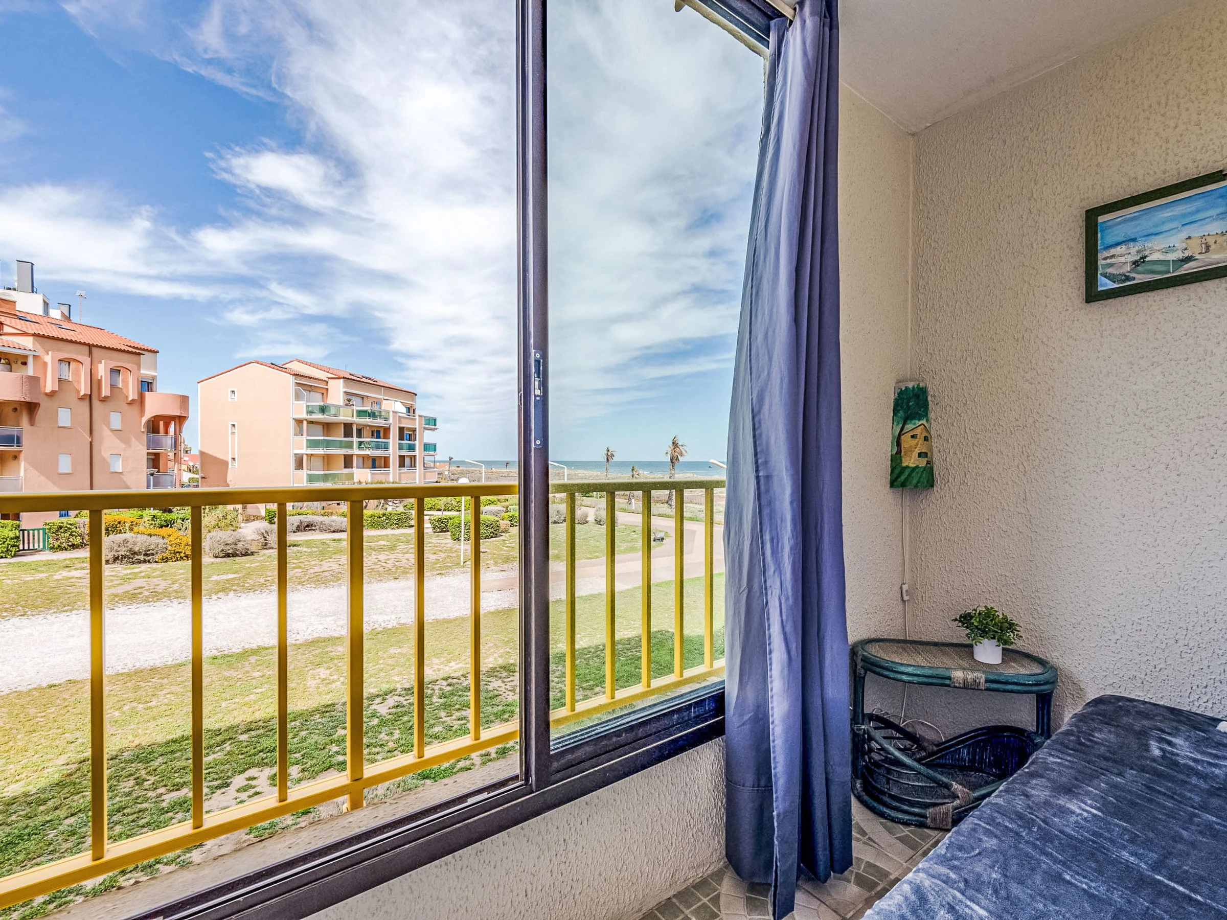 Residenz "Palm Beach", auf 3 Stockwerken. 300 Wohnungen in der Residenz. Im Ortsteil La Grande Plage, 100 m vom Meer, 100 m vom Strand. Öffentliche Parkplätze 150 m. Einkaufsgeschäft, Lebensmittelgeschäft, Einkaufszentrum, Restaurant, Bar, Café, Fahrradverleih 150 m, Bushaltestelle "Les Marines" 650 m, Bahnstation "de la Franqui" 15 km. Sporthafen 4 km. Nahe gelegene Sehenswürdigkeiten: Aqualand Port Leucate 2 km, Réserve Africaine de Sigean 41 km, site des dosses 4 km, téléski nautique 5 km. Bekannte Seen in der Umgebung sind gut erreichbar: Etang de Leucate ou salses 8 km, Lac de Villeneuve de la Raho 28 km. Wandergebiete: Sentier du guetteur 8 km, la forteresse de salses 15 km, Sentier du littoral Collioure 40 km. Bitte beachten: Weitere Unterkünfte sind buchbar.