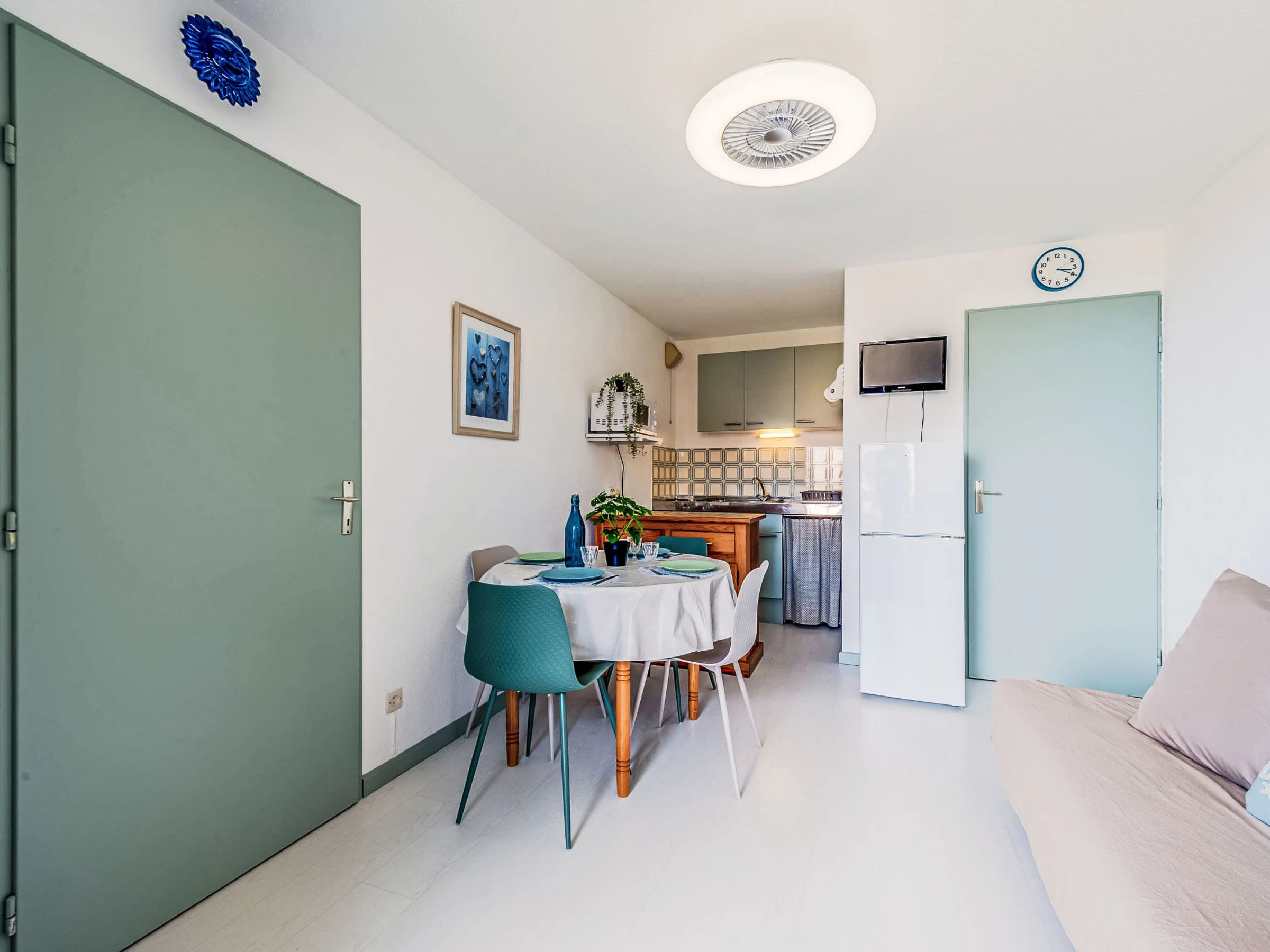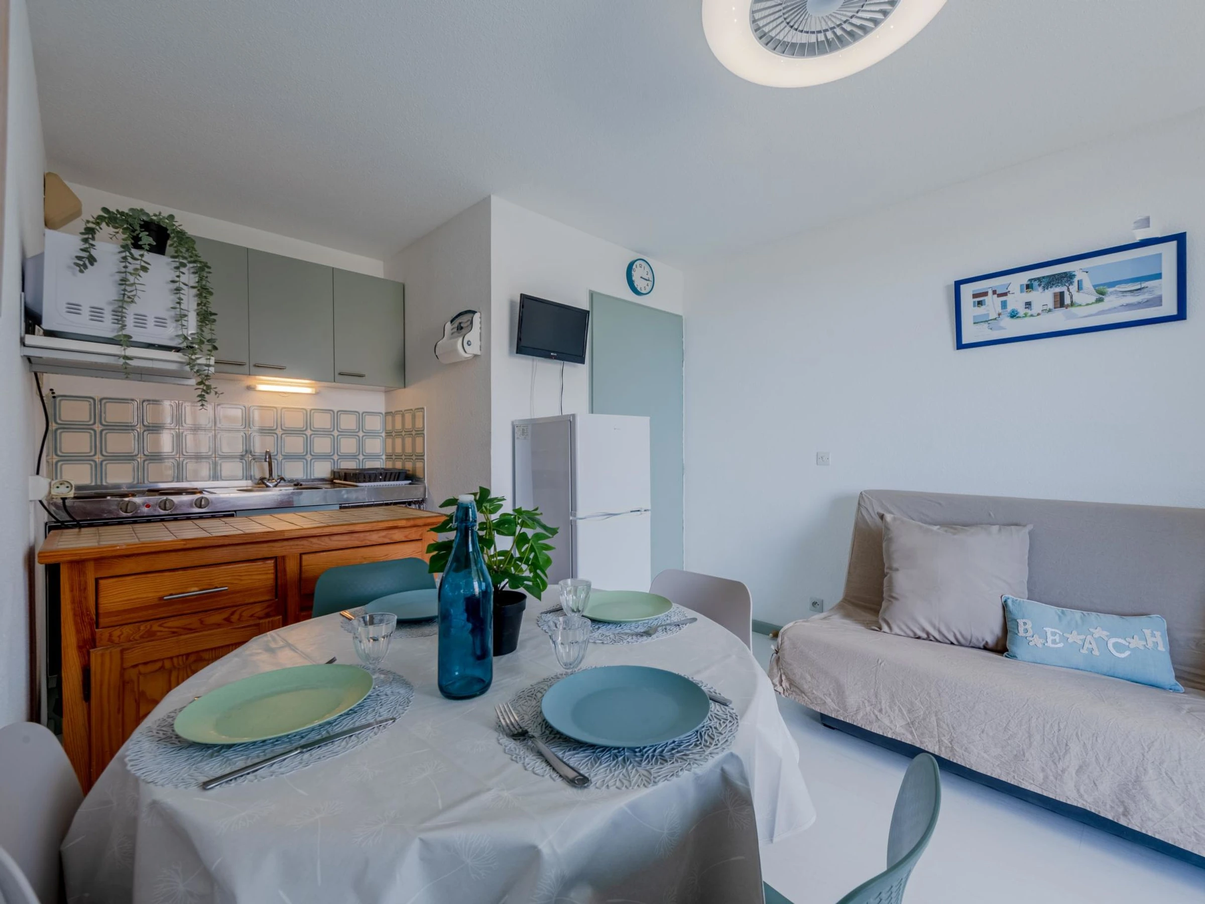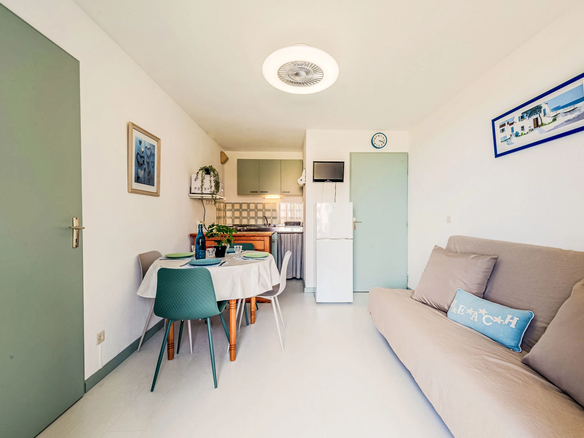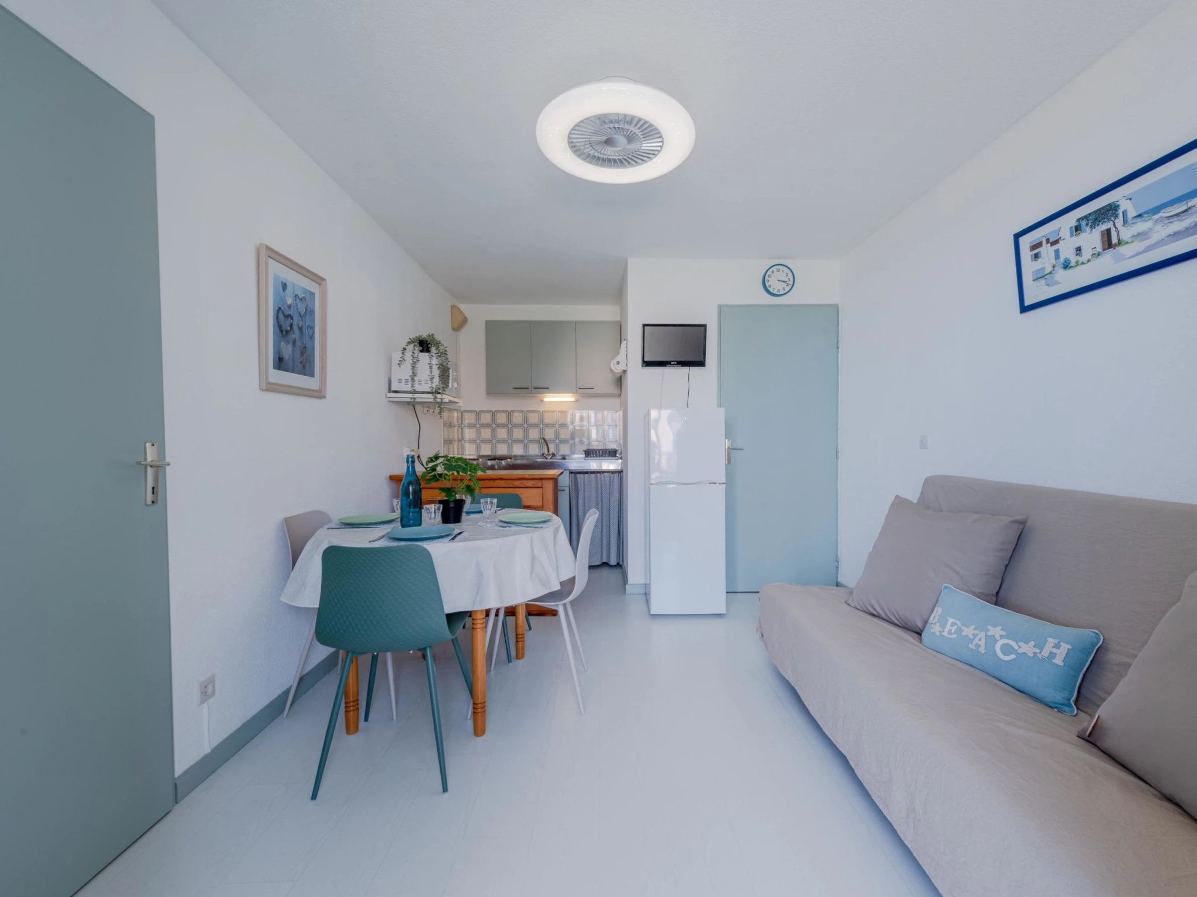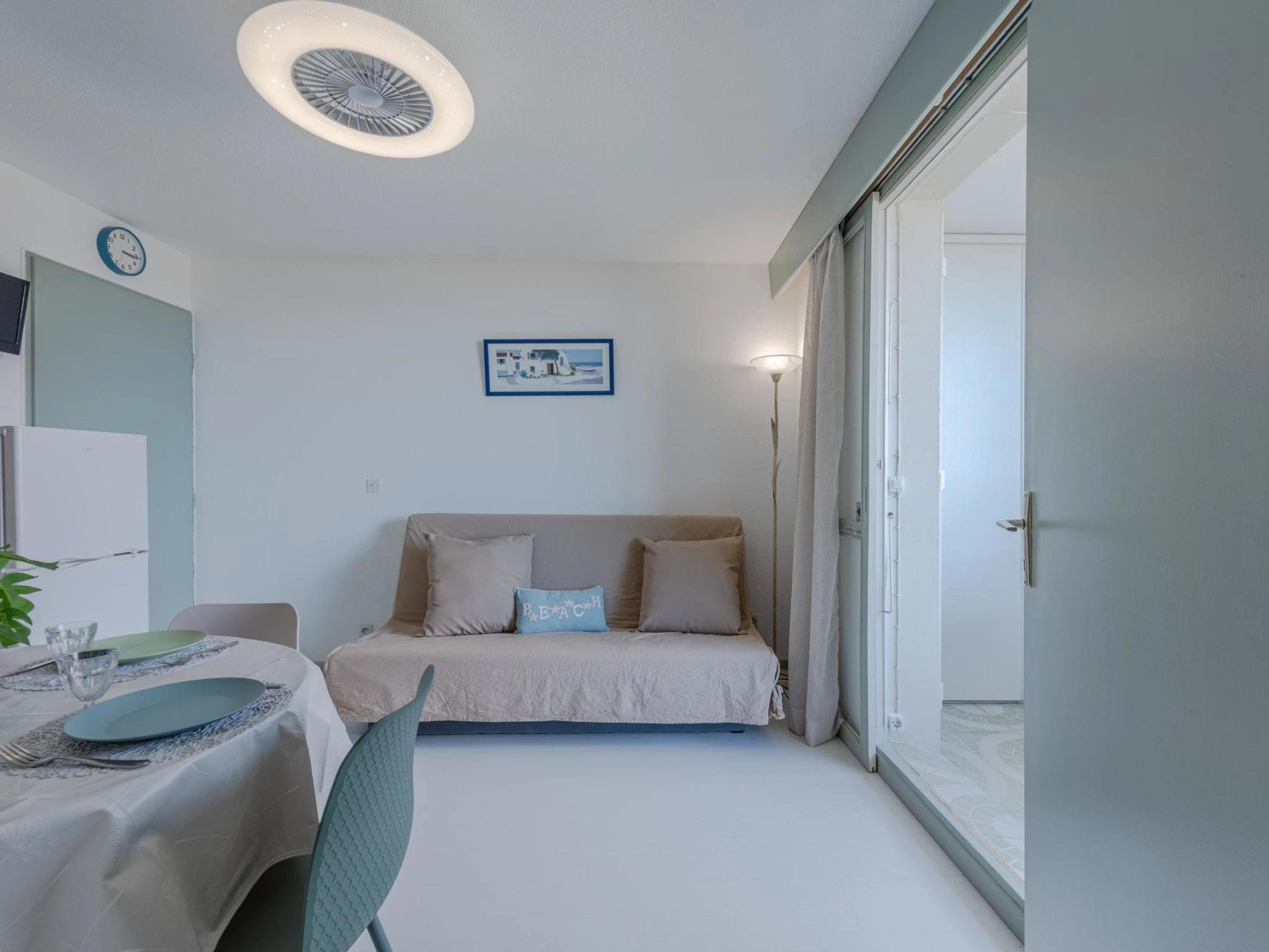 Residenz "Palm Beach", auf 3 Stockwerken. 300 Wohnungen in der Residenz. Im Ortsteil La Grande Plage, 100 m vom Meer, 100 m vom Strand. Öffentliche Parkplätze 150 m. Einkaufsgeschäft, Lebensmittelgeschäft, Einkaufszentrum, Restaurant, Bar, Café, Fahrradverleih 150 m, Bushaltestelle "Les Marines" 650 m, Bahnstation "de la Franqui" 15 km. Sporthafen 4 km. Nahe gelegene Sehenswürdigkeiten: Aqualand Port Leucate 2 km, Réserve Africaine de Sigean 41 km, site des dosses 4 km, téléski nautique 5 km. Bekannte Seen in der Umgebung sind gut erreichbar: Etang de Leucate ou salses 8 km, Lac de Villeneuve de la Raho 28 km. Wandergebiete: Sentier du guetteur 8 km, la forteresse de salses 15 km, Sentier du littoral Collioure 40 km. Bitte beachten: Weitere Unterkünfte sind buchbar.