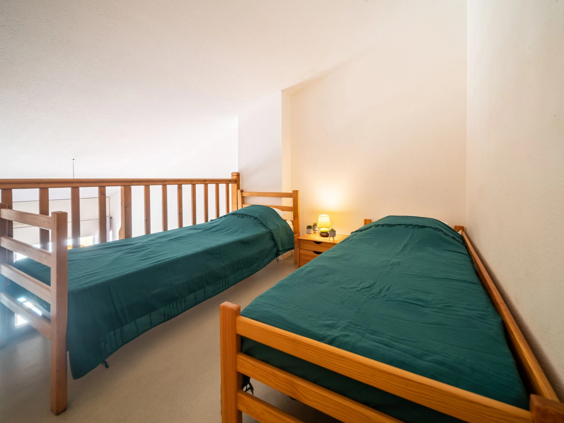 2-Zimmer-Wohnung 39 m2 im 3. Stock, Südlage. Zweckmässig eingerichtet: abgeschrägtes Wohn-/Esszimmer mit 1 Doppeldiwanbett (1 x 140 cm, Länge 190 cm), TV (Flachbildschirm). Ausgang zur Terrasse. 1 Zimmer mit 2 Betten (90 cm, Länge 190 cm). Offene Küche (4 Kochplatten, Backofen, Wasserkocher, Mikrowelle, elektrische Kaffeemaschine). Dusche/WC. E-Heizung. Obergeschoss: Galerie mit 2 Betten (90 cm, Länge 190 cm). Terrasse 10 m2, Südlage. Terrassenmöbel. Seitliche Sicht auf das Meer. Zur Verfügung: Bügeleisen. Internet (Wireless LAN, extra). Parkplatz Nr. 100. Bitte beachten: Rauchmelder. Anstelle eines abgeschlossenen Schlafzimmers befinden sich manche Schlafplätze in einem offenen Bereich (Galerie, Nische etc.).