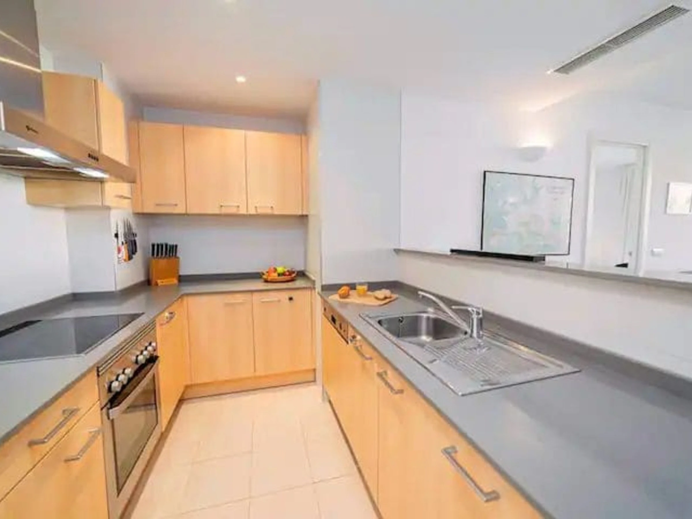 Dieses offene küche, mit ceranfeld, ist ausgestattet in kühlschrank, mikrowelle, backofen, gefrierschrank, spülmaschine, geschirr/besteck, kochutensilien, kaffeemaschine, toaster, wasserkocher und saftpresse.