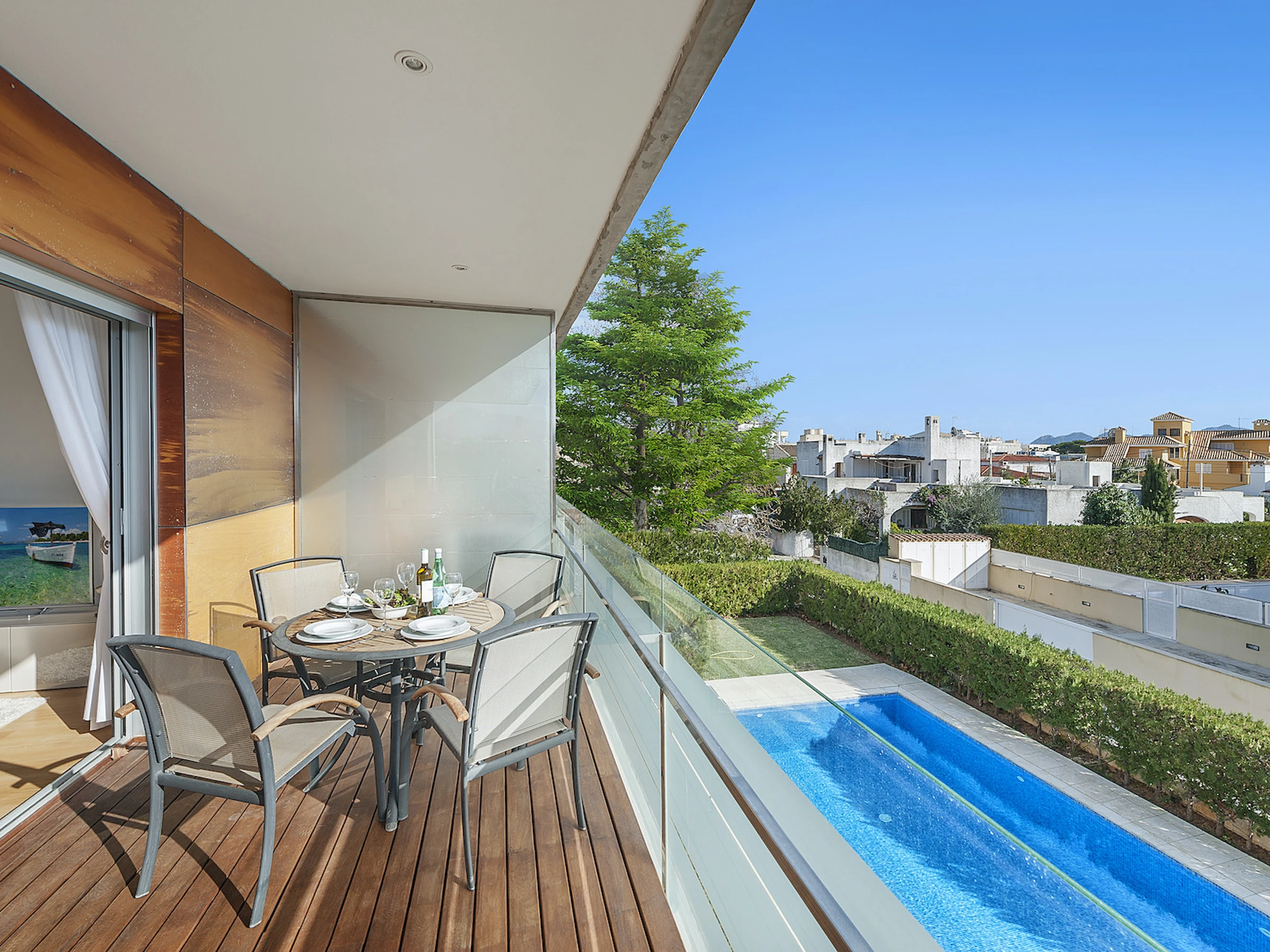 Die Unterkunft verfügt über aufzug, garten, umzäuntes grundstück, terrasse, waschmaschine, bügeleisen/-brett, safe, internet (WLAN), haartrockner, balkon, whirlpool, heizung, klimaanlage, swimming-pool gemeinschaftlicher swimming-pool, überdachter parkplatz in auf dem grundstück, 1 Fernseher, sat-tv (Sprachen: Spanisch, Englisch, Deutsch).